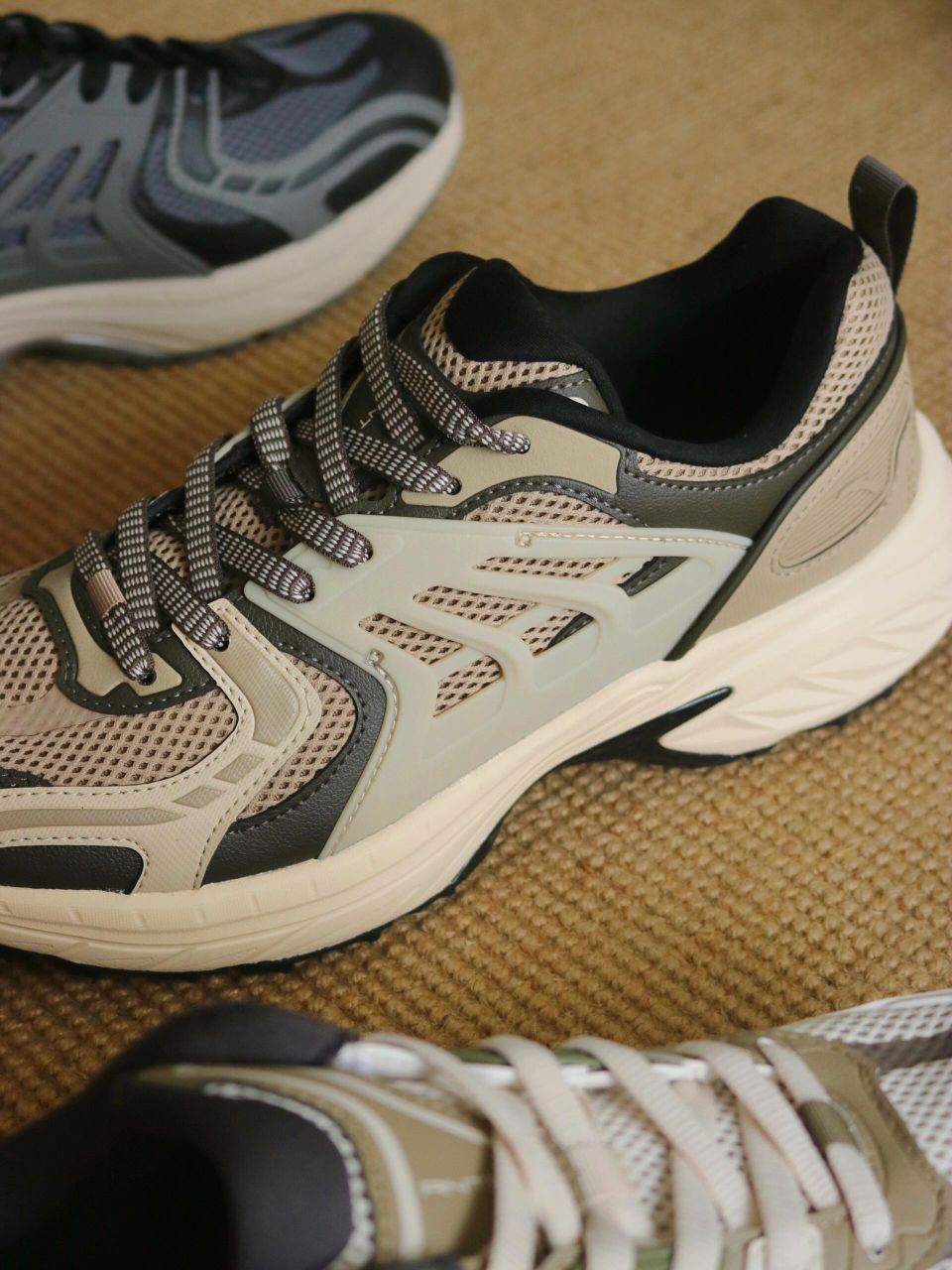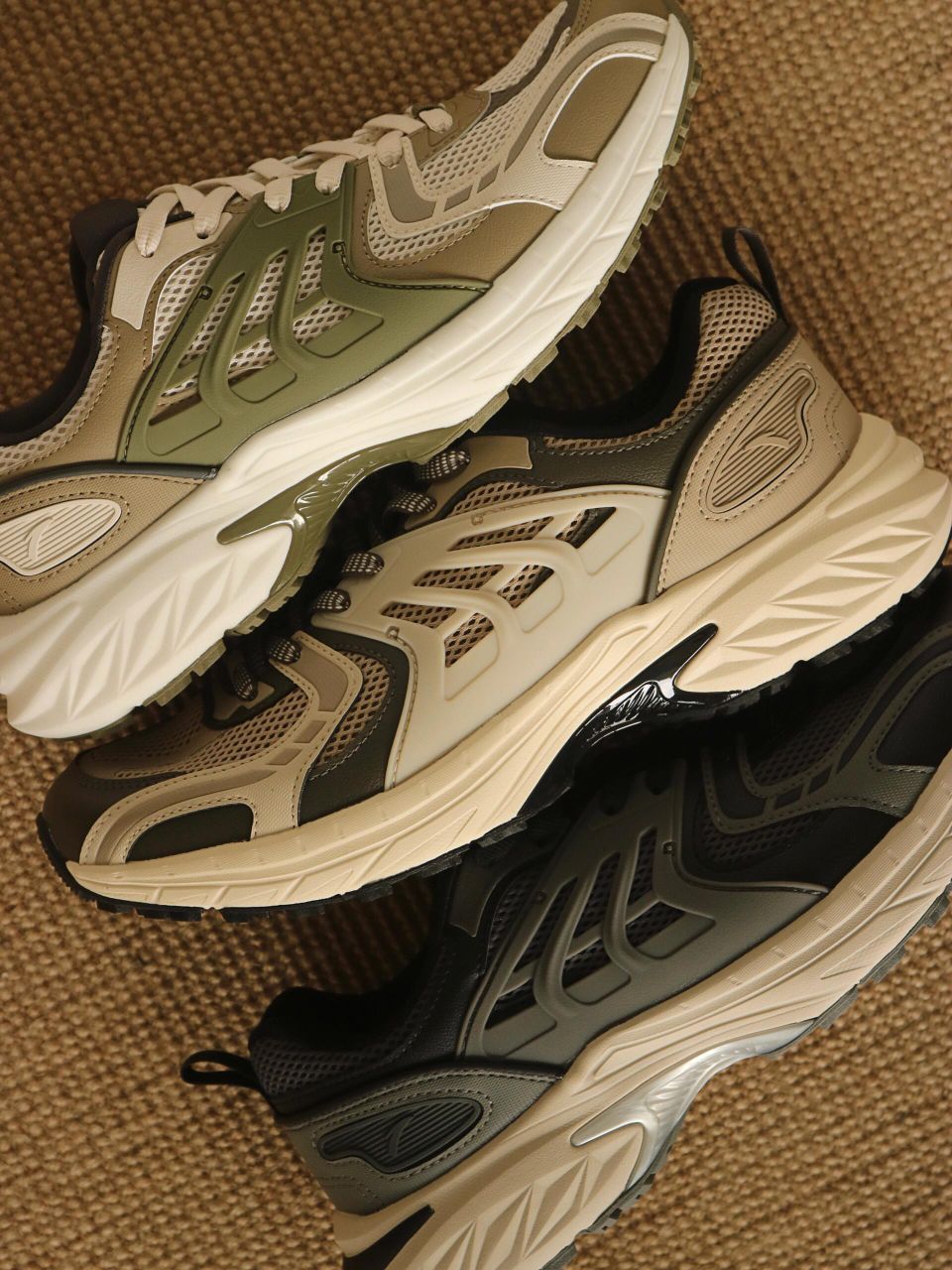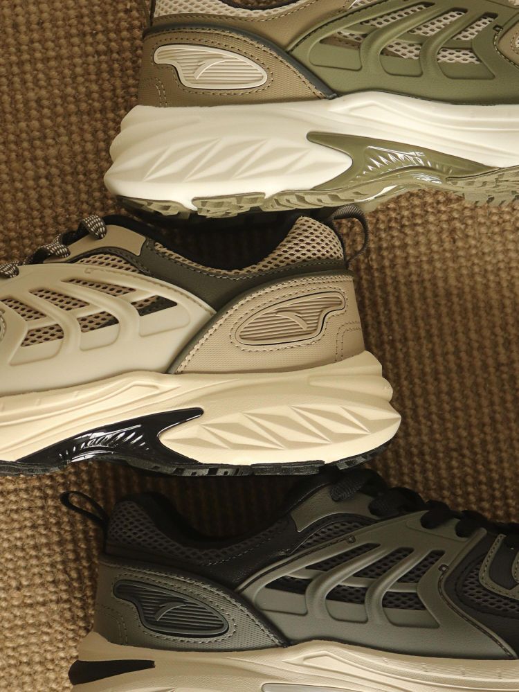 这款跑鞋浓浓复古户外风,军绿泥沙色,烟灰色,火山 灰,硬汉气质拉满 鞋身由皮革,TPU,透气网面组合,透气不闷热。