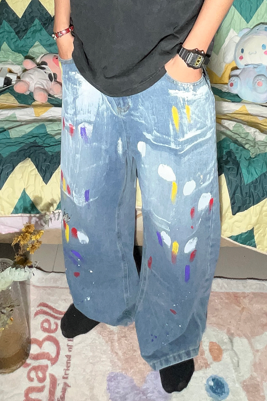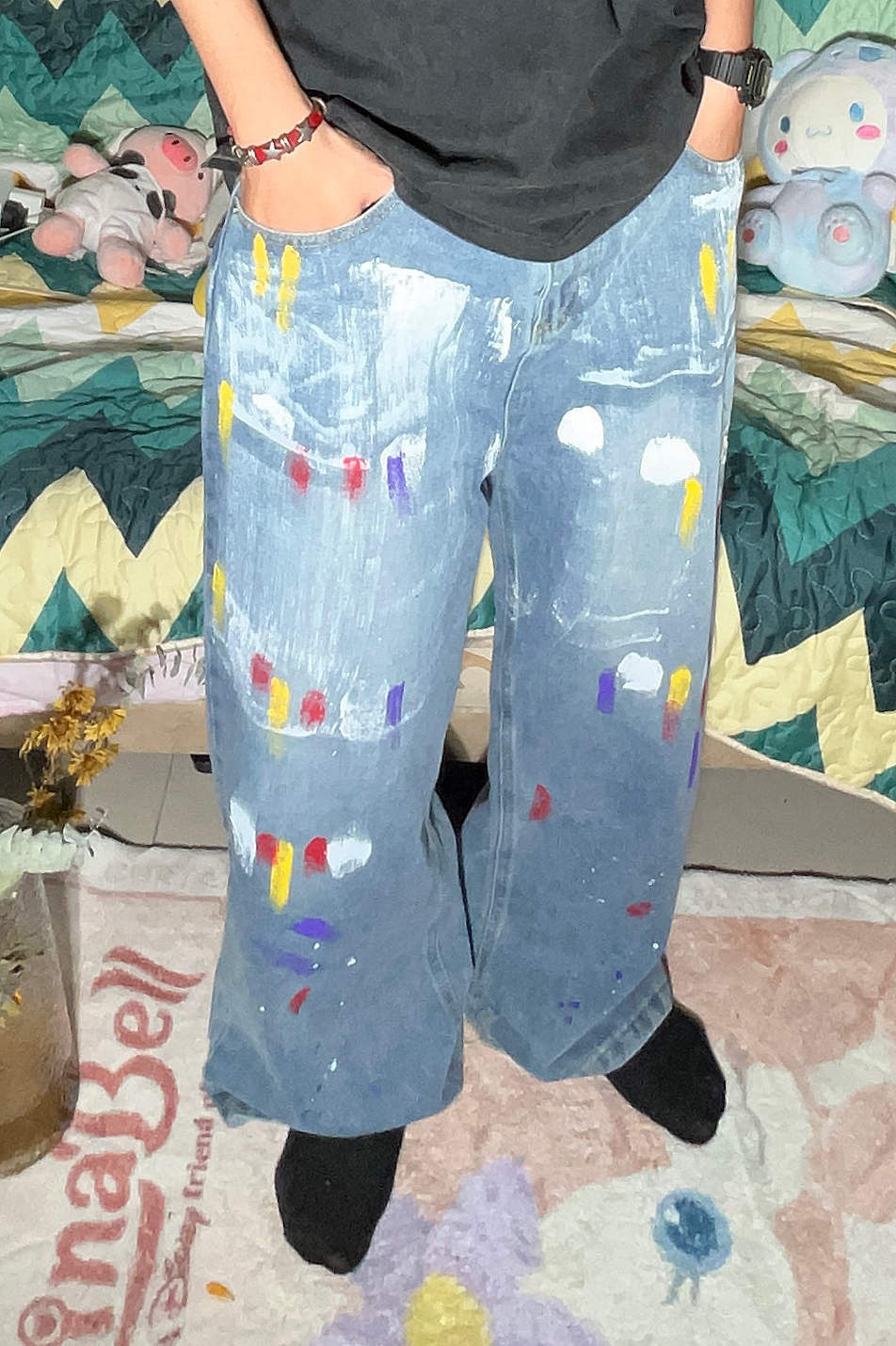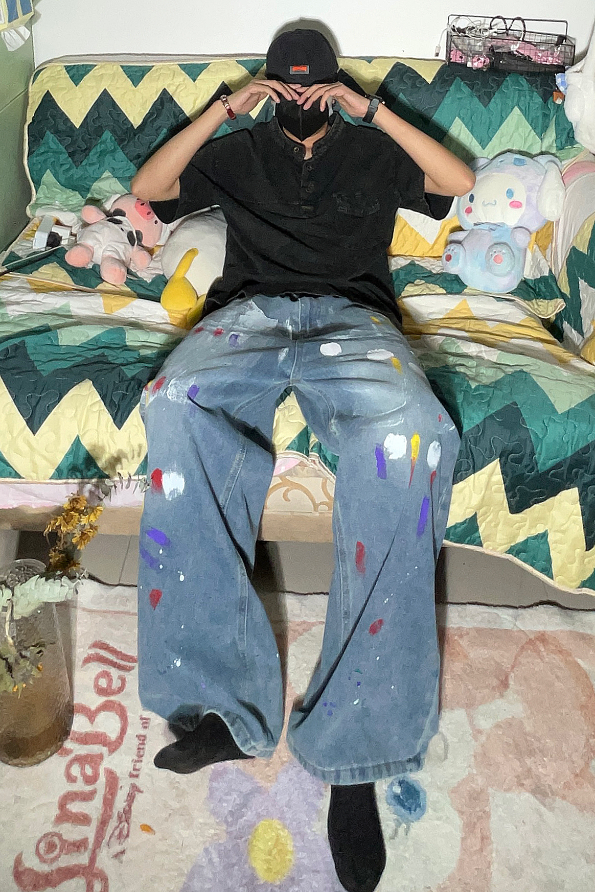 今天分享的宝藏裤子是一条涂鸦的阔腿牛仔裤 这是一条青春,少年,花哨,但不花里胡哨的裤子 涂鸦在牛仔裤上呈现并不会让人觉得很突兀并且少年的青春感拉满很适合在充满活力的春夏季节穿搭 同时上衣搭配黑色的水洗T,整体就不会过于元素丰富比较协调。