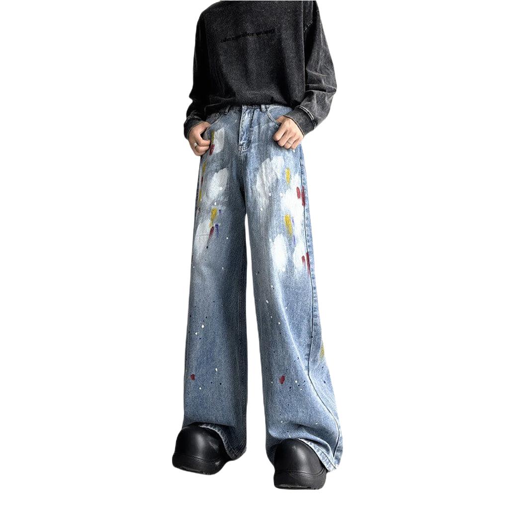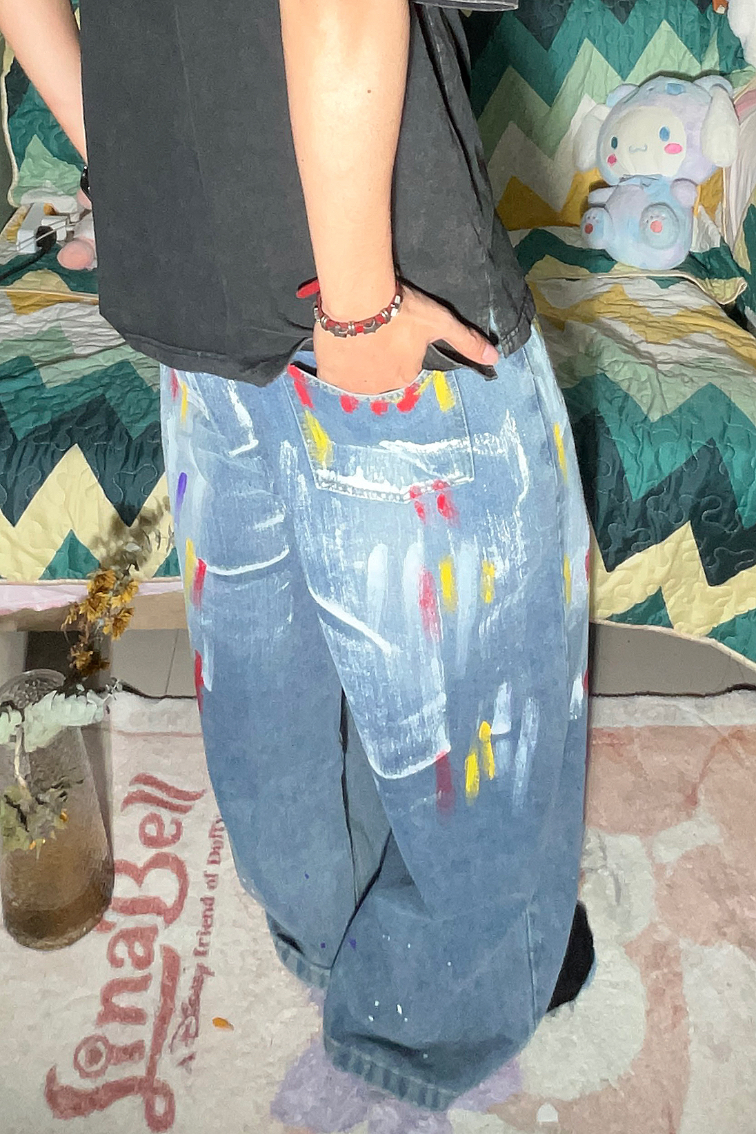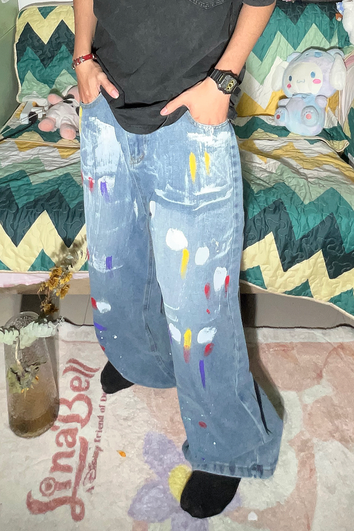 今天分享的宝藏裤子是一条涂鸦的阔腿牛仔裤 这是一条青春,少年,花哨,但不花里胡哨的裤子 涂鸦在牛仔裤上呈现并不会让人觉得很突兀并且少年的青春感拉满很适合在充满活力的春夏季节穿搭 同时上衣搭配黑色的水洗T,整体就不会过于元素丰富比较协调。