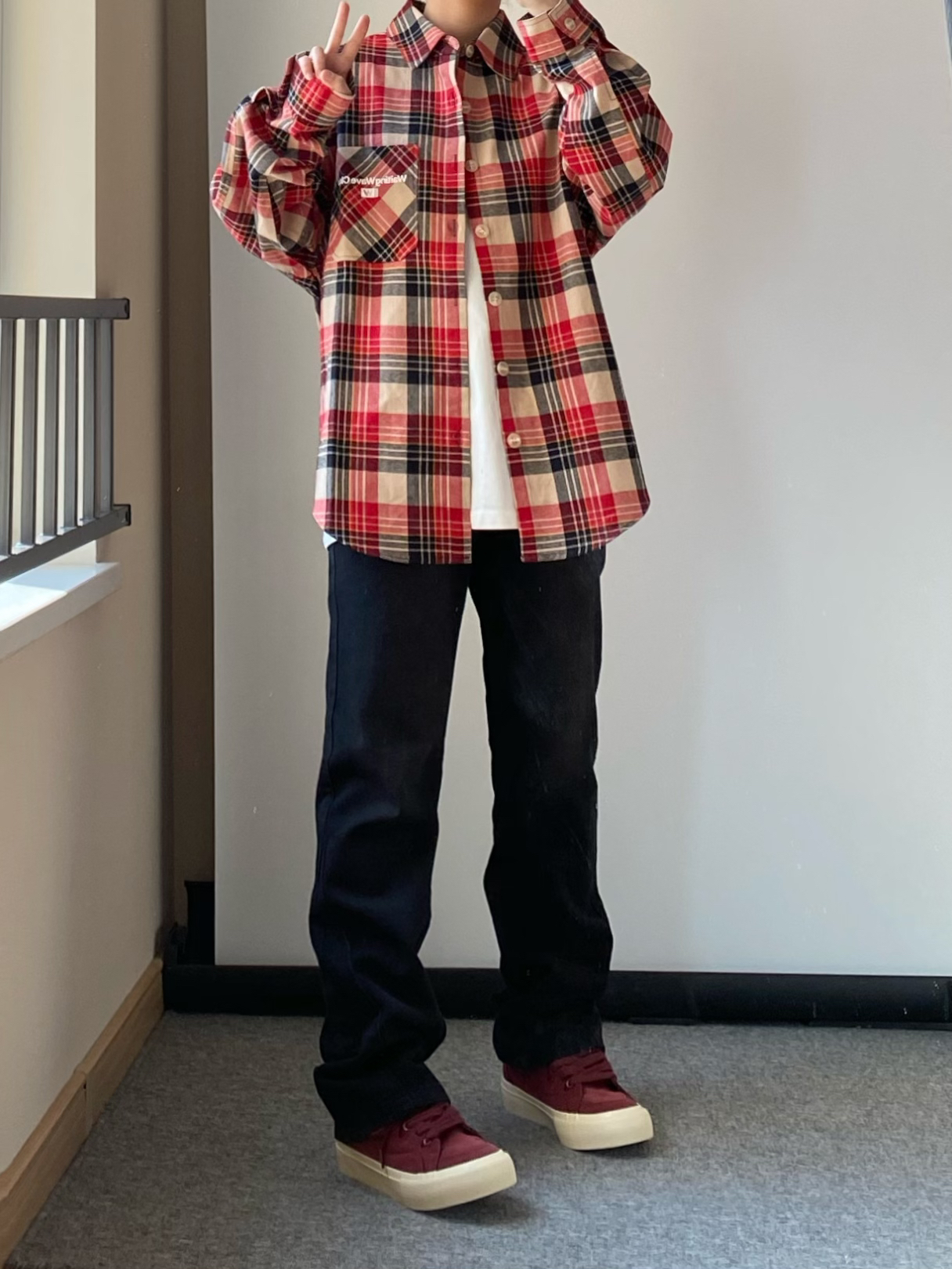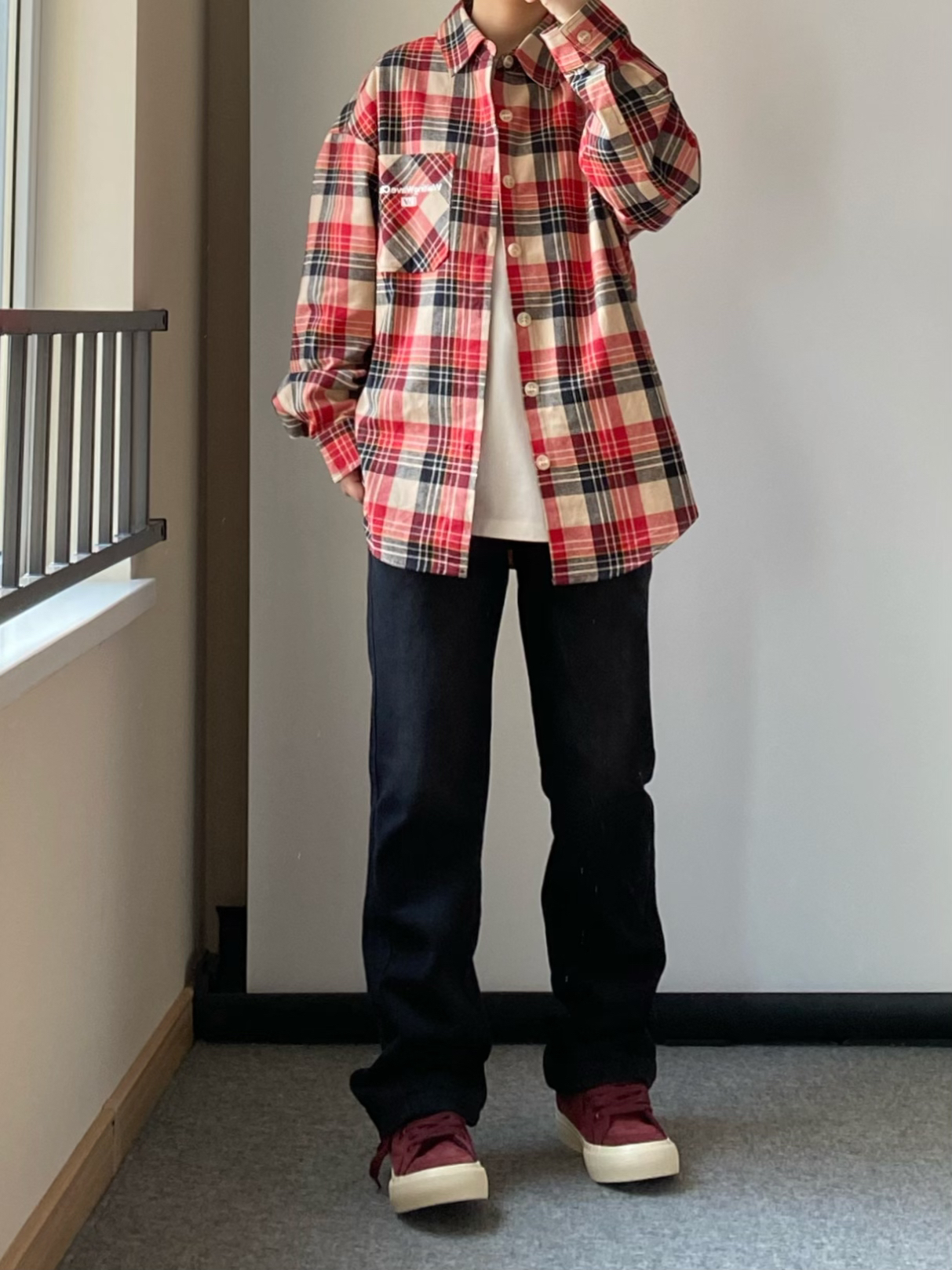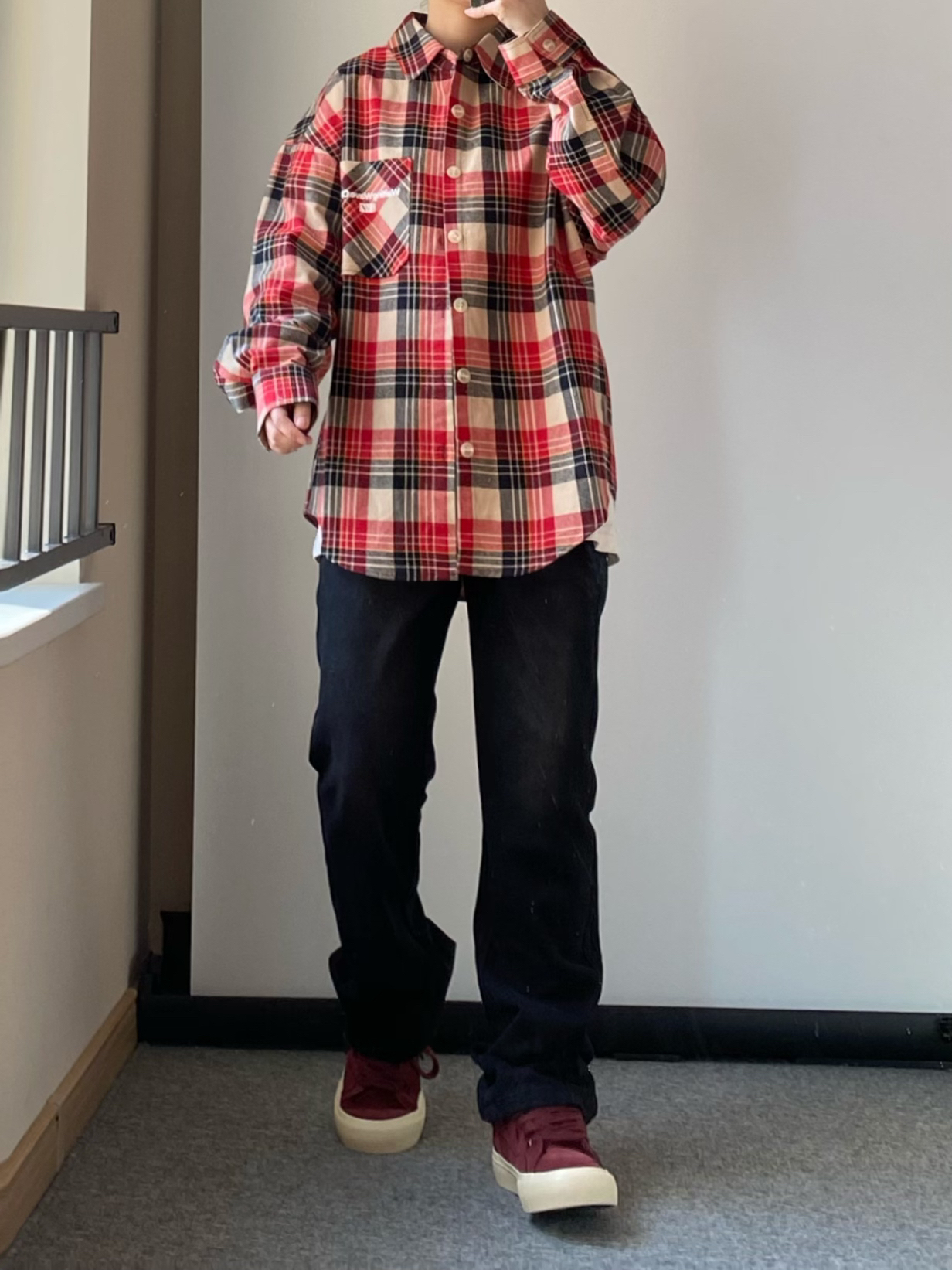 春天谁还没有一件格子衬衫~ 👔上身一件少年感十足的红色格子衬衫 衣服偏厚实像外套一样的厚度宽松简单干净又不失帅气!! 👖来一条做旧黑色的直筒牛仔裤 高街长裤版型百搭又不显腿粗! 可以修饰腿型显的腿细 日常出勤上学这样穿就很不错! 鞋子还得是我这双酒红色小板鞋啦