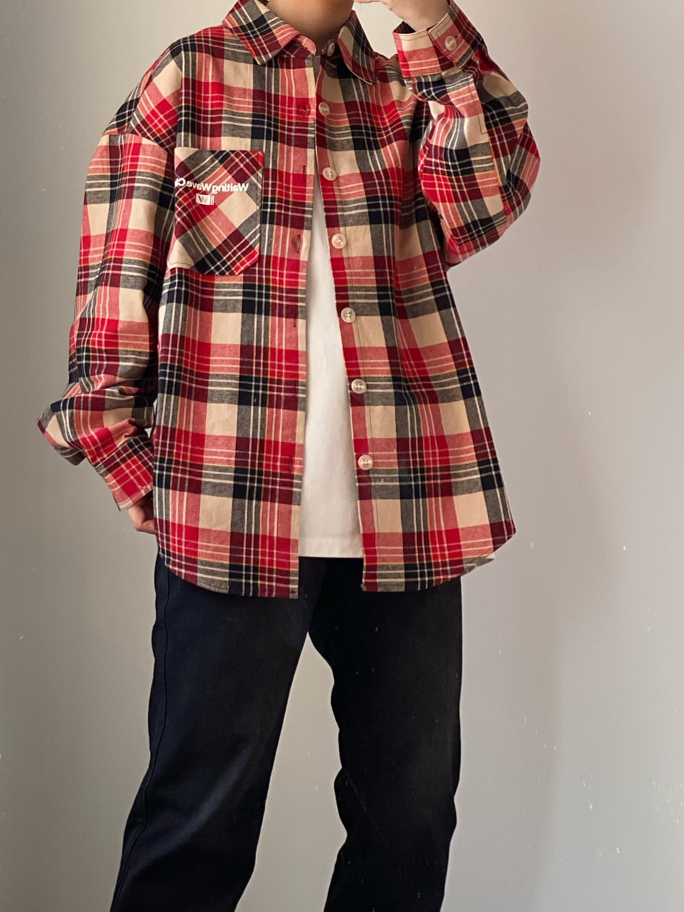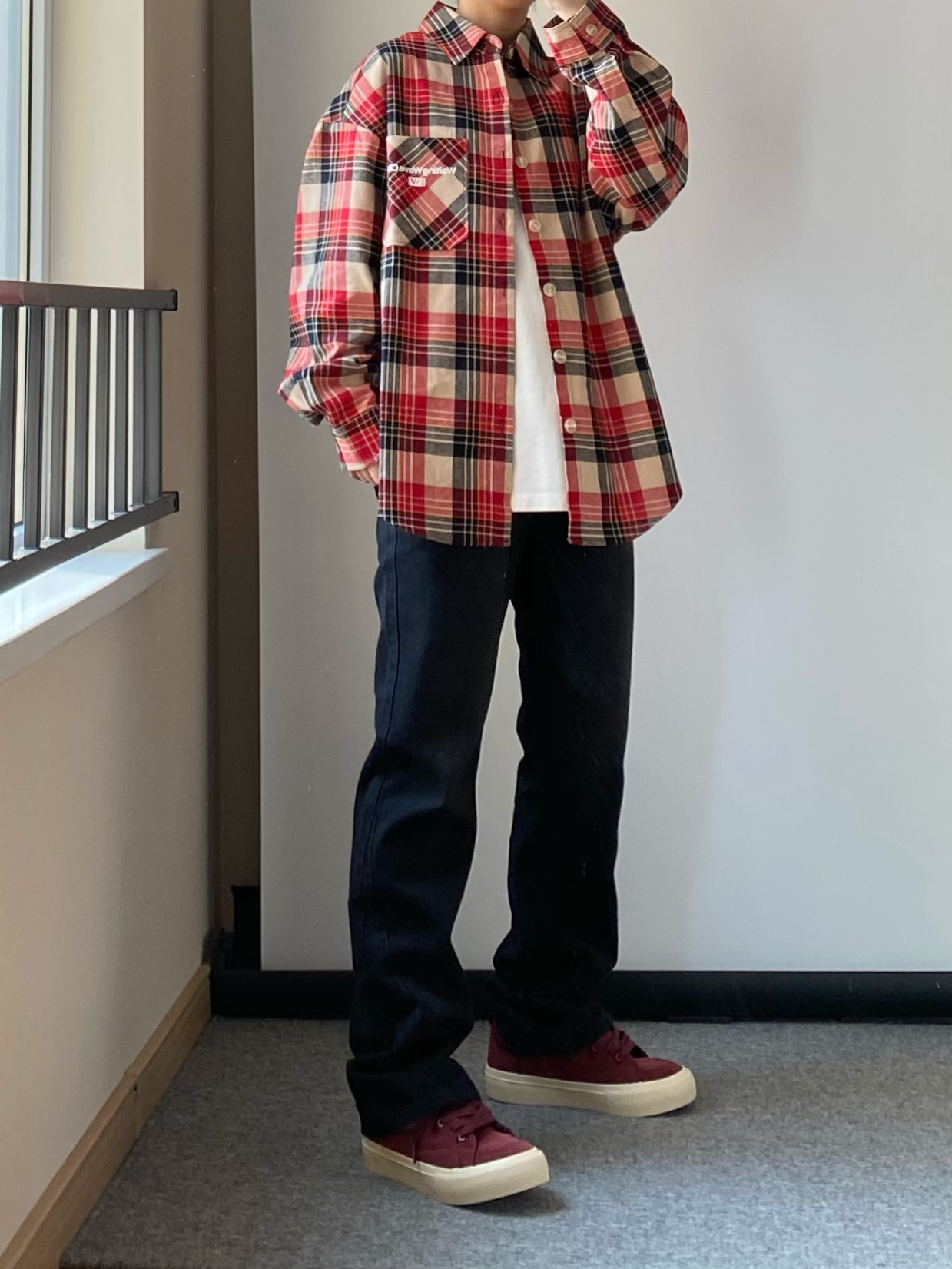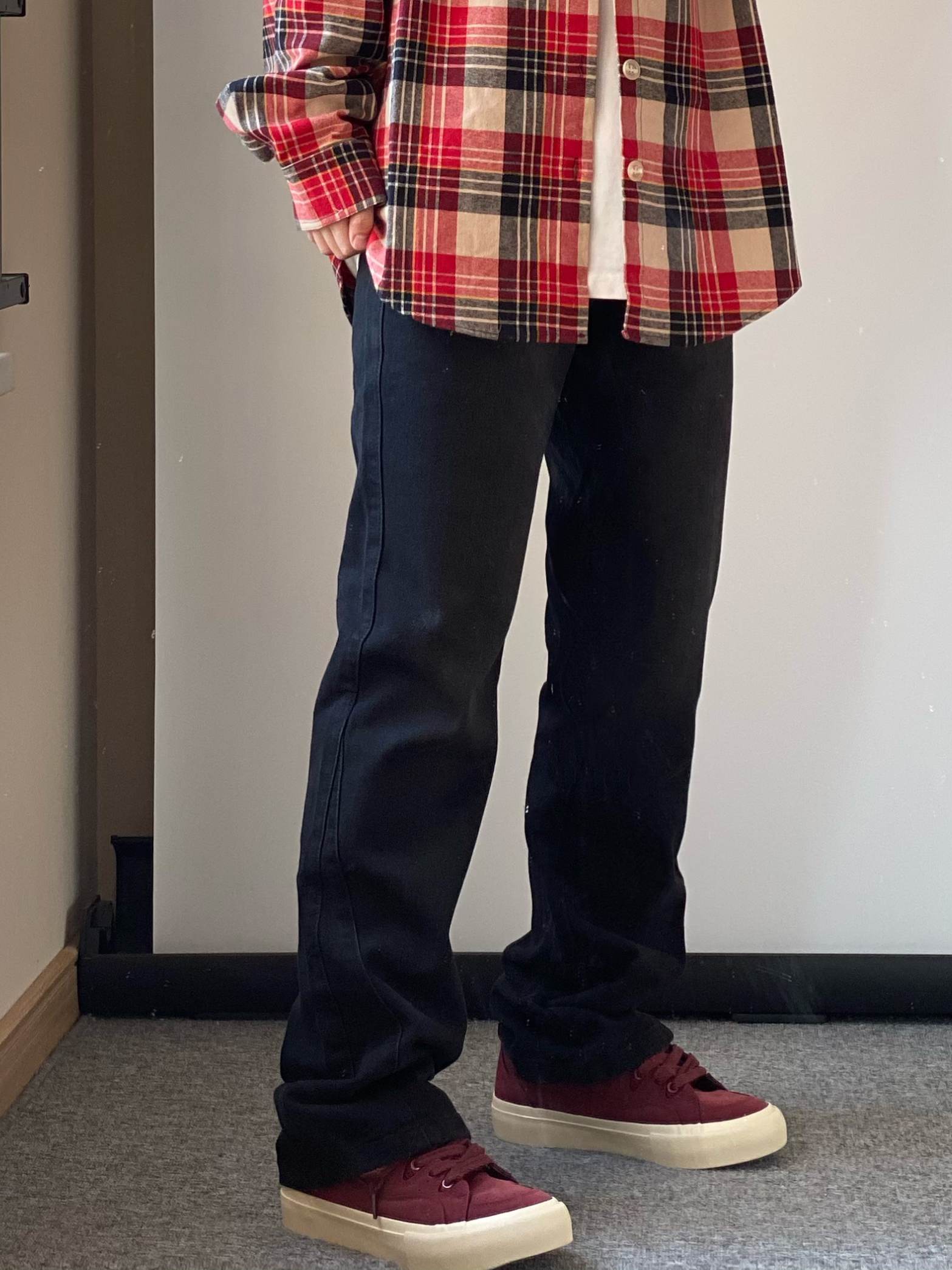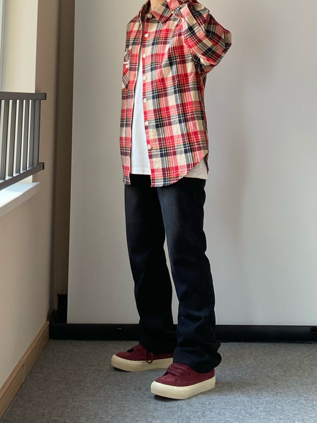 春天谁还没有一件格子衬衫~ 👔上身一件少年感十足的红色格子衬衫 衣服偏厚实像外套一样的厚度宽松简单干净又不失帅气!! 👖来一条做旧黑色的直筒牛仔裤 高街长裤版型百搭又不显腿粗! 可以修饰腿型显的腿细 日常出勤上学这样穿就很不错! 鞋子还得是我这双酒红色小板鞋啦