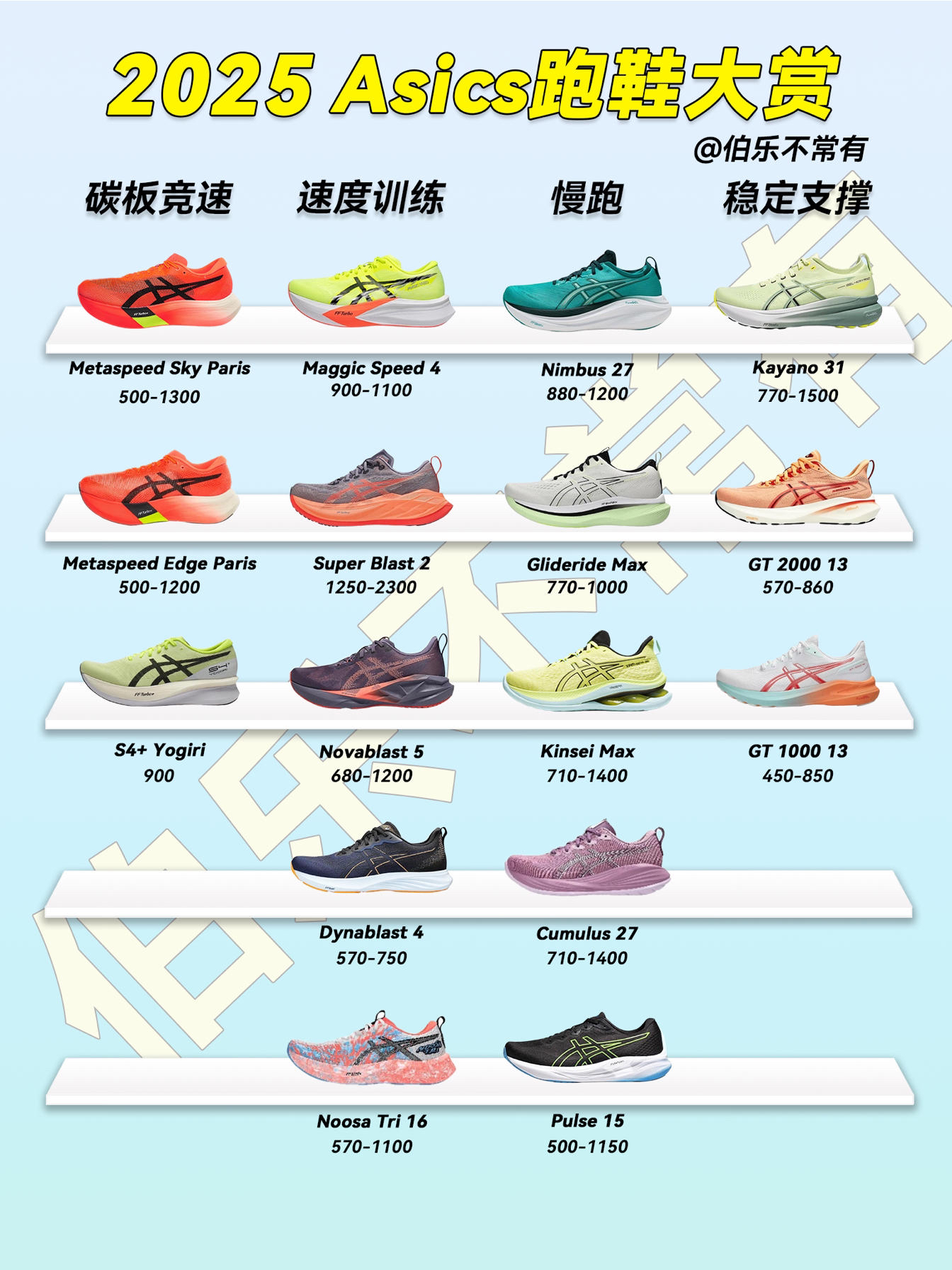 继Nike、Adidas、Hoka、Puma 4个品牌的2025跑鞋大赏后,本期给大家带来四大跑鞋大赏! 下期给大家继续分享国产跑鞋,帮助大家迅速找到适合自己的跑鞋! 本期Asics亚瑟士、Saucony索康尼、New Balance、Brooks布鲁克斯,将他们的跑鞋,按照马拉松竞速、速度训练、有氧慢跑和针对扁平足、低足弓的稳定支撑4个场景区分。 Metaspeed paris SuperBl...