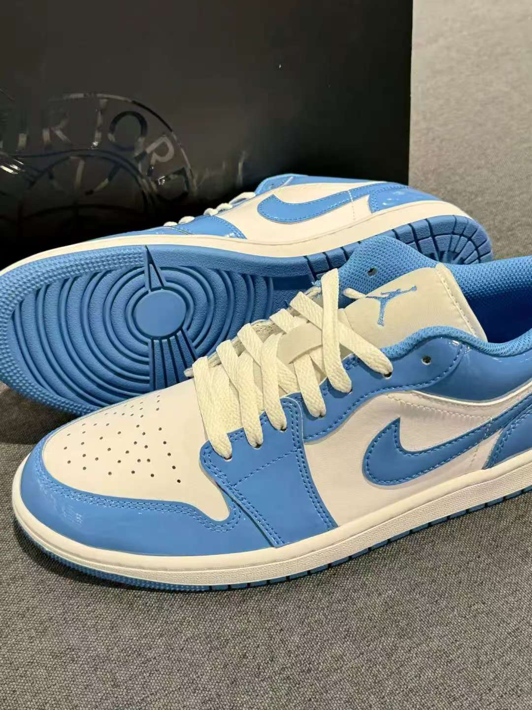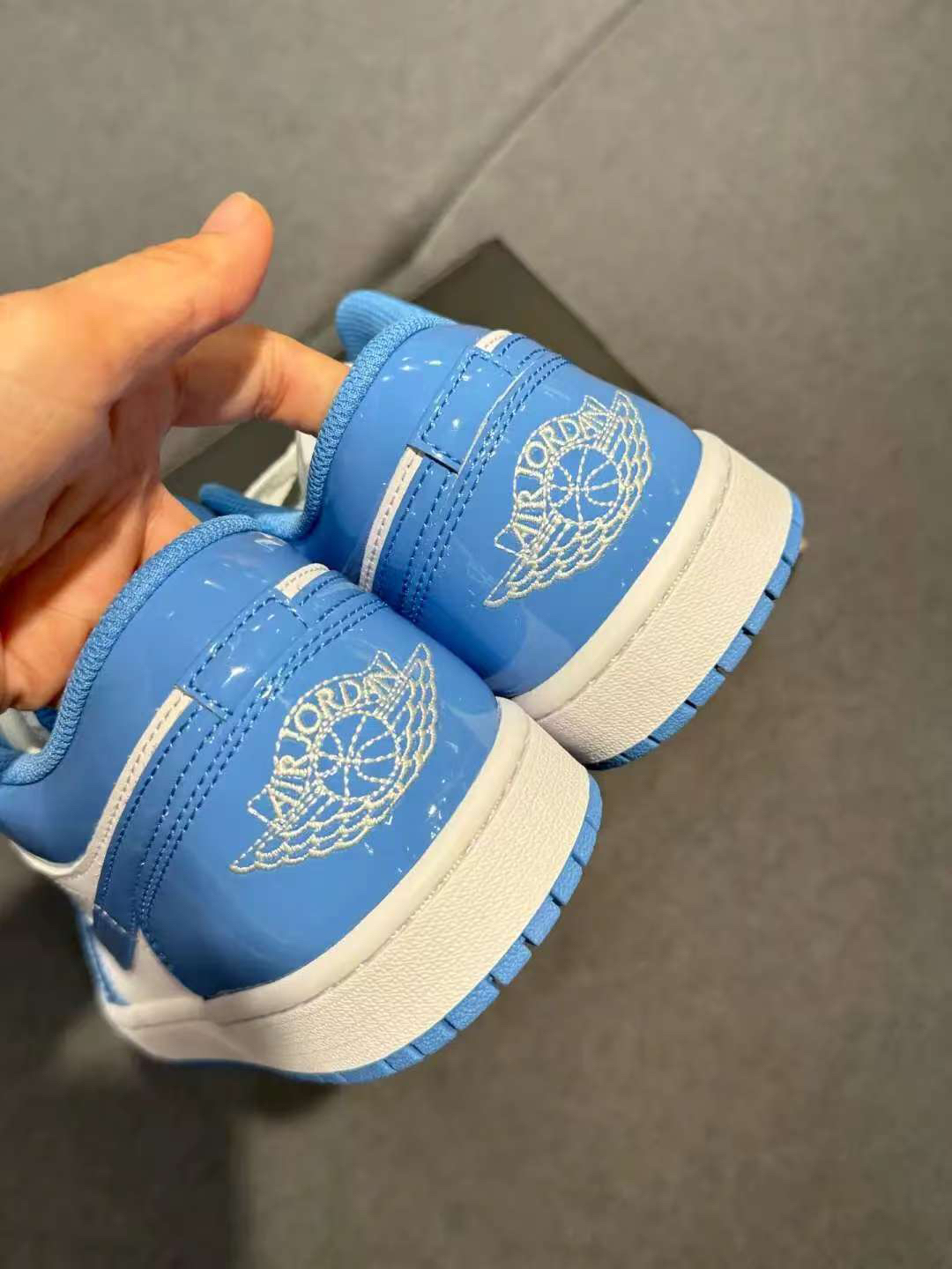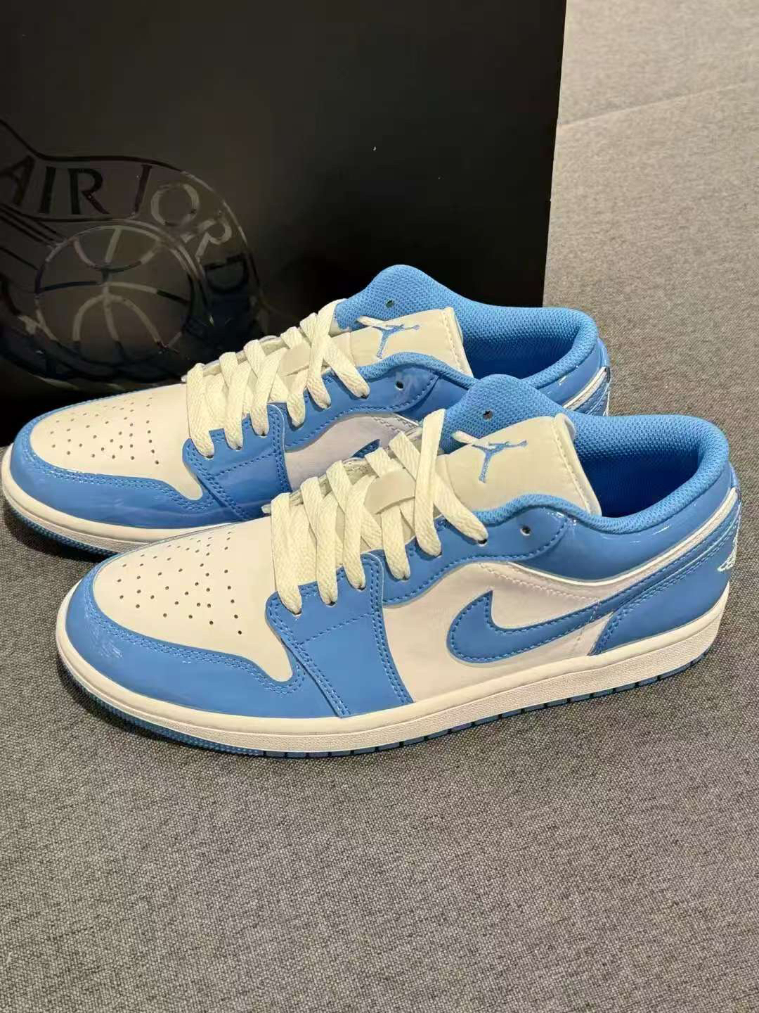 💙外观:白蓝撞色,清新亮眼,鞋身线条流畅,经典的飞人标志和 Nike Swoosh 标识,潮流感十足,怎么搭都很出挑。 👟材质:鞋面漆皮材质,质感满满,而且有一定防水性;内里透气网布,不闷脚,久穿也舒爽。 🧦脚感:鞋底缓震出色,走路轻盈,无论是日常通勤还是休闲逛街,都能轻松应对 。