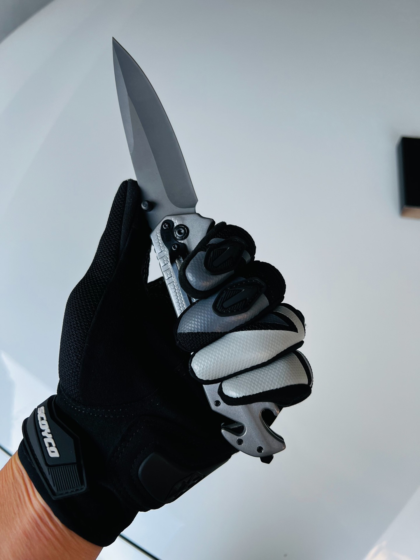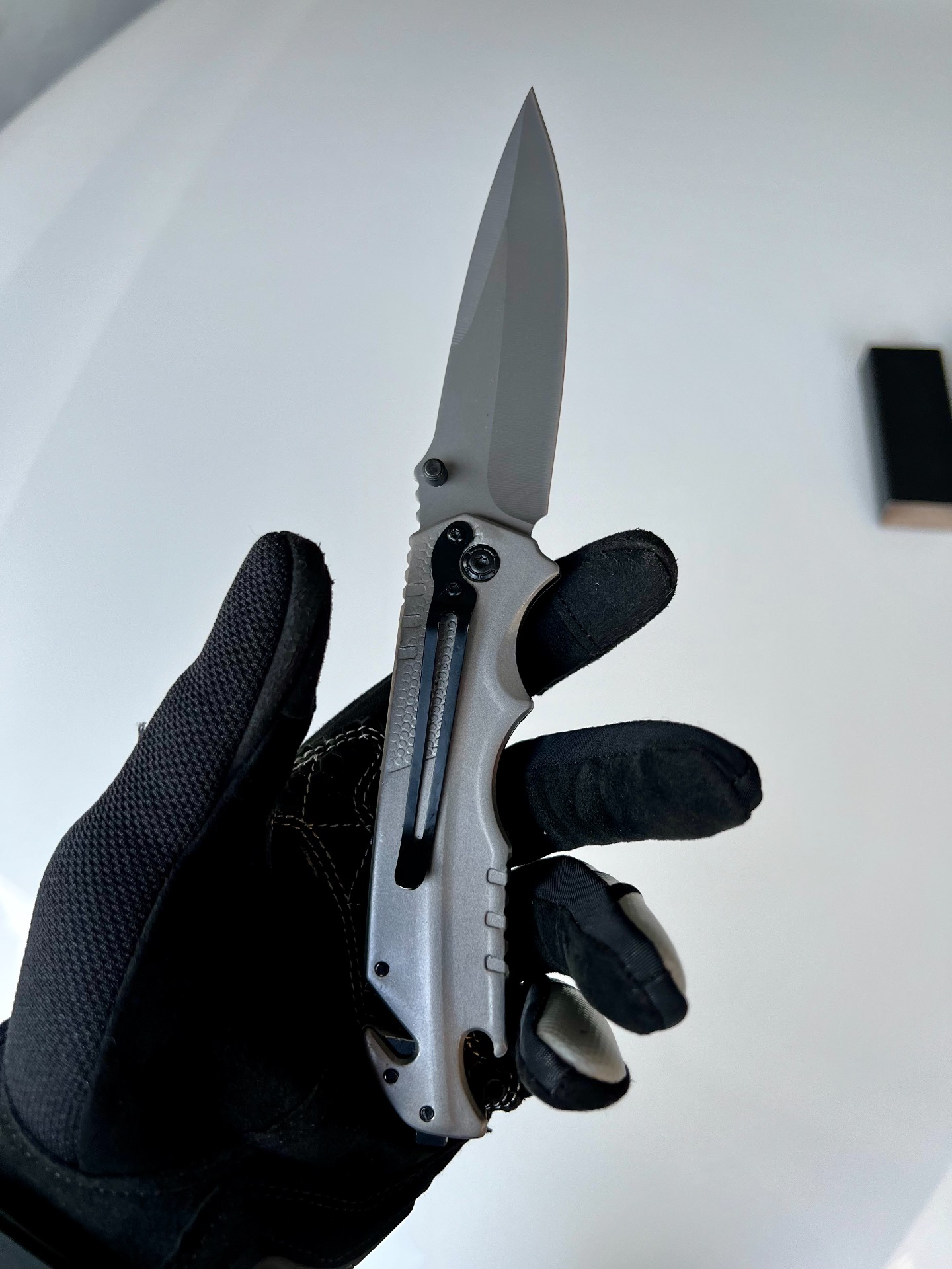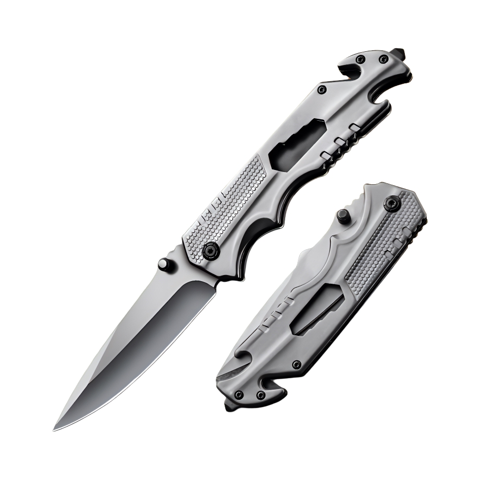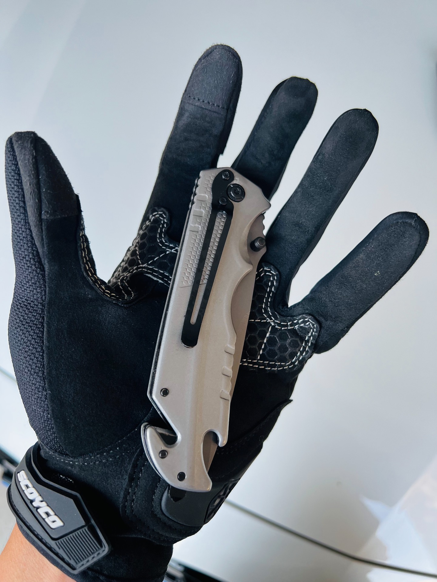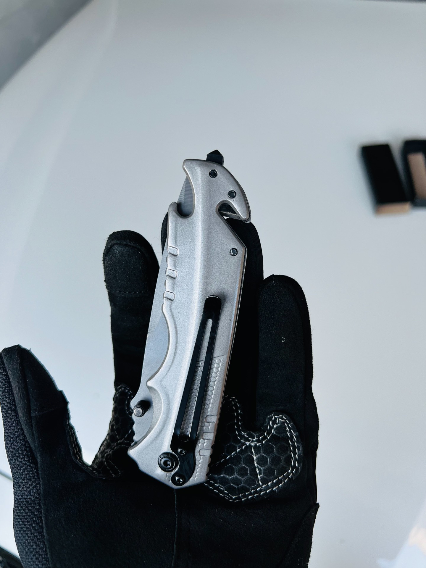 刀身主体是不锈钢 刀柄是铝合金材质 拿在手里手感特别好 做工非常精致 日常可以削铅笔削水果割绳子拆快递用 刀柄下还有钨钢破窗器紧急情况可以破窗用 正握反握都非常舒服 携带非常方便 手柄采用了防滑设计,握感非常舒适,户外探险备一把又帅又实用!!