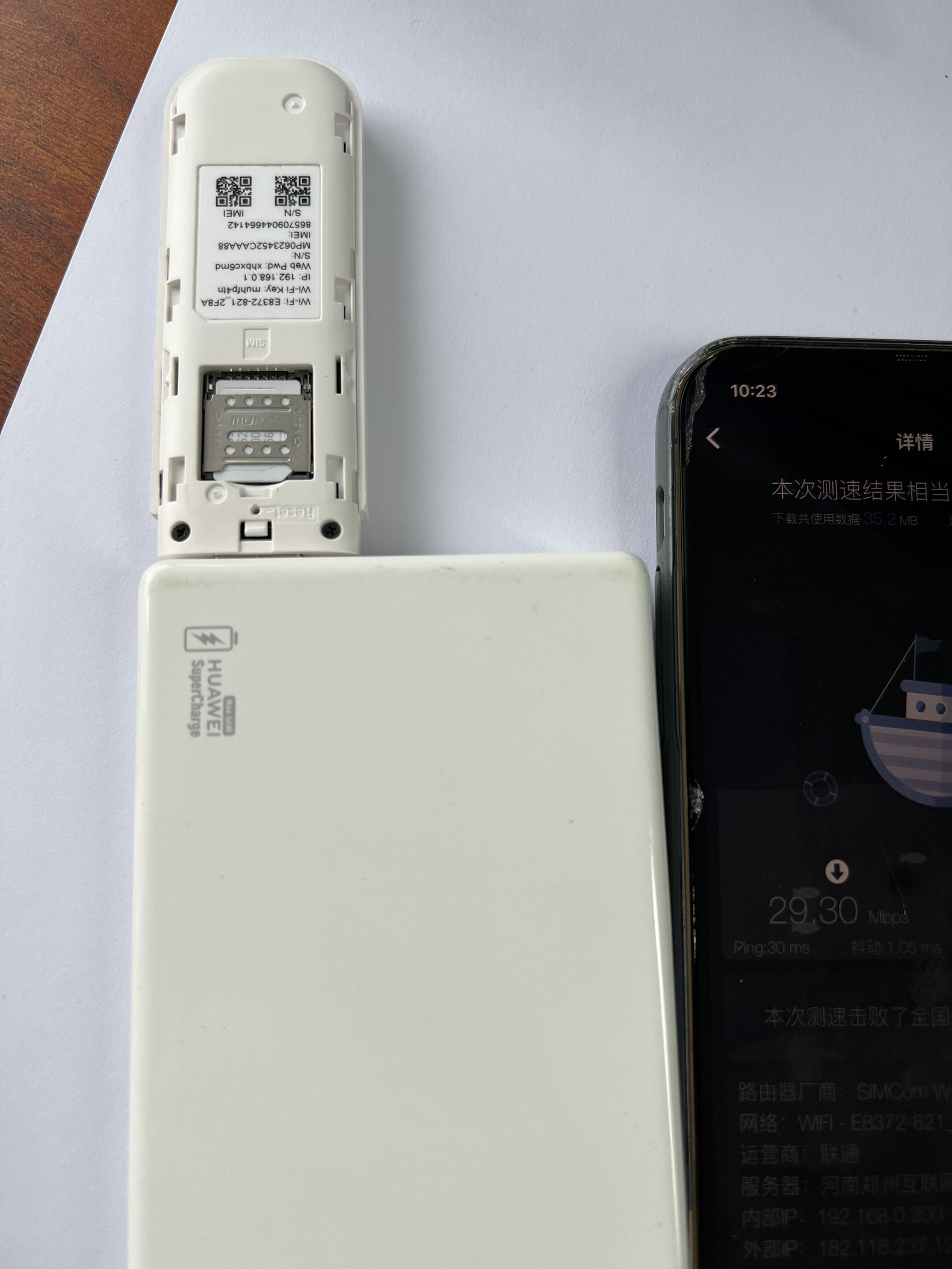 最近使用这个U SB形式随身Wi-Fi、分享一下使用感受:1、用了一个1W毫安的充电宝使用一天没问题、晚上用充电头、2网速、不同位置测速状态不一样、(后来修改了Wi-Fi名称、设备型号E8372-821)、刷剧、看直播、看电视、都可以不卡顿、打游戏怎么样不知道、我不太玩游戏、3、每月2000G流量根本用不完、4、设备便宜、操作简单、5、没有电池、外出使用还需要配移动电源、不方便、4G和5G差距还是...
