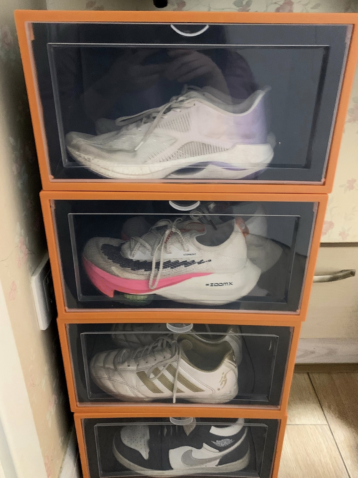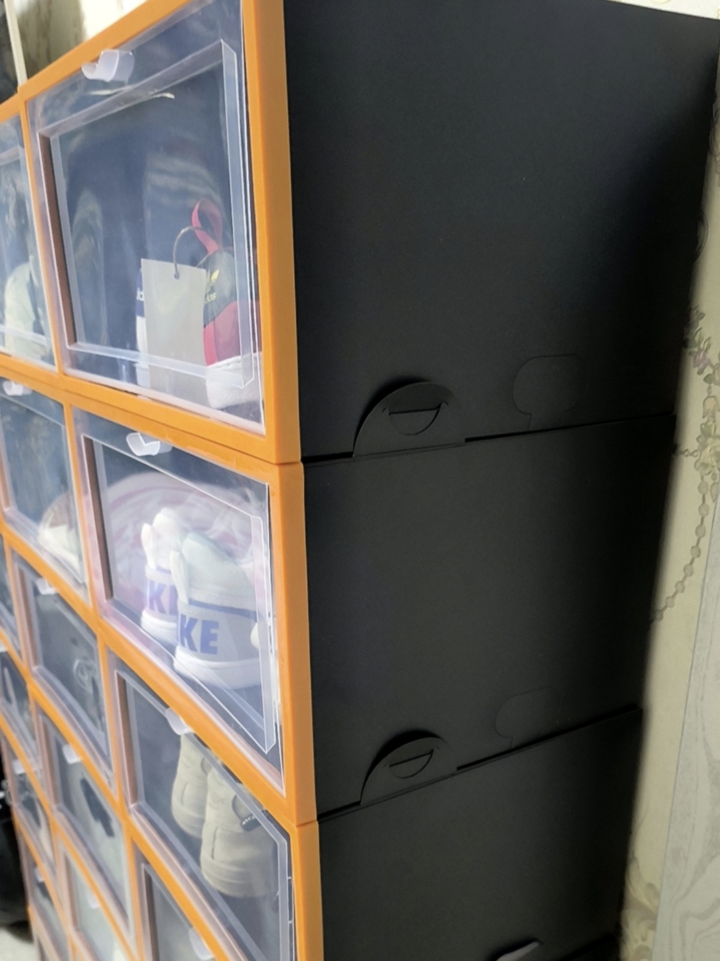 亚克力的材质不容易发黄氧化 一眼就可以看到鞋子 找起来也很方便✨ 空间很大 完全不用担心放不下增高的鞋子 鞋盒安装起来好方便 放在房间里面看起来也太整洁了!!!