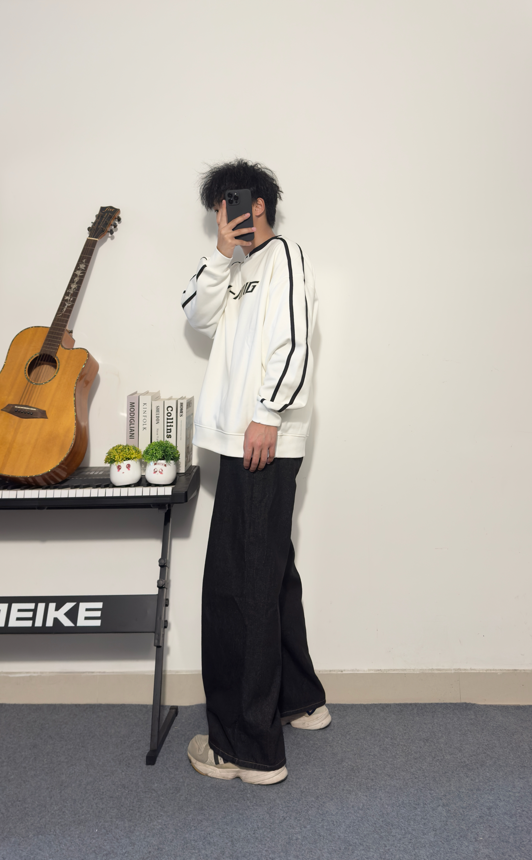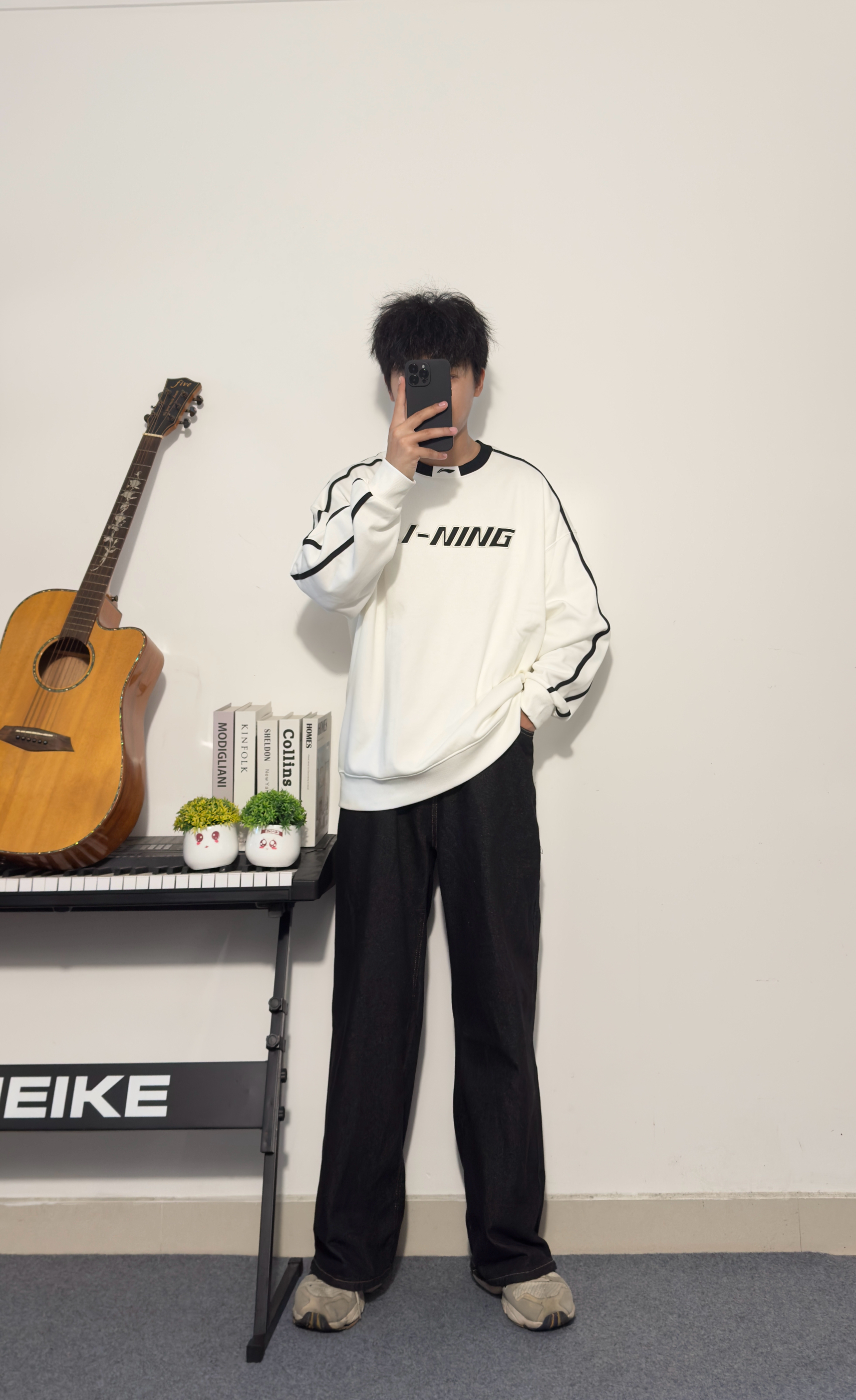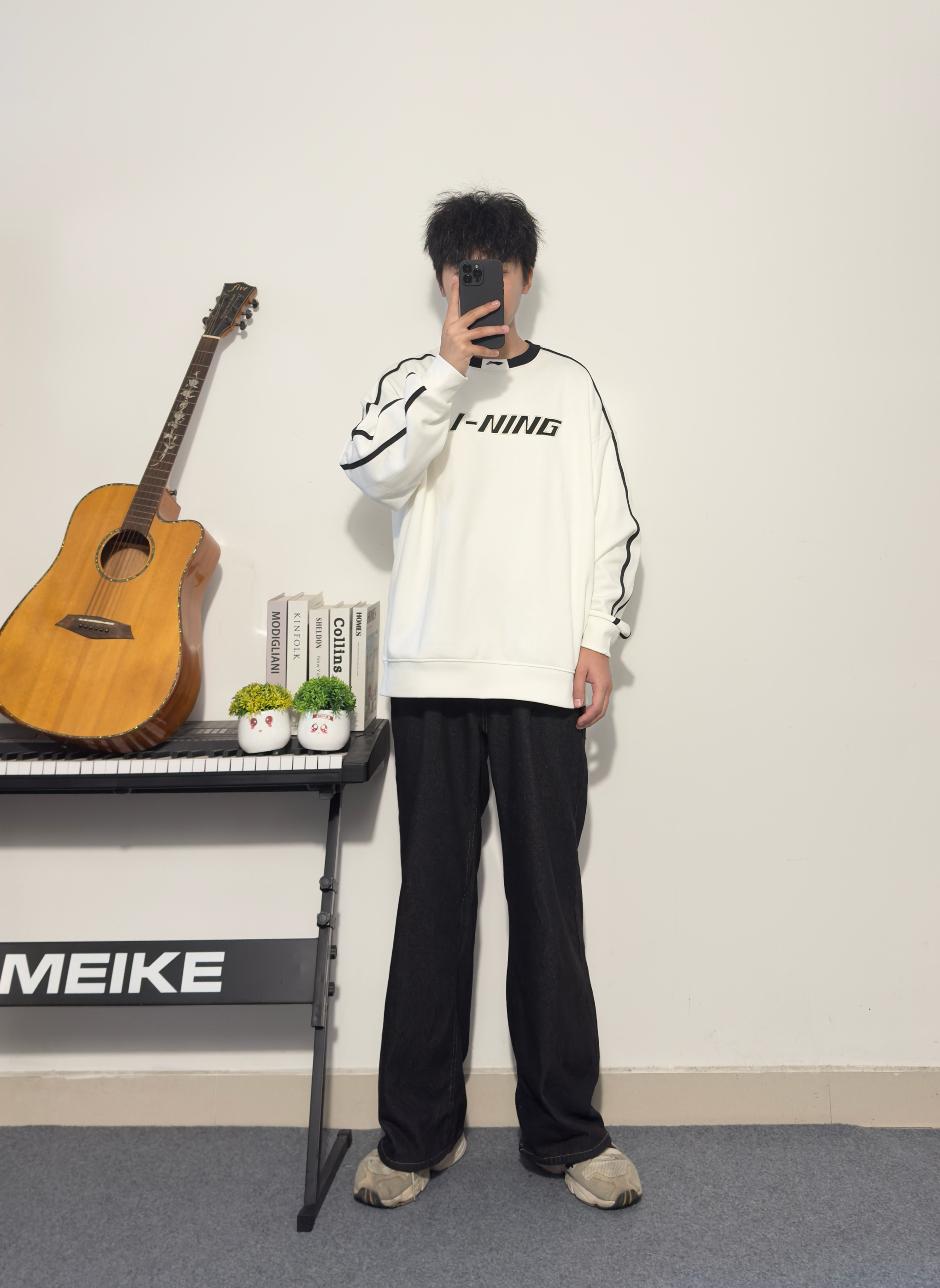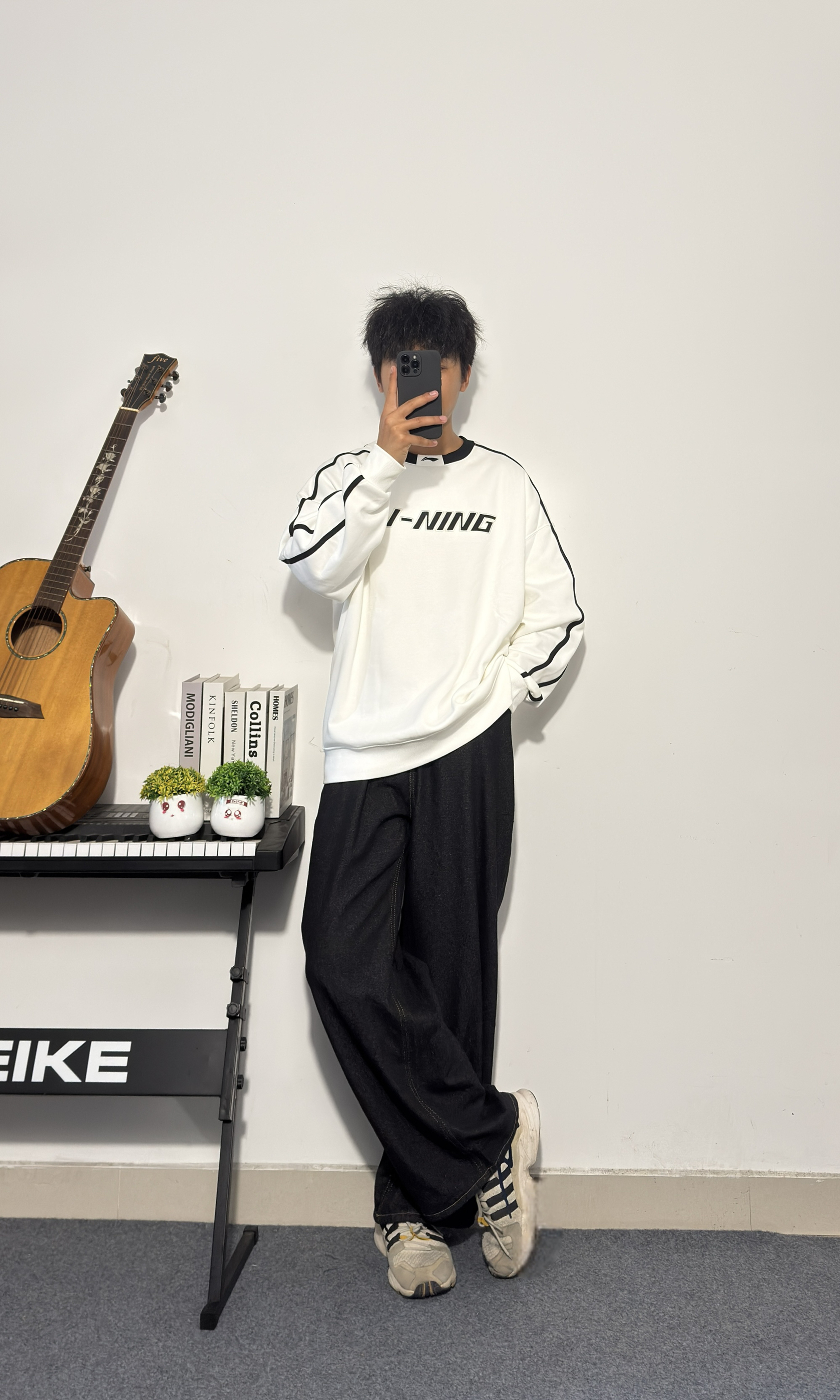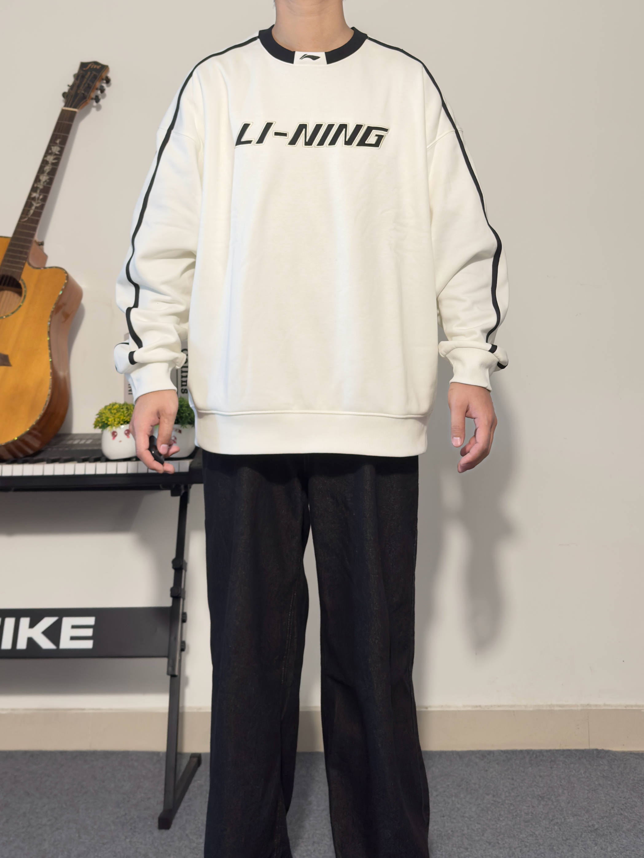 黑色阔腿牛仔裤十白色李宁宽松卫衣☁️ 阔腿裤显腿长 卫衣宽松舒适 黑白配色经典不过时 宽松型卫衣出街运动两不误 👔:李宁 尺码参考:178cm/75kg/XL