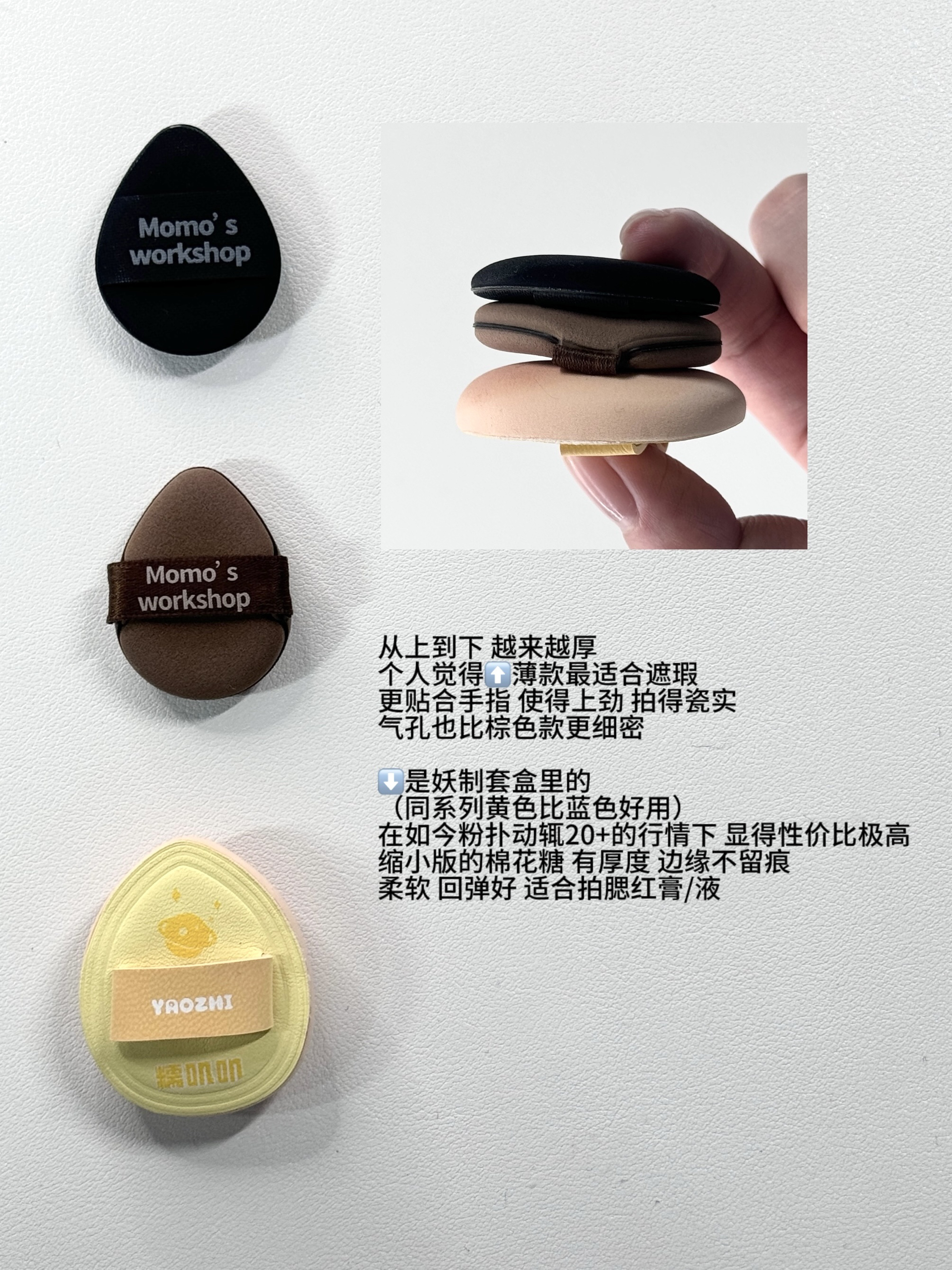 本篇笔记关联了Momo‘s Workshop/毛吉吉 隔离空气粉扑两个装 一刀切平头款 平头款 、花知晓 定妆植绒手指粉扑 服帖 小天使粉扑2个、卡姿兰 黑磁柔纱亲肤粉扑 黑色水滴形4个等商品,为用户提供真实的使用体验和购买参考。