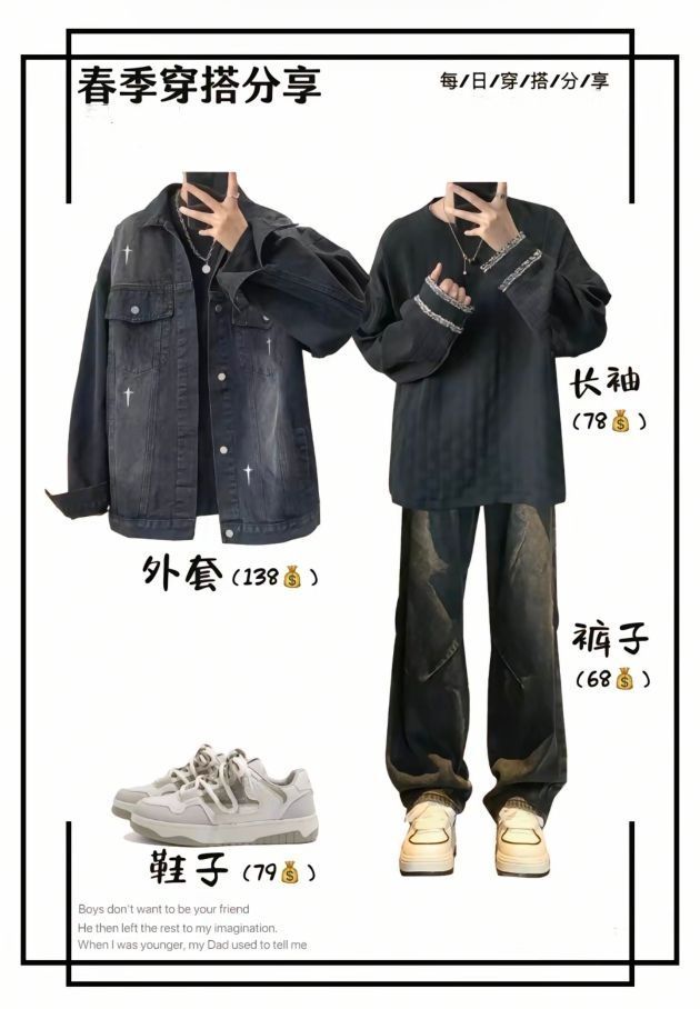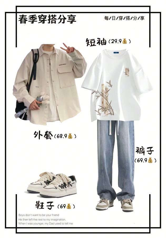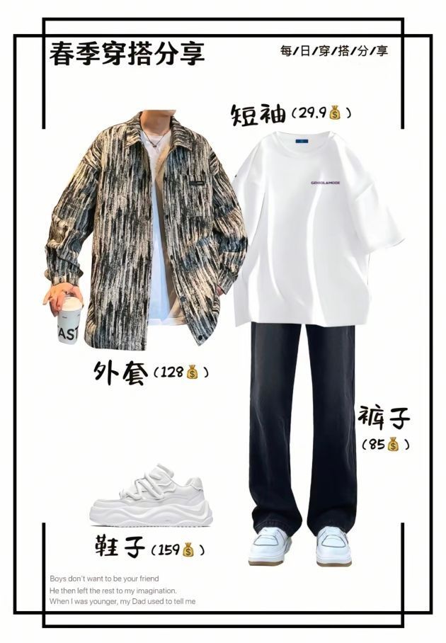 男生春季穿搭新思路,帅出新高度💥 家人们,又到了乱穿衣的春季!还在为每天穿啥发愁?今天就给兄弟们分享几套超绝的春季穿搭,轻松拿捏氛围感✨ 个性街头风 黑白纹理外套搭配简约白短袖,下身配上黑色阔腿裤,再踩上一双白色厚底运动鞋。整体又酷又随性,走在街上回头率爆表!外套 128,短袖 29.9,裤子 85,鞋子 159,性价比超高,学生党也无压力~ 清新文艺风 米白色工装风衬衫外套,内搭带竹影...