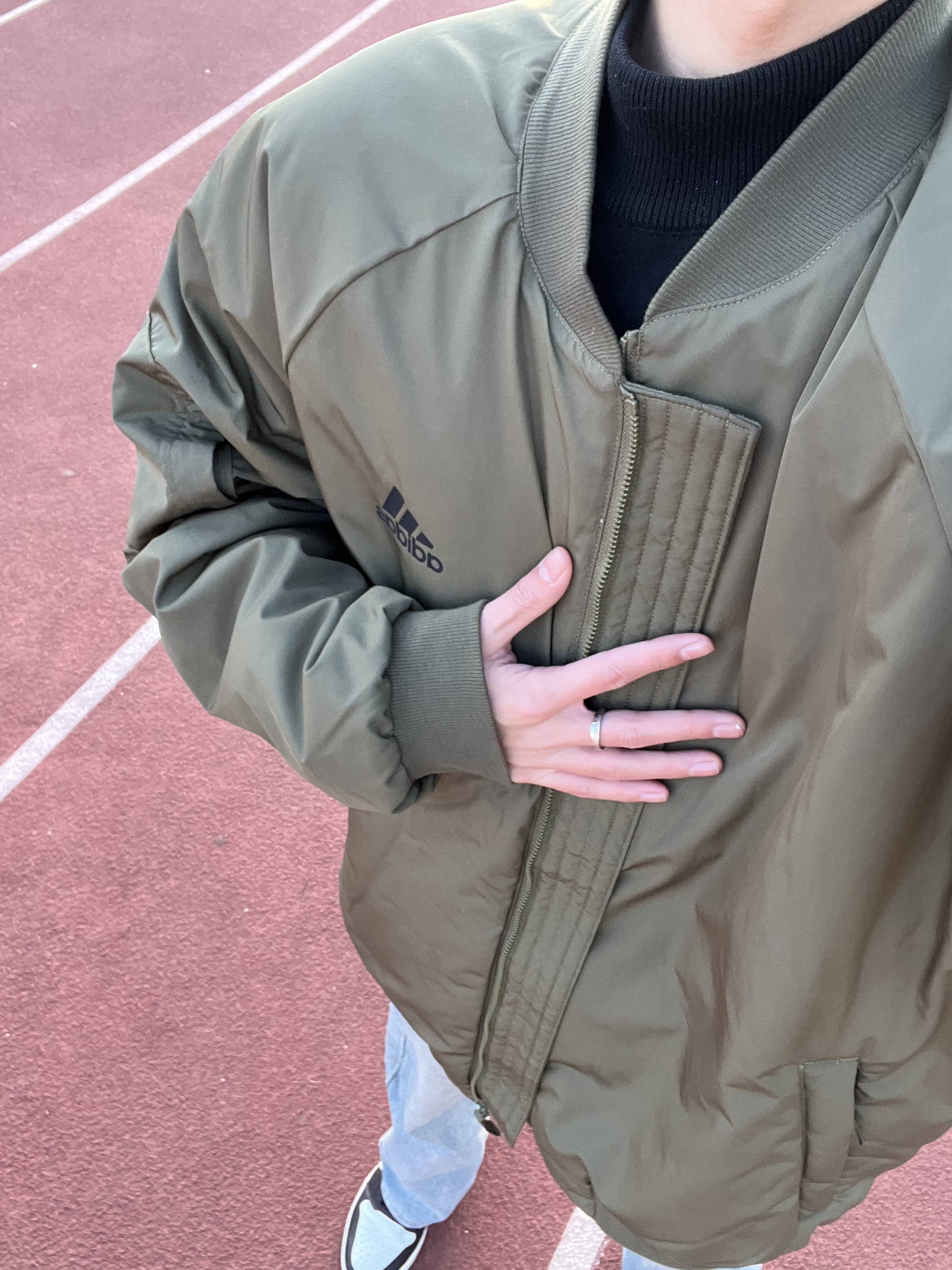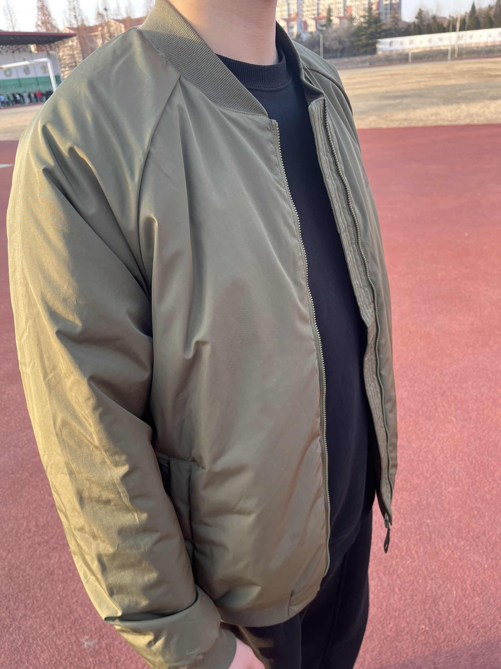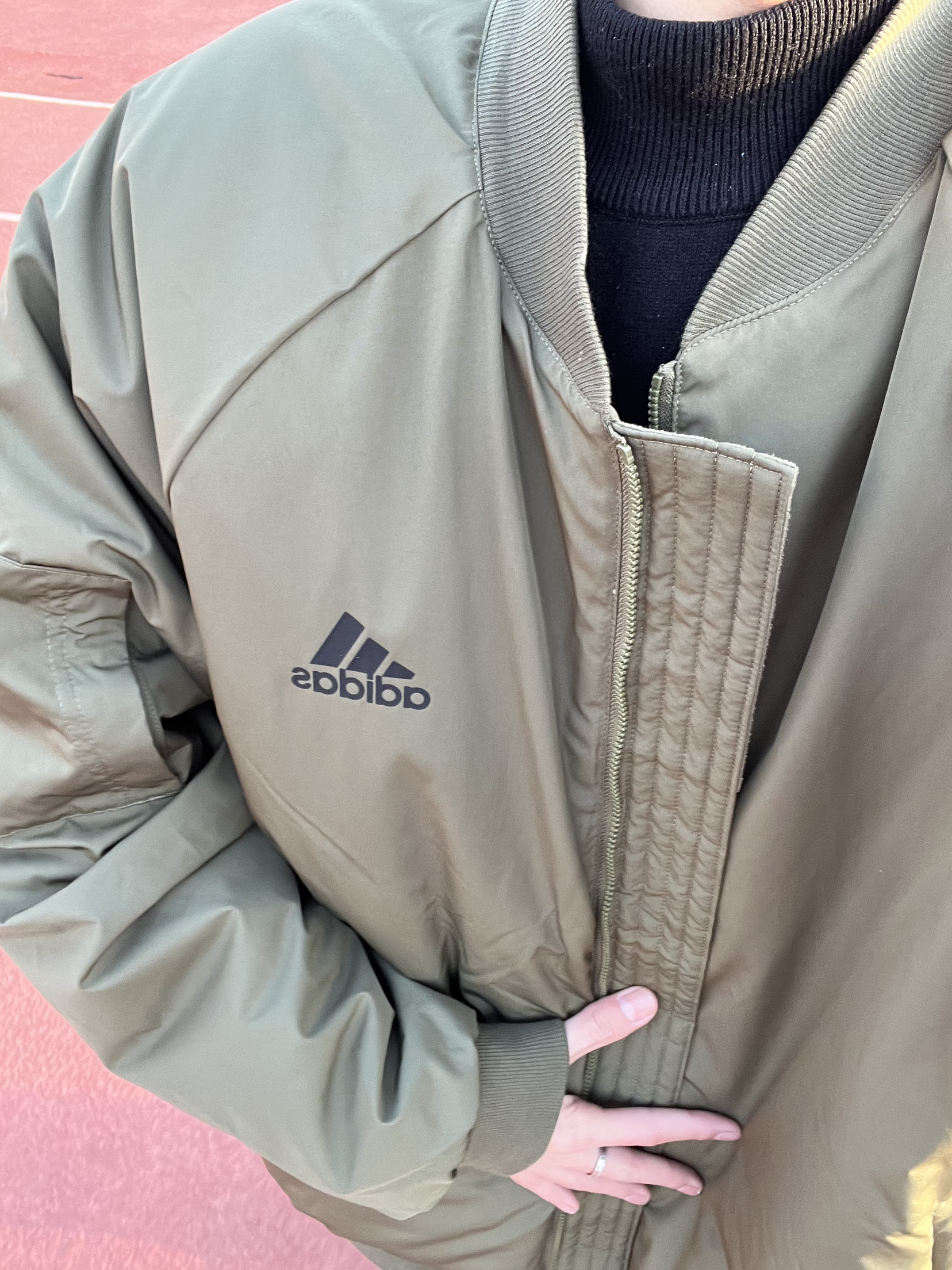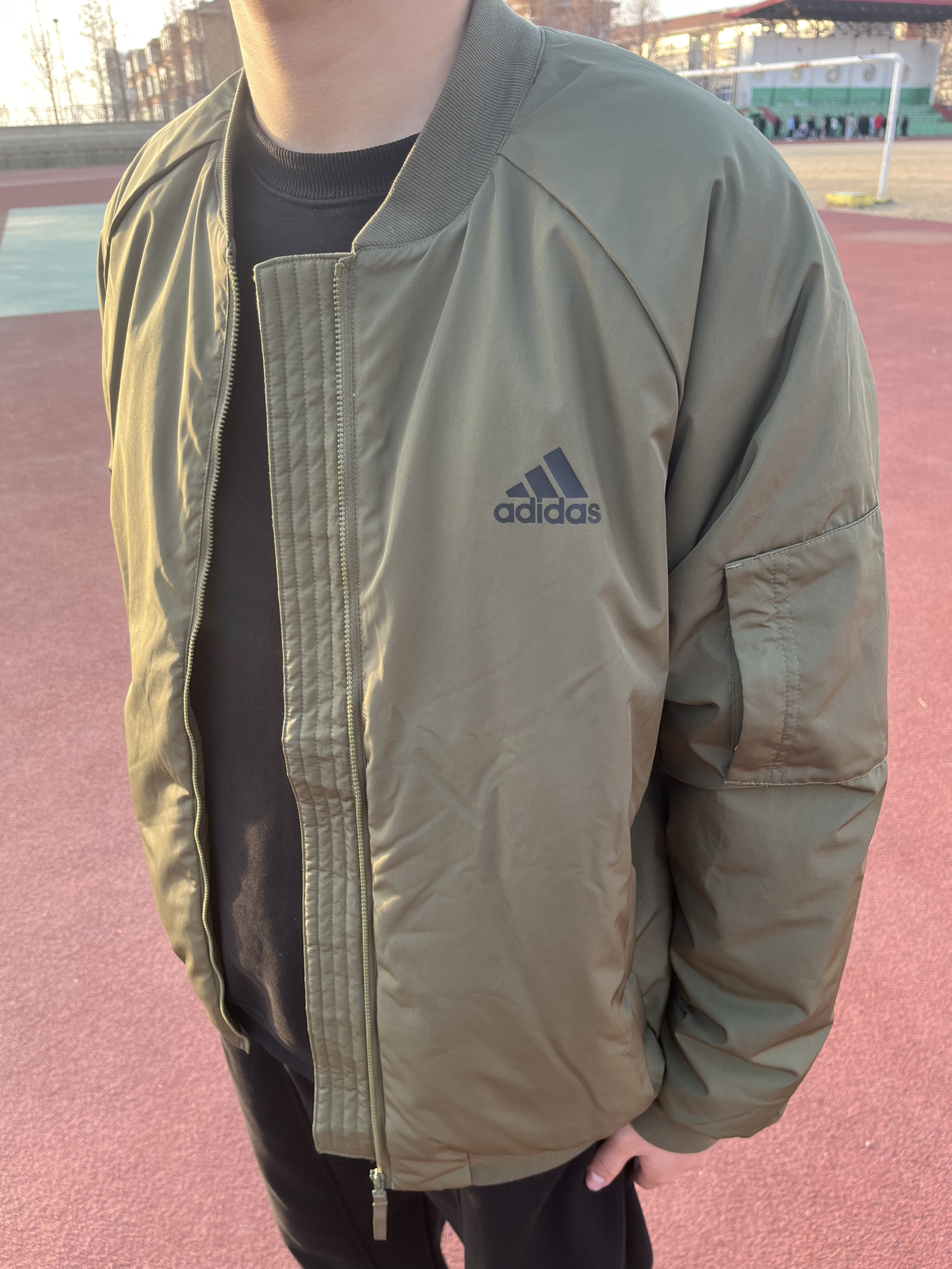 这是一件飞行服夹克外套,是阿迪的,上身效果是不错的,穿着很舒服,衣服设计的版型很好,防风保暖效果不错,挺适合春季穿的。
