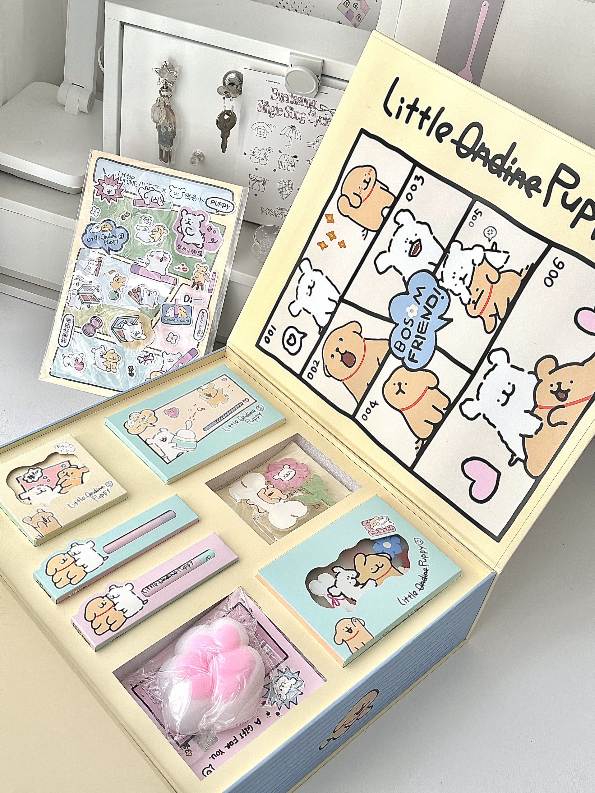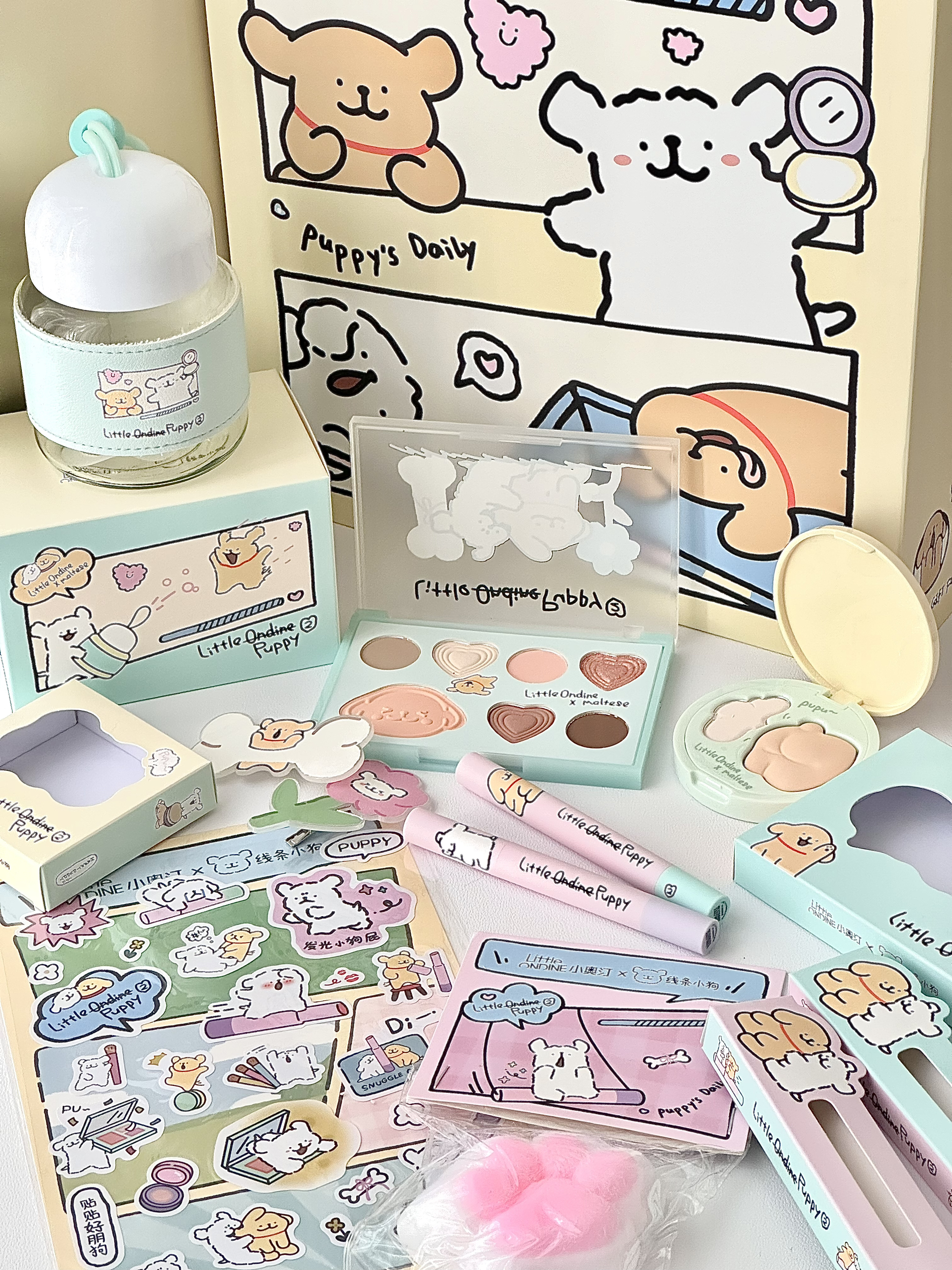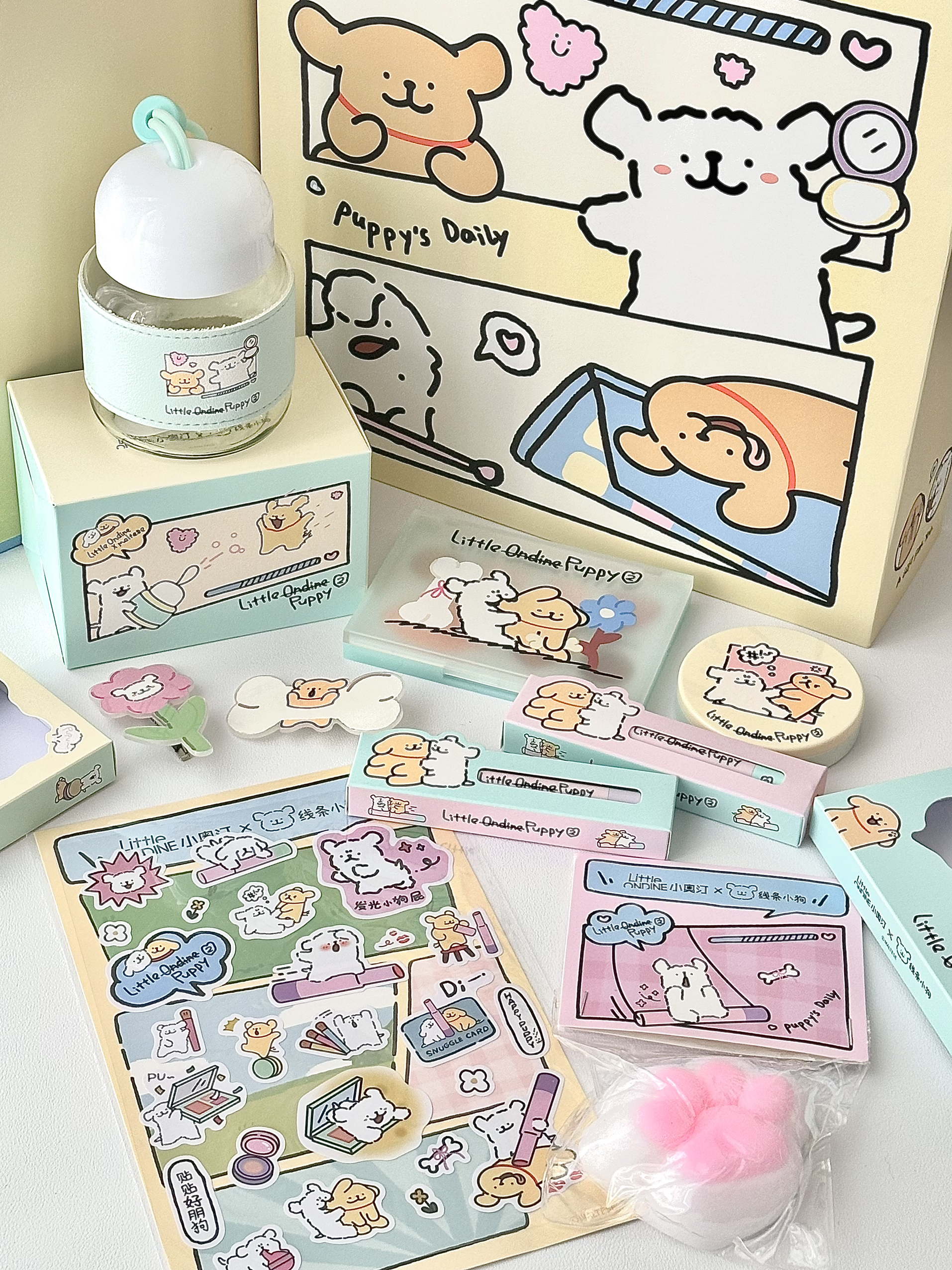 太可爱啦小奥汀和线条小狗的联名礼盒~ 里面有两只固体唇蜜、一盘高光修容盘、一盘多功能眼影盘、还有线条小狗的周边~ 真是太可爱啦 送妈妈送闺蜜,送女朋友都很合适!