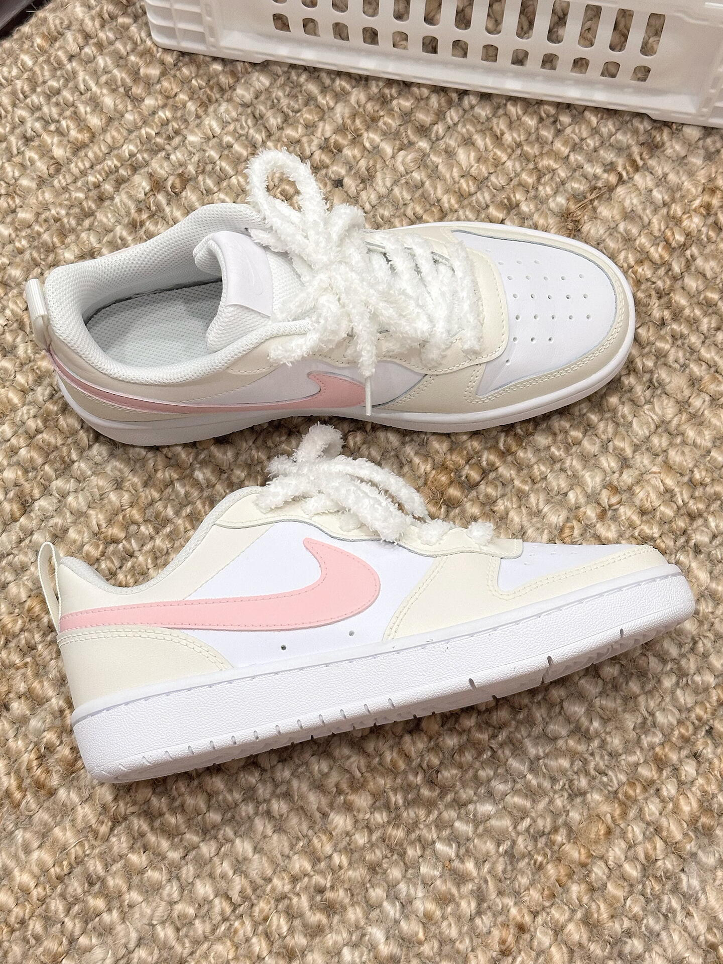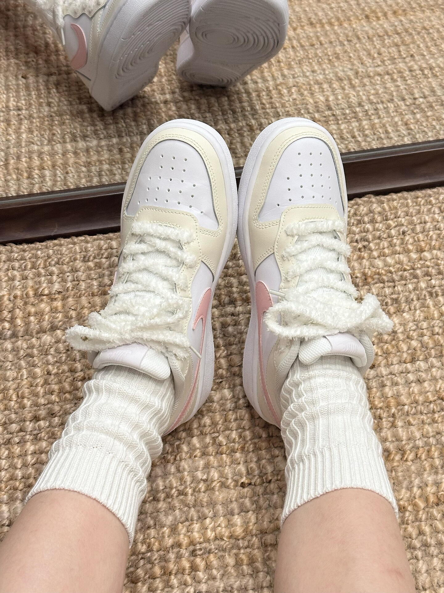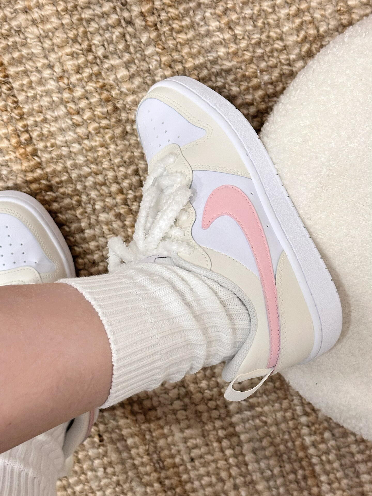 ||春夏百搭王🎀Nike Court这双奶油粉太嗲了~ 低饱和奶油黄打底太治愈啦✨ 樱花粉勾子直接甜度拉满💕 上脚很轻 脚感软fufu的~ 低帮设计蛮显腿长的🫧 配牛仔裤or小裙子hin甜啊!