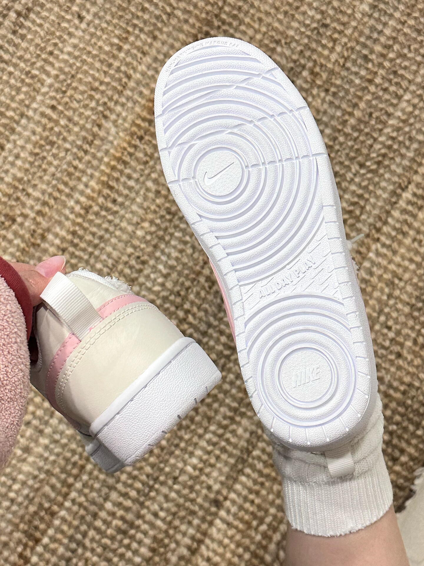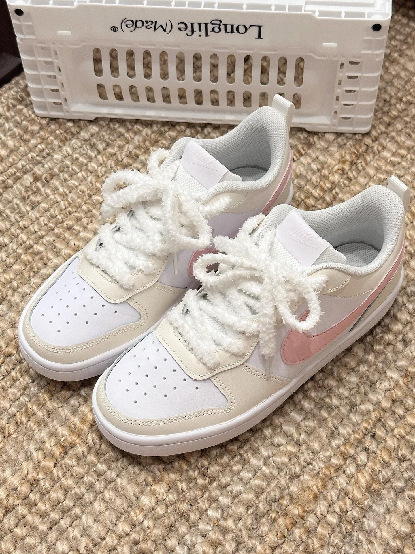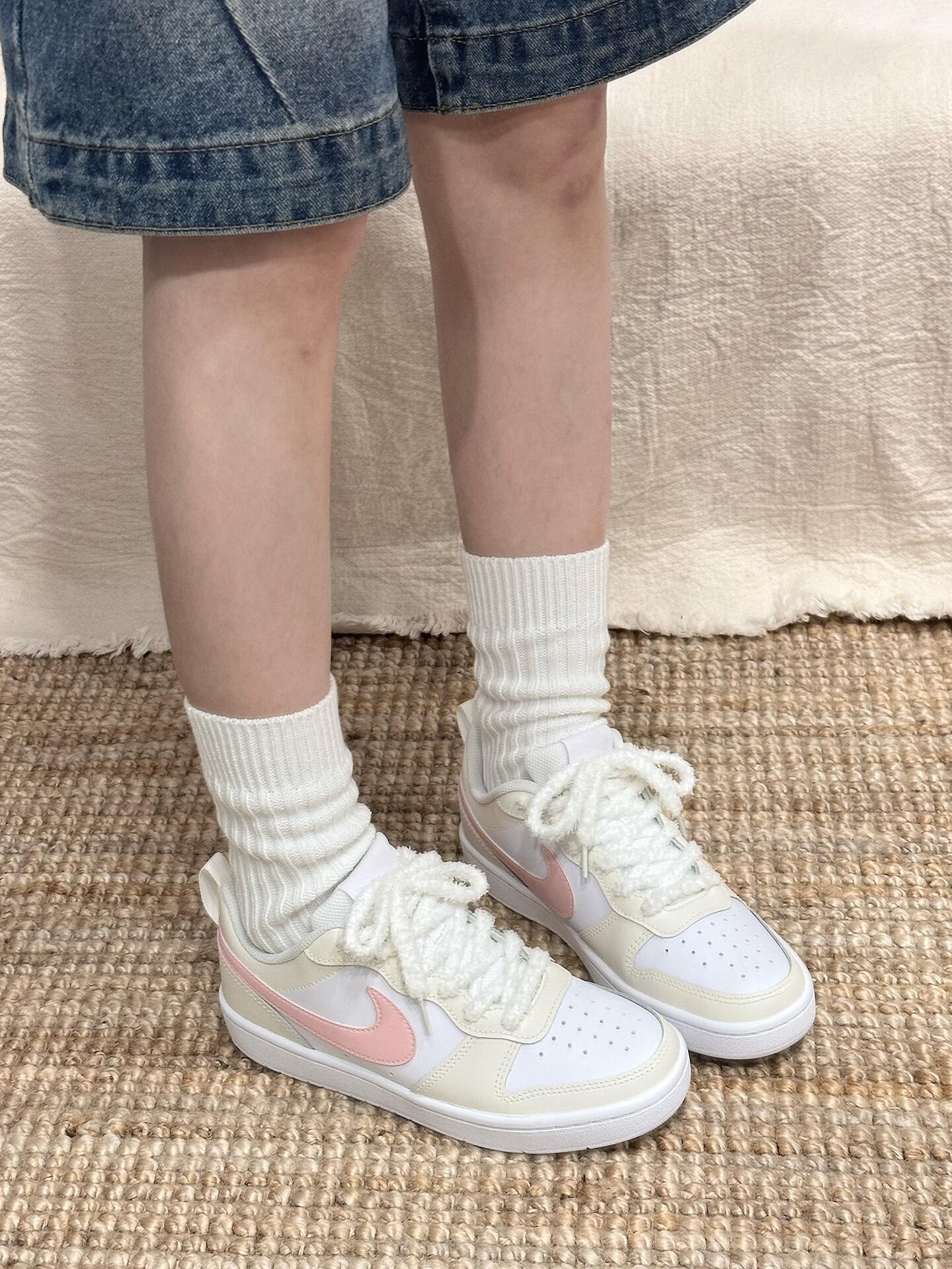 ||春夏百搭王🎀Nike Court这双奶油粉太嗲了~ 低饱和奶油黄打底太治愈啦✨ 樱花粉勾子直接甜度拉满💕 上脚很轻 脚感软fufu的~ 低帮设计蛮显腿长的🫧 配牛仔裤or小裙子hin甜啊!
