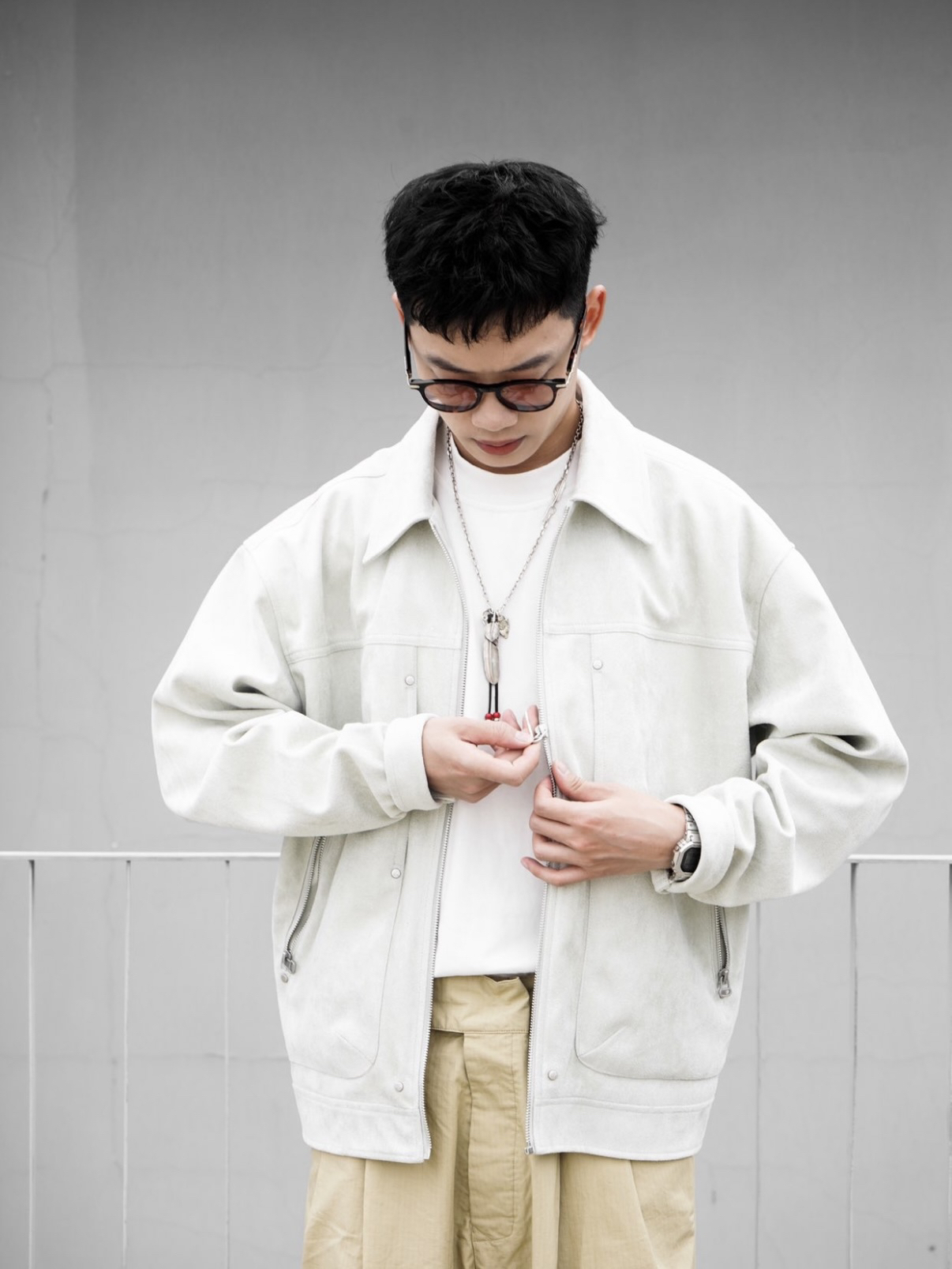 🐟浅灰色麂皮夹克非常友好,这个面料具有一定的光泽感,要增强个性化穿搭选它 👋翻领设计,衣身前片采用拼接,丰富结构性金属撞钉装饰,背面方形logo金属标装饰,丰富造型感 😘所有男生们都能驾驭的款式,有挺括感,上身有型,手感软糯细腻@Simon菠蘿