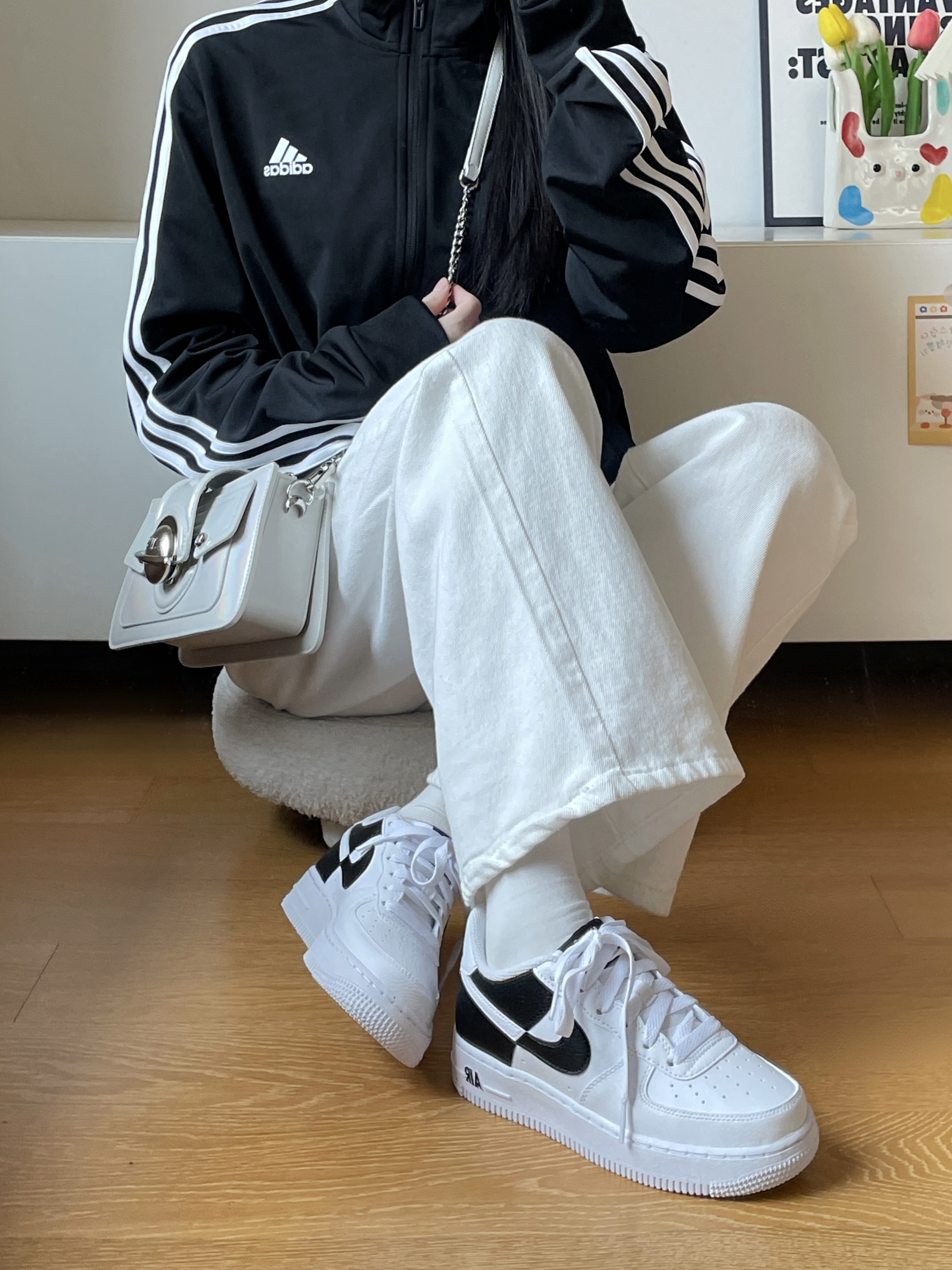 春天穿点简约色系 黑白配干净少年感! 鞋子穿的黑白拼色空军 春夏用来搭配衣服好清爽的感觉~