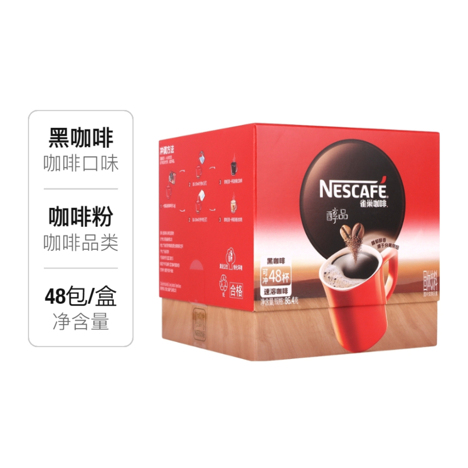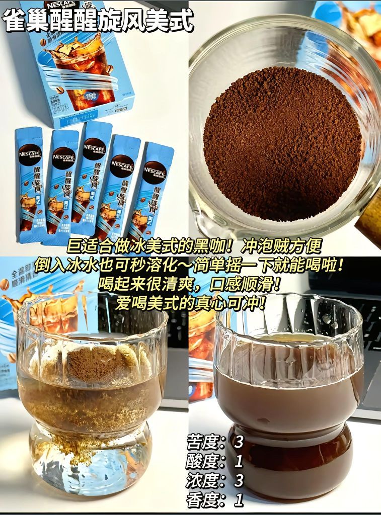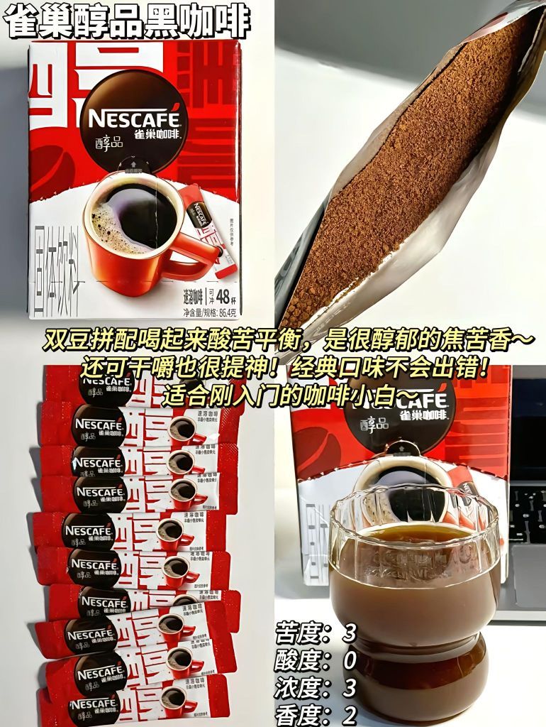 本篇笔记关联了Nestle/雀巢 绝对深黑 95%深烘 黑咖啡 冰美式高温烘焙提神防困熬夜即溶浓郁低脂无糖醇品 54g、Nestle/雀巢 醇品 速溶咖啡 盒装 86.4g/48包 86.4g/48包、Nestle/雀巢 燃魂 黑咖 速溶咖啡 盒装 美式学习醇品低脂提神醒脑防困加班浓醇熬夜 90g等商品,为用户提供真实的使用体验和购买参考。