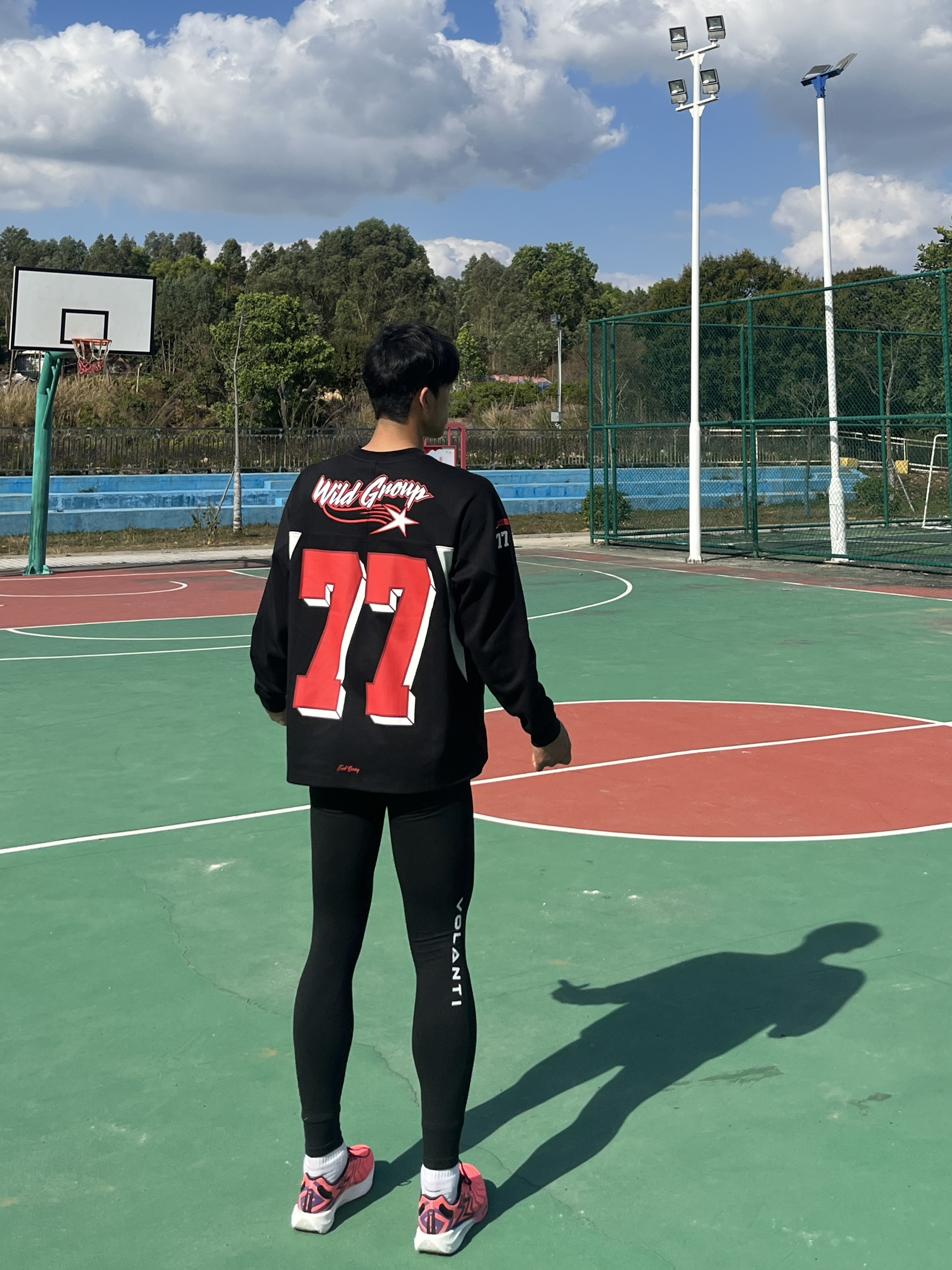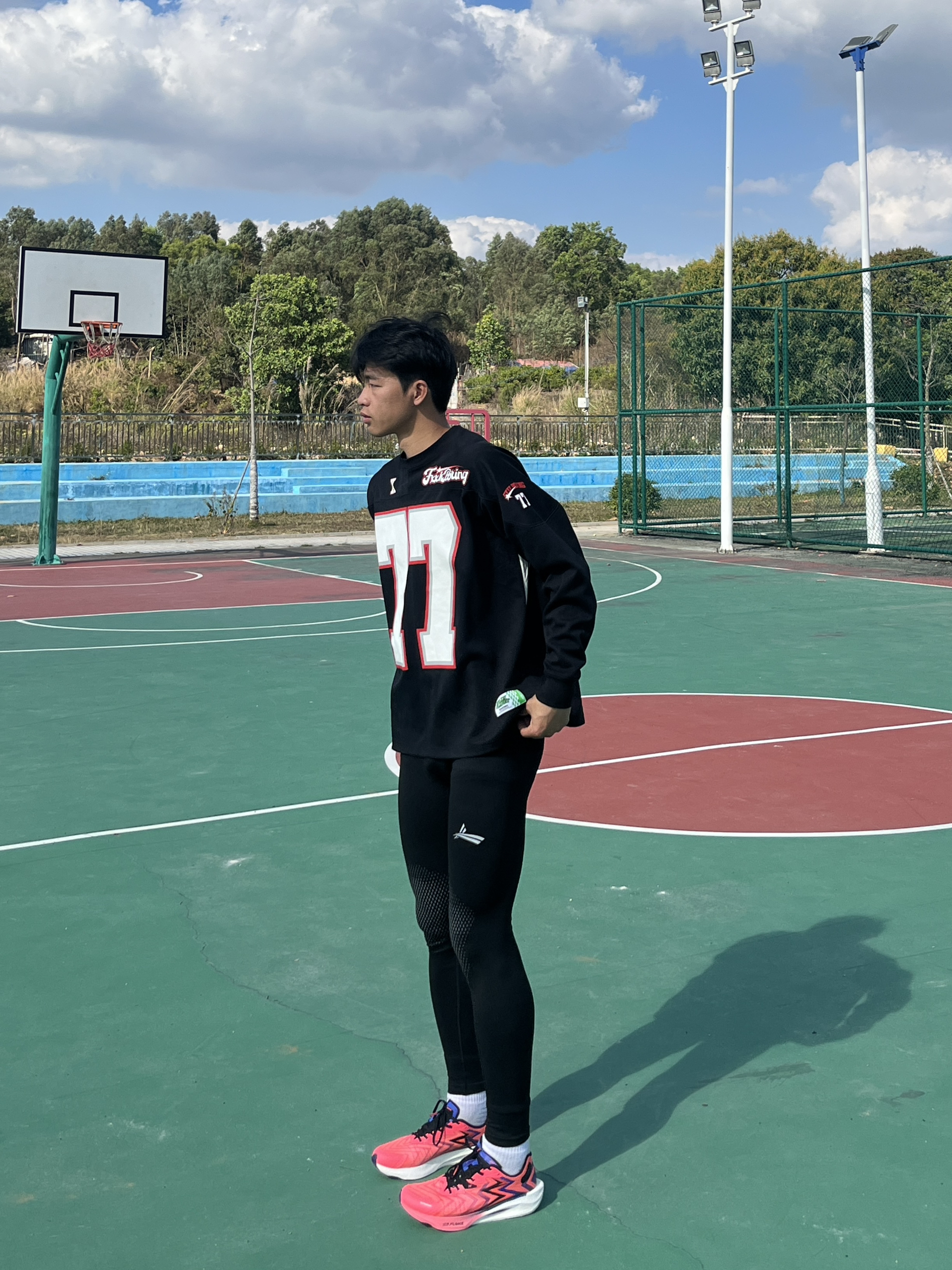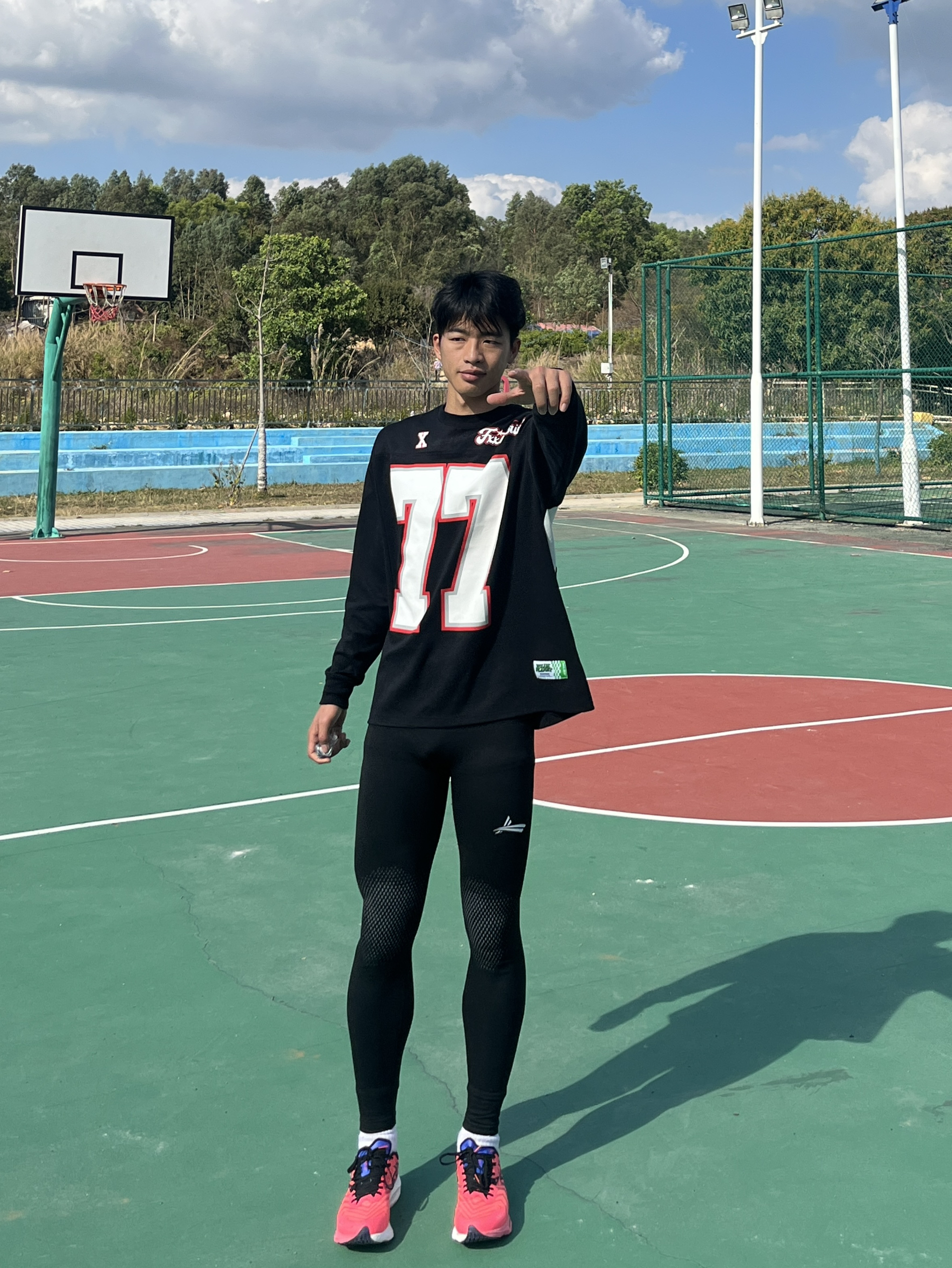 百变风格 不变的我 哈喽大家好今天分享一套适合开春的户外运动穿搭 ⬆️一件简约美式的街头宽松长袖T恤 ⬇️一条具有螺纹智旋控温效果的健身长裤 鞋子是一双红色的跑鞋 这样一套穿搭适合户外跑步或者运动篮球 不仅好看还实用适合开春