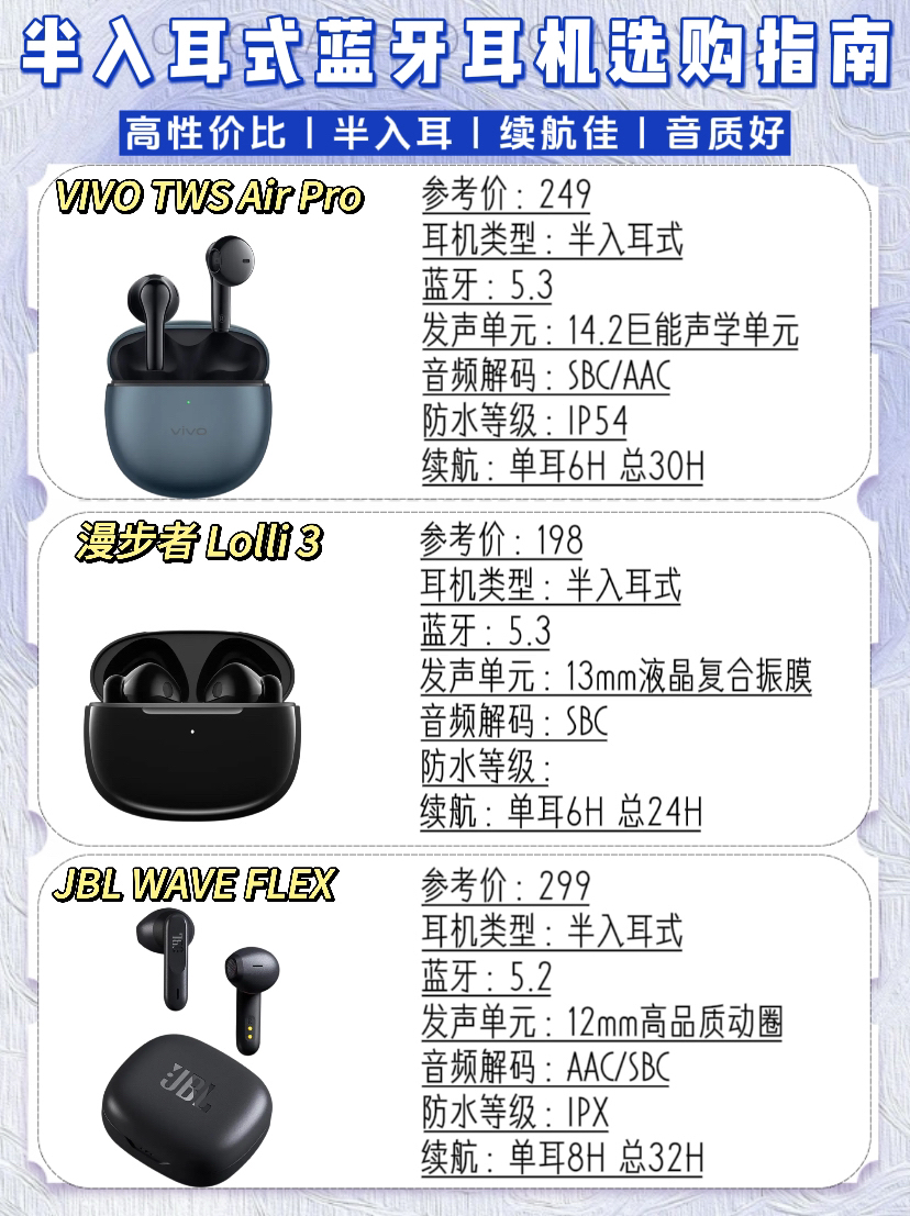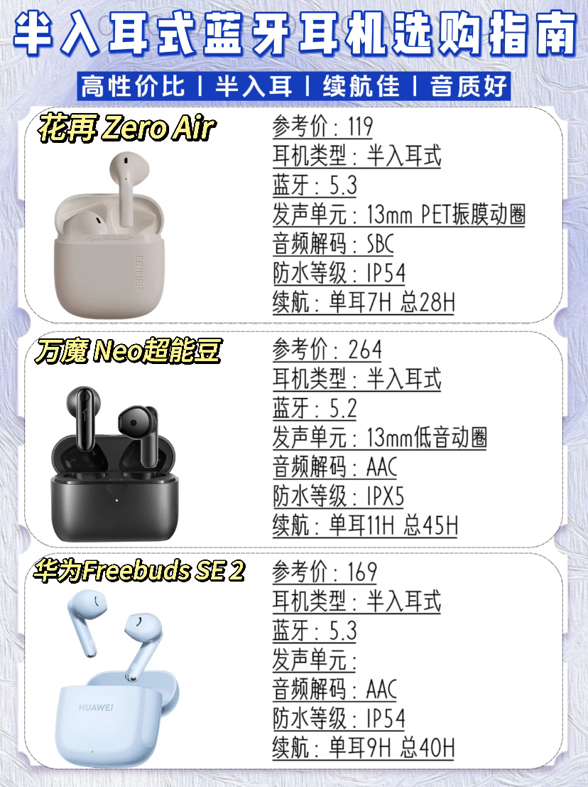本篇笔记关联了1MORE/万魔 EO007 半入耳式无线蓝牙耳机 超能豆Neo 运动降噪 低延时 超长续航 低延迟 防水 通话 真无线 黑色、Edifier/漫步者 花再 Zero Air 半入耳式 蓝牙耳机 真无线 超长续航 高音质 通话降噪 低延迟 月白、HUAWEI/华为 FreeBuds SE 2 半入耳式 蓝牙耳机 小巧 快速充电 低延迟 运动 真无线 超长续航 降噪 快充 高音质 低延时 影音娱乐 陶瓷白等商品,为用户提供真实的使用体验和购买参考。