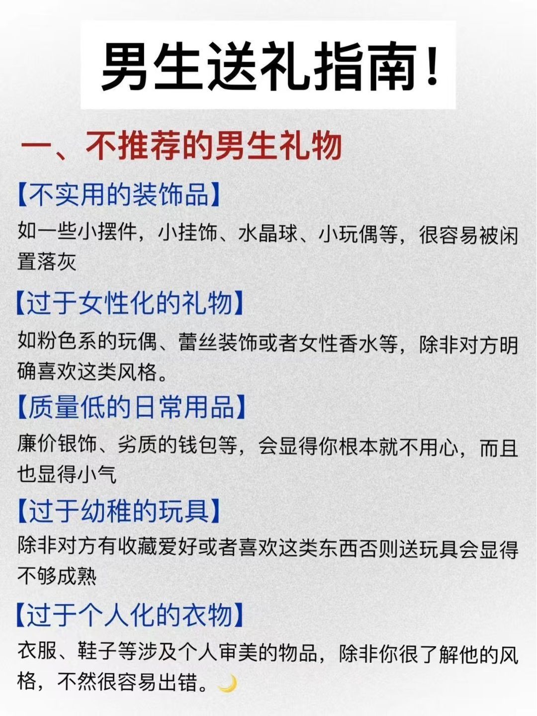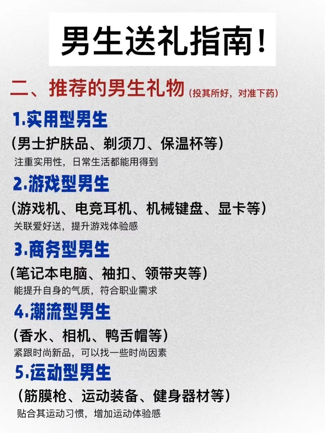 姐妹们!咱不送礼物就算了,要送就得送到他的心尖尖上❤️,咱不能耗费了心力还有钱钱,还没送到对方喜欢的点上啊! 给大家分享了一些男生礼物喜好,有需要的直接码住参考!