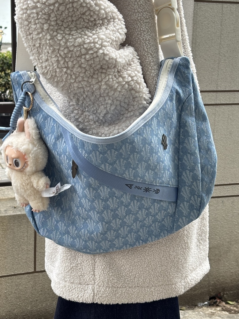 牛仔色的外观,搭配欧文的logo印花,时尚感直接拉满💯✨。 背上它,出街搭配各种风格的衣服都很合适,休闲风、运动风都能轻松驾驭😎。 而且它不仅仅是颜值高,实用性也超棒👏。内部空间超大,小一点的笔记本放进去完全没问题,平时上学、通勤或者出门旅行,装些必备物品都不在话下。👏 特殊羽毛形状的拉链设计,细节感满满,很有创意👍。肩带还可以调节,背着舒适又方便。再挂上可爱的泡泡玛特玩偶🧸,更是增添了几分...