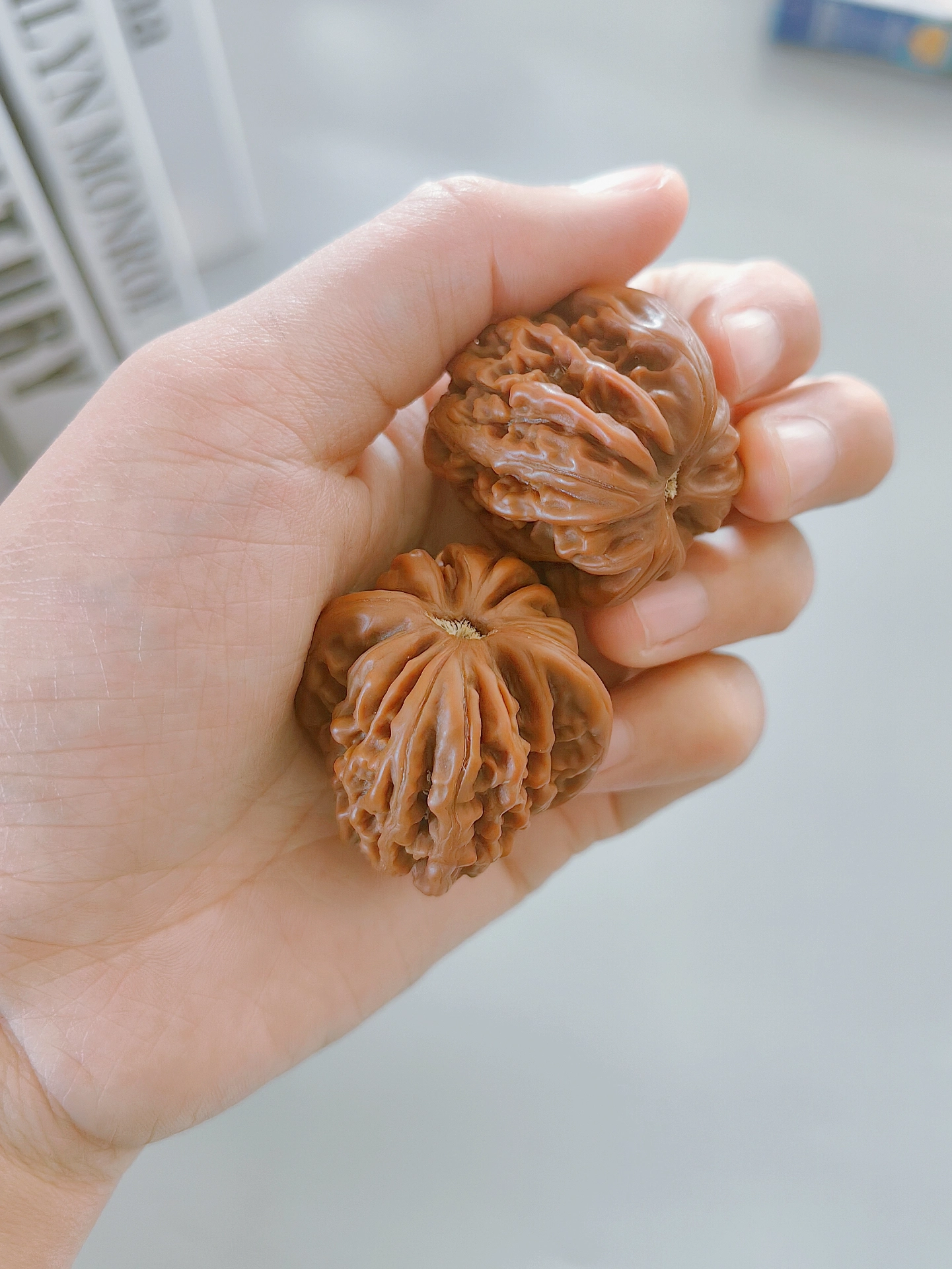 我的第一个苹果园核桃,六面精配,骨质硬,品相好,油性足,梅枝纹对称均匀,清晰自然,大凹底气门一致,手感温润,独特桩型个性十足,圆桩闷尖大肚连边,皮质非常优秀,易红易透。苹果园是我个人比较喜欢的一款核桃!