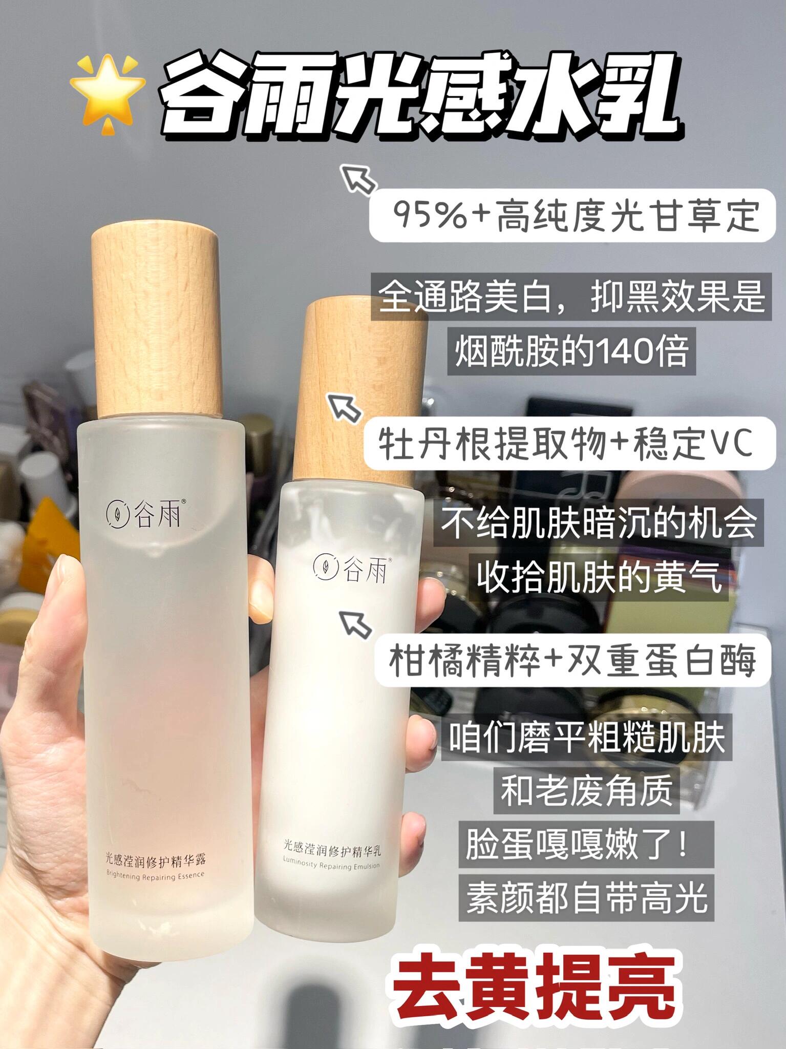 大声开麦:黄黑皮都给我认准谷雨光感系列!! 我真的大爱!! 透白滑嫩脸蛋全是它给的! 美白嫩肤效果真不是吹的,天花板级别! 出门见朋友谁都说我白了,甚至还被路人夸过,谁懂❗️ - 光感水乳 本就是去黄天花板的光感水乳这次直接带着美白特证大杀特杀✊直接占领我的化妆桌C位! 👉95%+高纯度光甘草定、牡丹根提取物、稳定VC 全通路美白!从源头上掐断黑色素! 海岸松树皮提取物、脱羧肌肽、紫草提取物直接组...