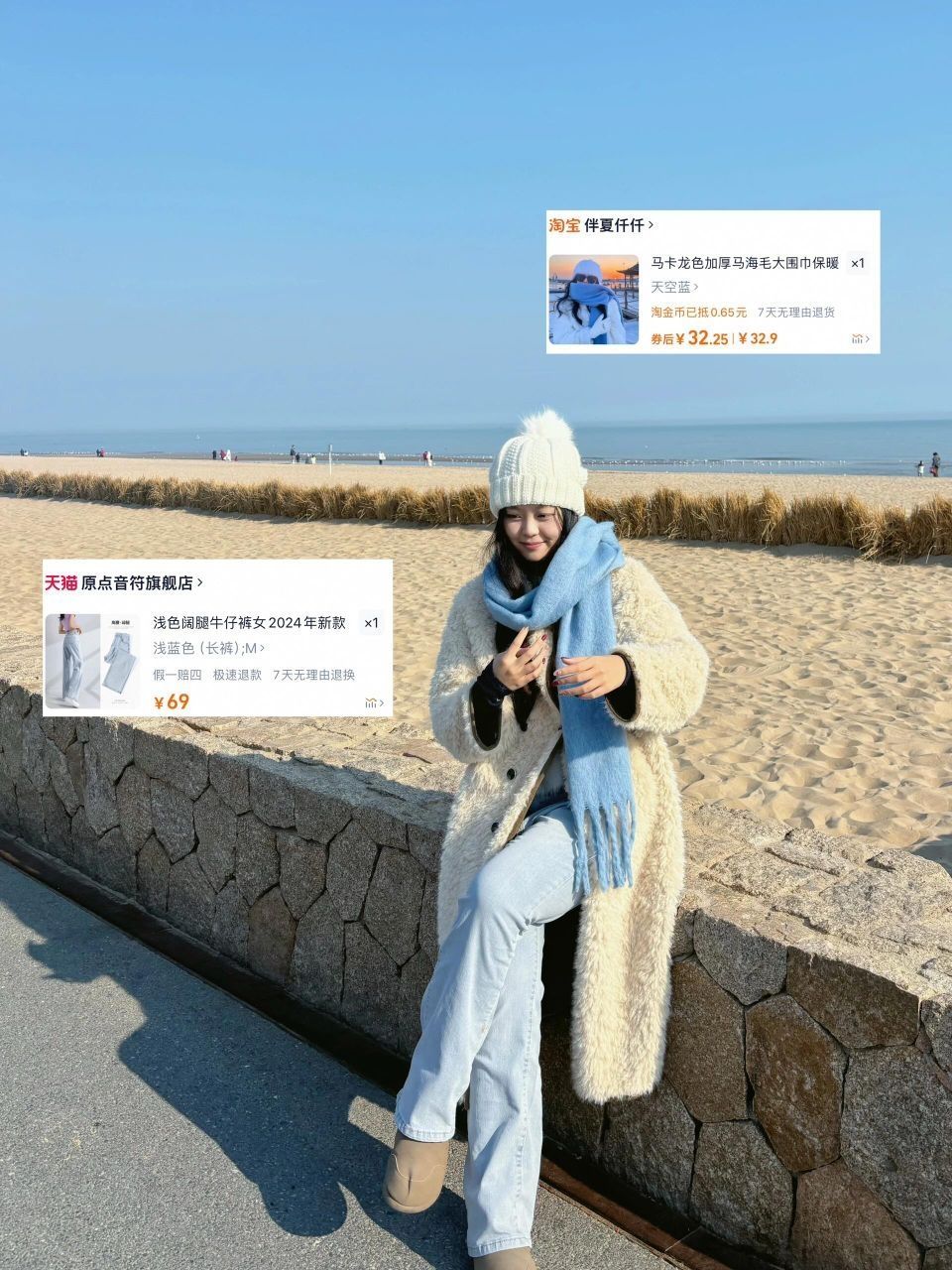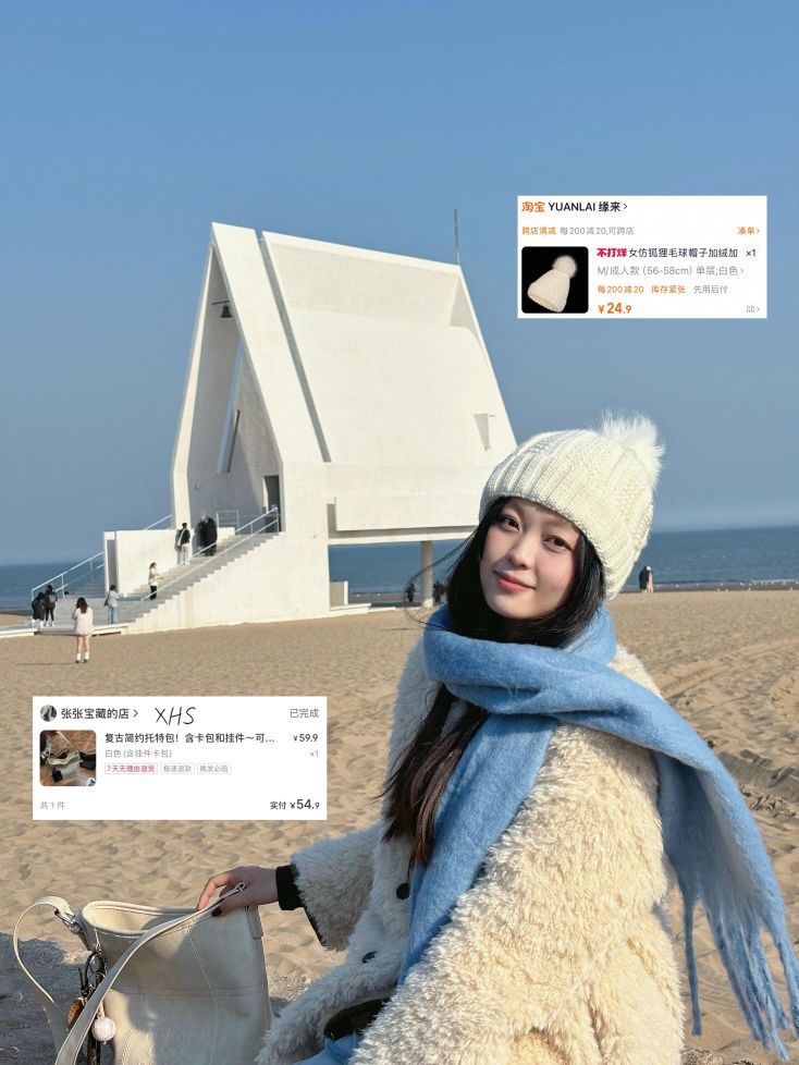 和男朋友淡季去了阿那亚两天一夜,觉得自己这些穿搭还蛮好拍的,分享给大家! 首先就是配饰一定要多带,想我只穿了一件大衣,是正反两穿的(很不错),但是帽子围巾带了好多个 蓝围巾是👍超级搭配海边 白蓝穿搭特别漂亮 可爱一点的是这个蜂蜜小熊帽子,在海边也是很保暖,还有一个黑白的热巴同款冷帽
