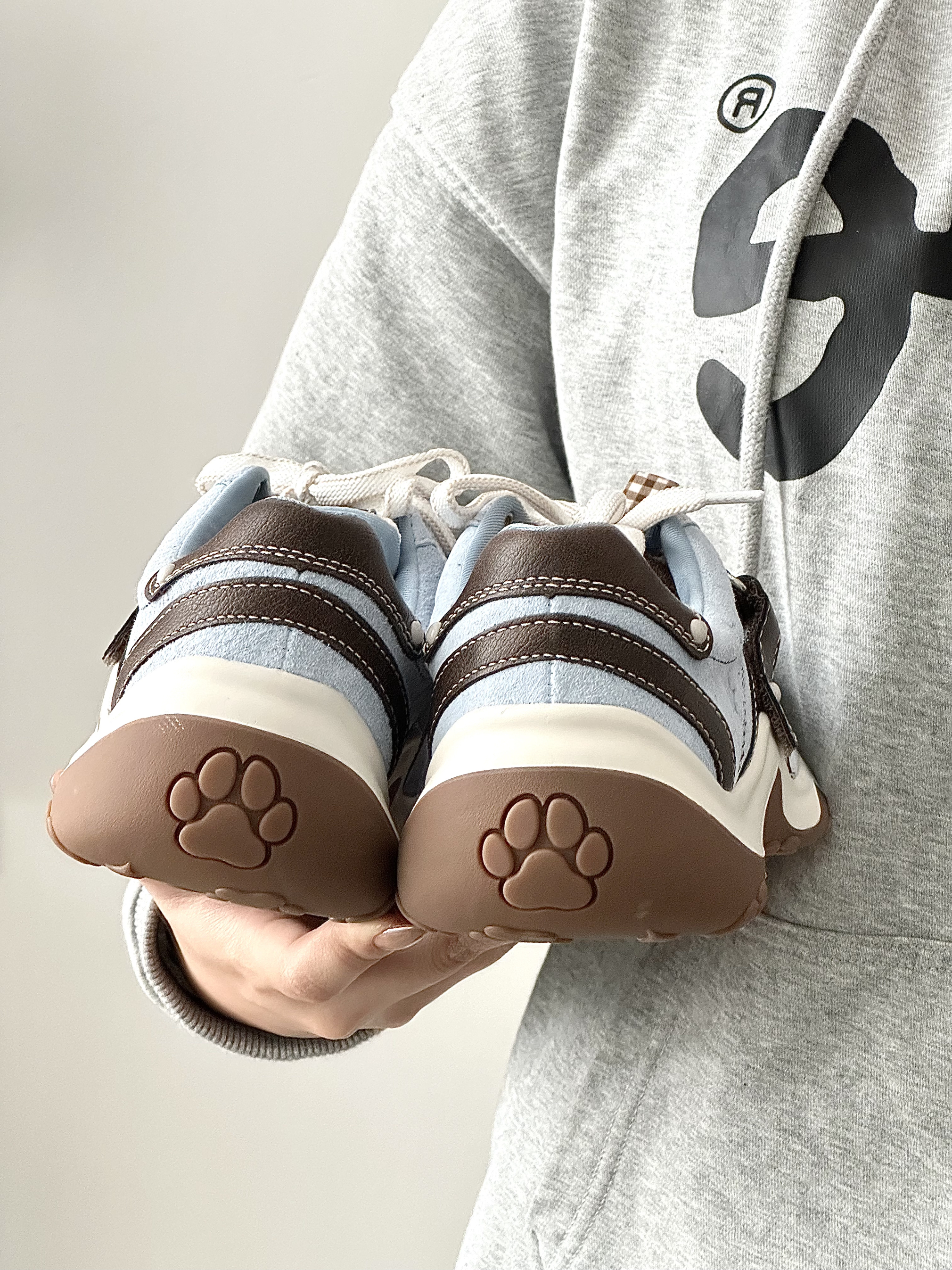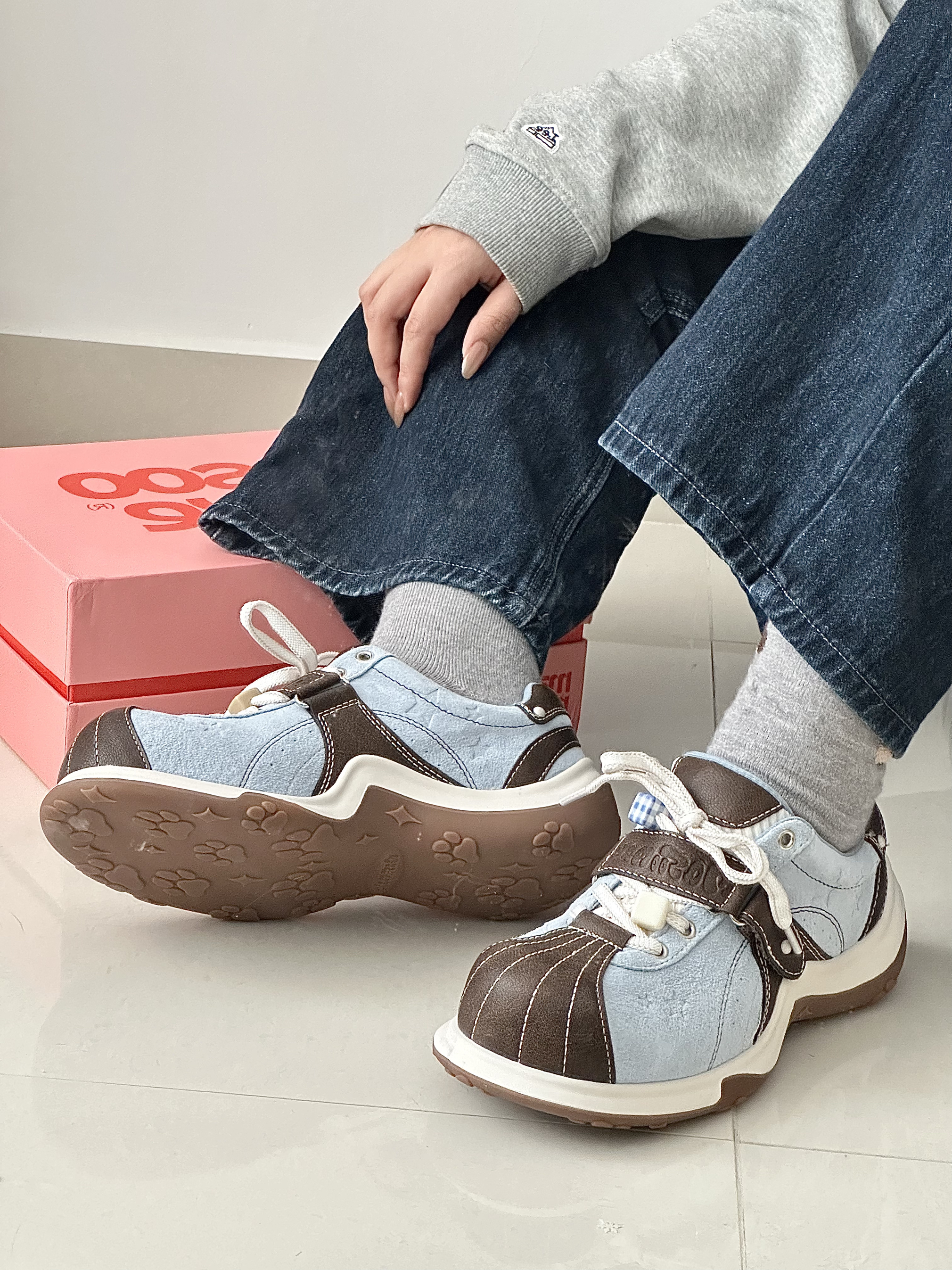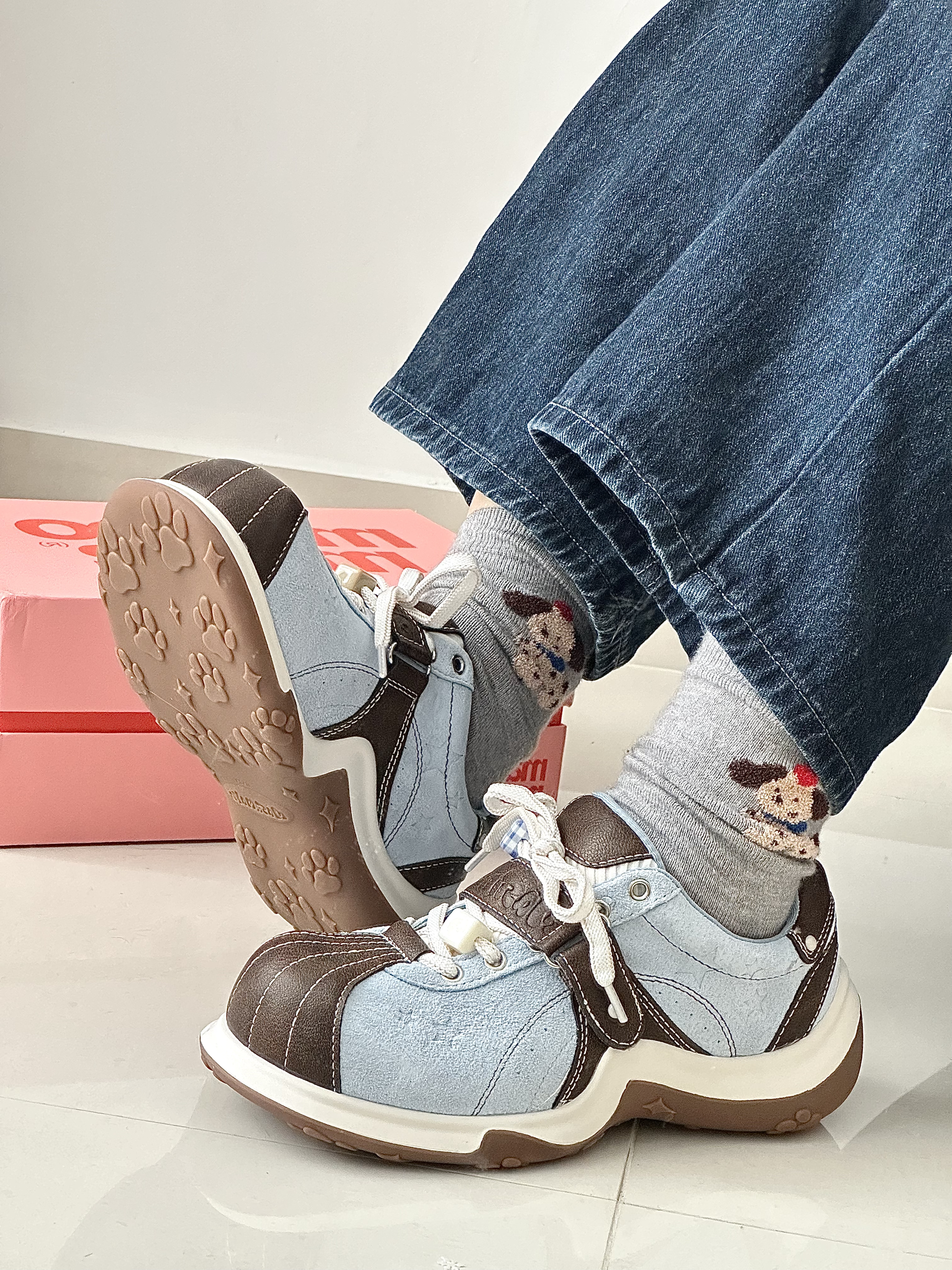 好喜欢这种清爽的baby蓝配色鞋子呀 鞋底还有猫爪的图案,好可爱 脚软乎乎的,好喜欢好适合春天 搭配裙子和裤子也很百搭穿去公园好合适 真的好喜欢我的新鞋子
