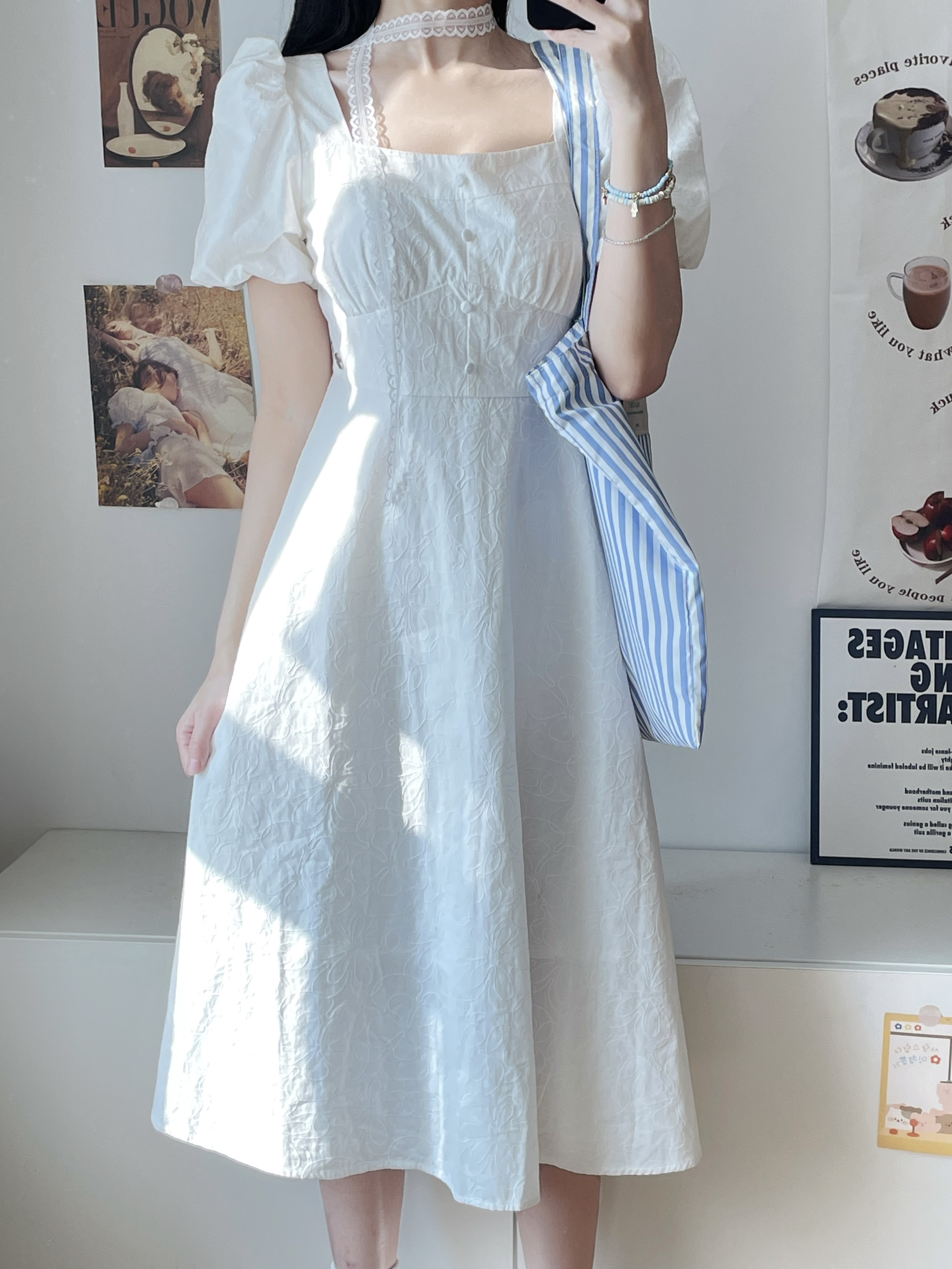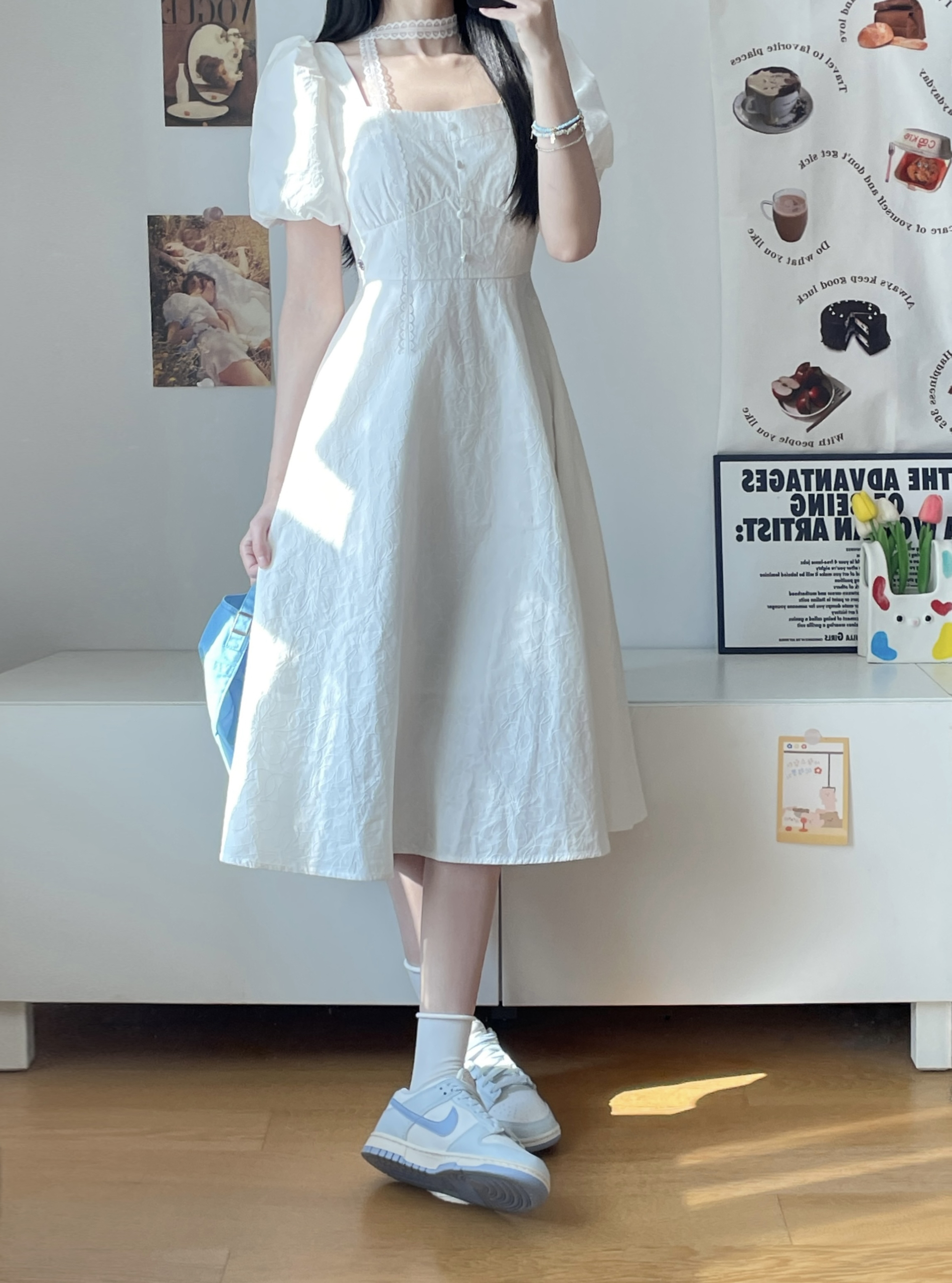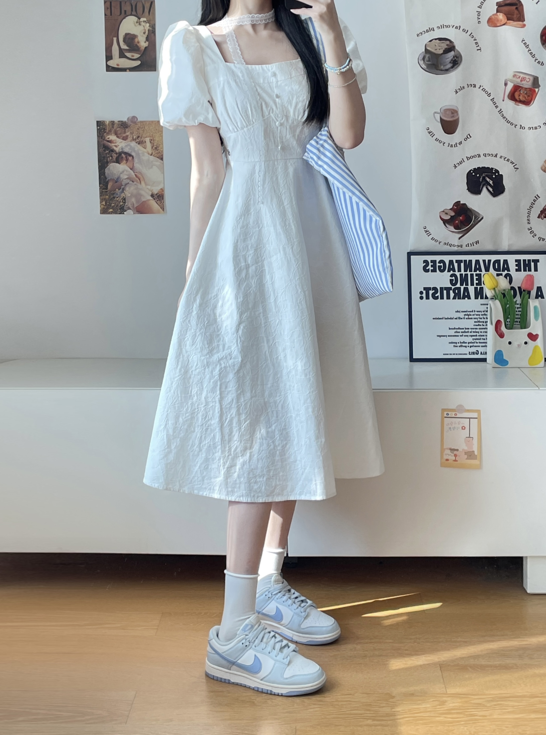 夏天穿这件初恋小白裙去见crush吧~ 纯白色系白月光既视感 鞋子穿的白蓝dunk 蓬蓬A字裙摆好有公主风~