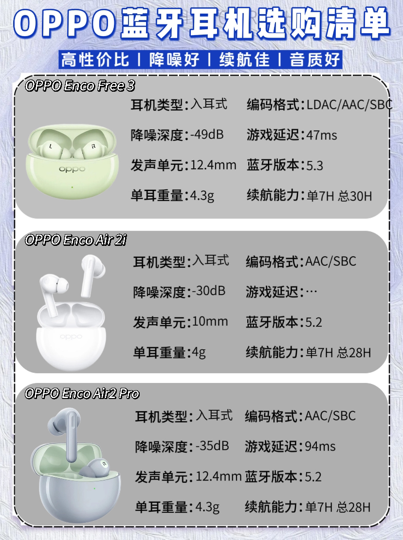 本篇笔记关联了OPPO Enco Free3 入耳式 蓝牙耳机 真无线 主动降噪 长续航 舒适 可收纳 青霜白、OPPO Enco Air2 半入耳式 蓝牙 耳机 新声版 真无线 运动 通话降噪 超长待机 低延时 双传 晨雾白、OPPO Enco Air2 Pro 入耳式 蓝牙耳机 真无线 超长待机 长续航 主动降噪 音乐 破晓灰等商品,为用户提供真实的使用体验和购买参考。