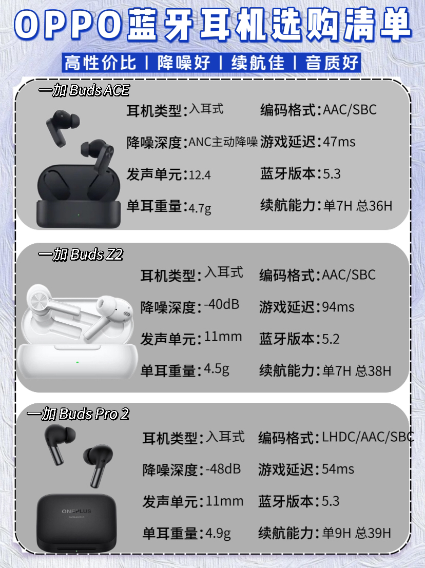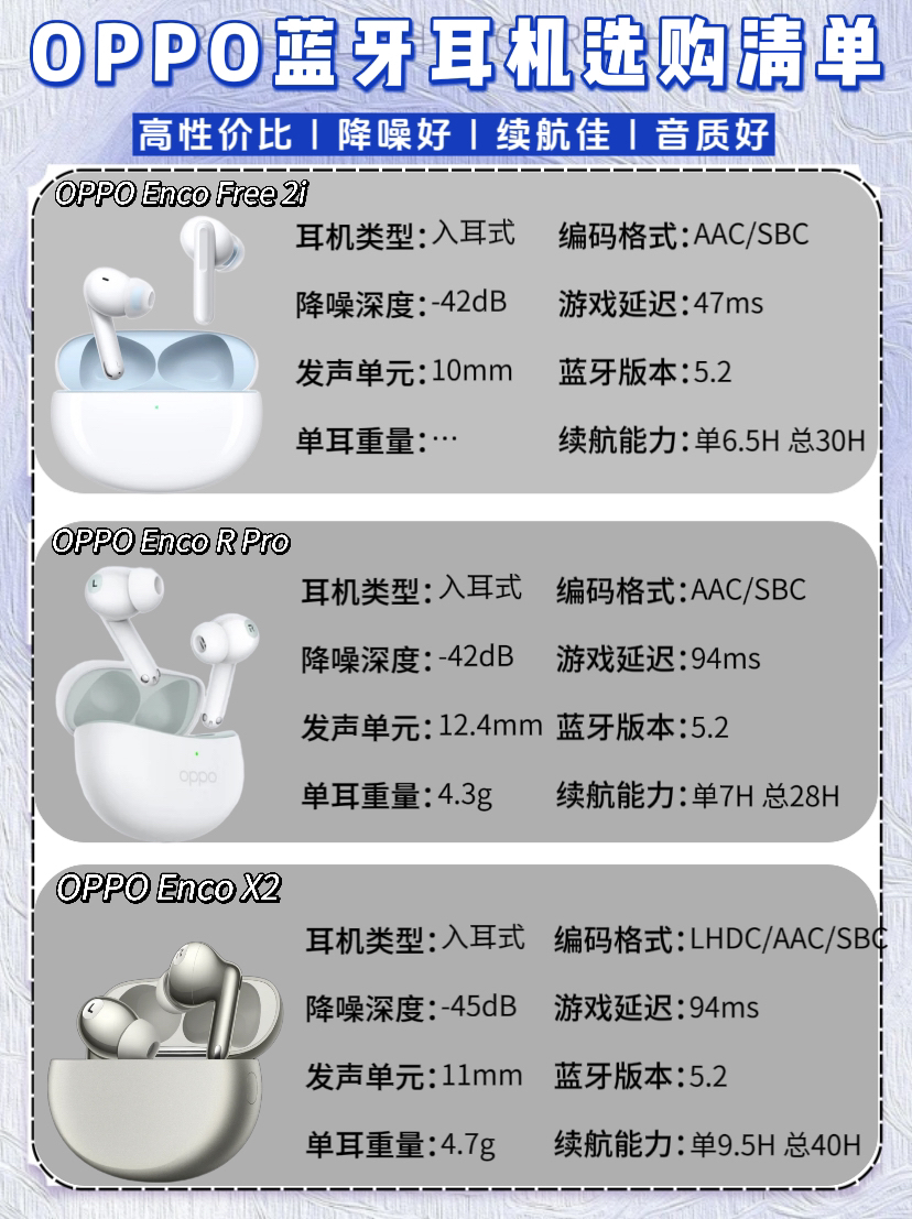 **1. 追求顶级音质与降噪** - **OPPO Enco X2** *推荐理由*: - 联合丹拿调音 + LHDC 4.0高清传输协议,音质通透 - **双重主动降噪(45dB深度)** + 智能环境音调节 - 抗菌耳帽 + 久戴不痛设计 *适合人群*:发烧友、商务通勤族 - **一加Buds Pro 2** *推荐理由*: - *...