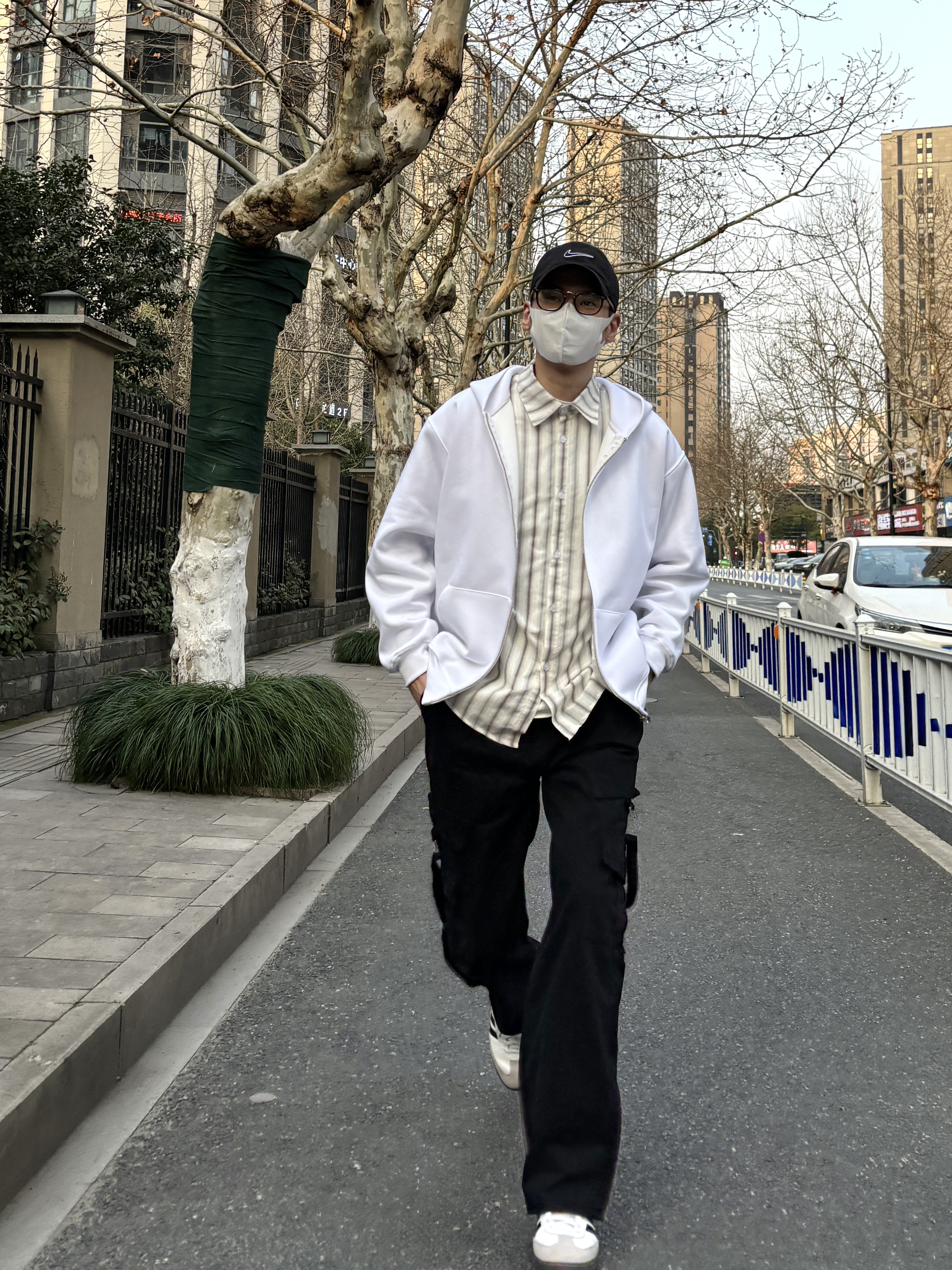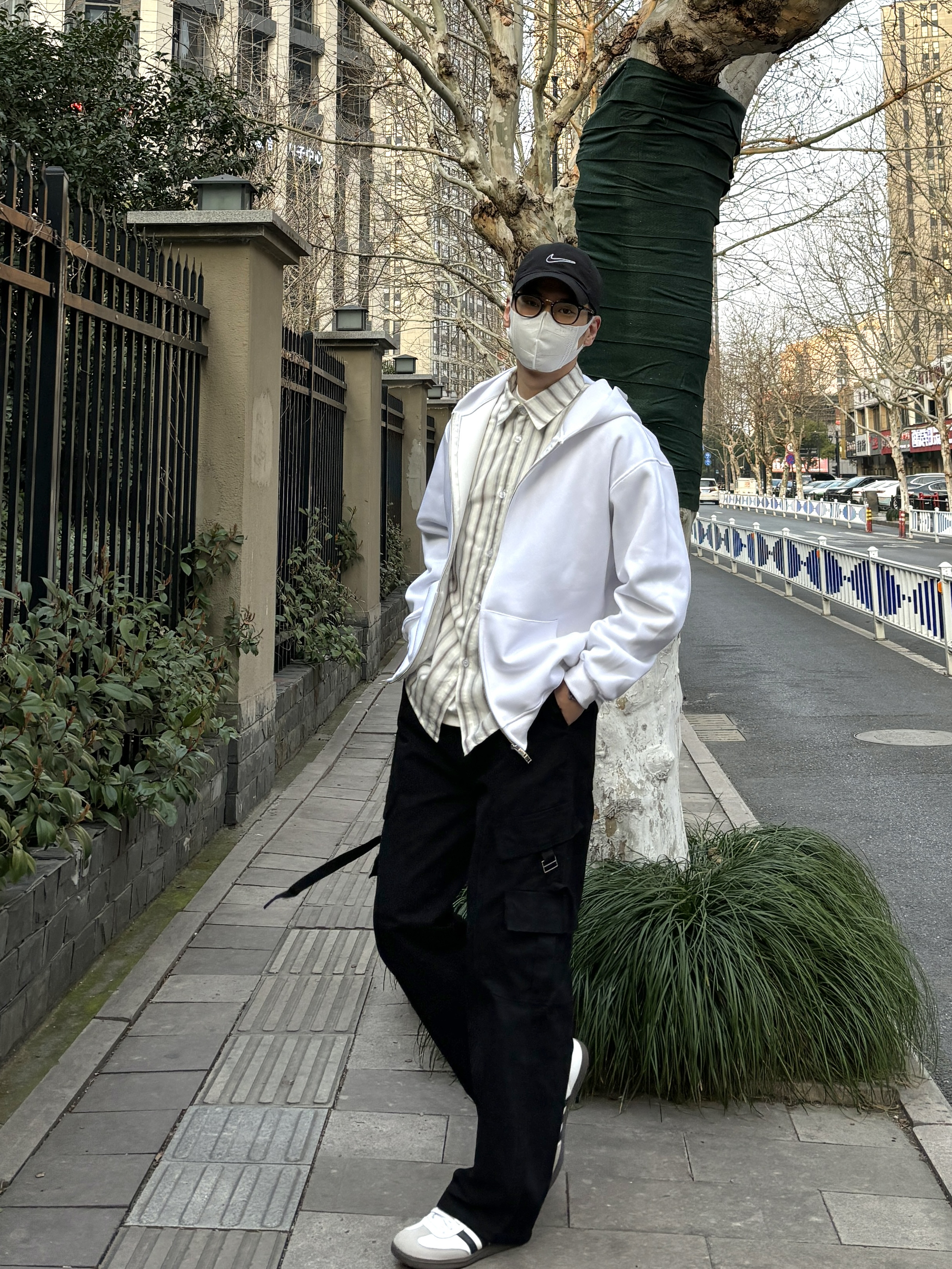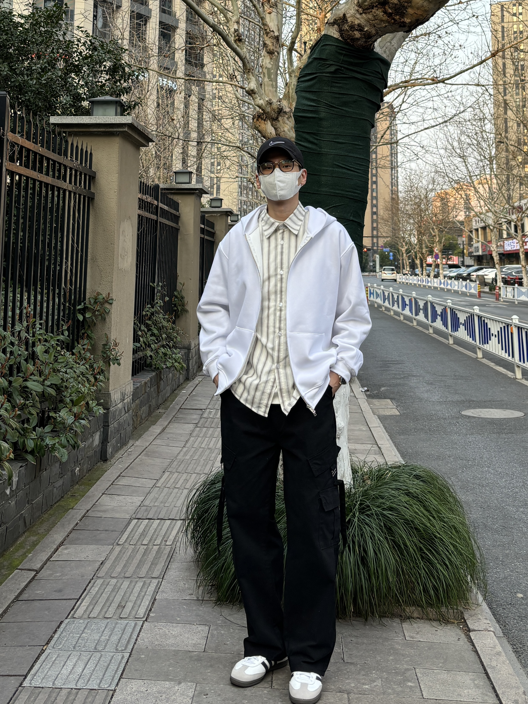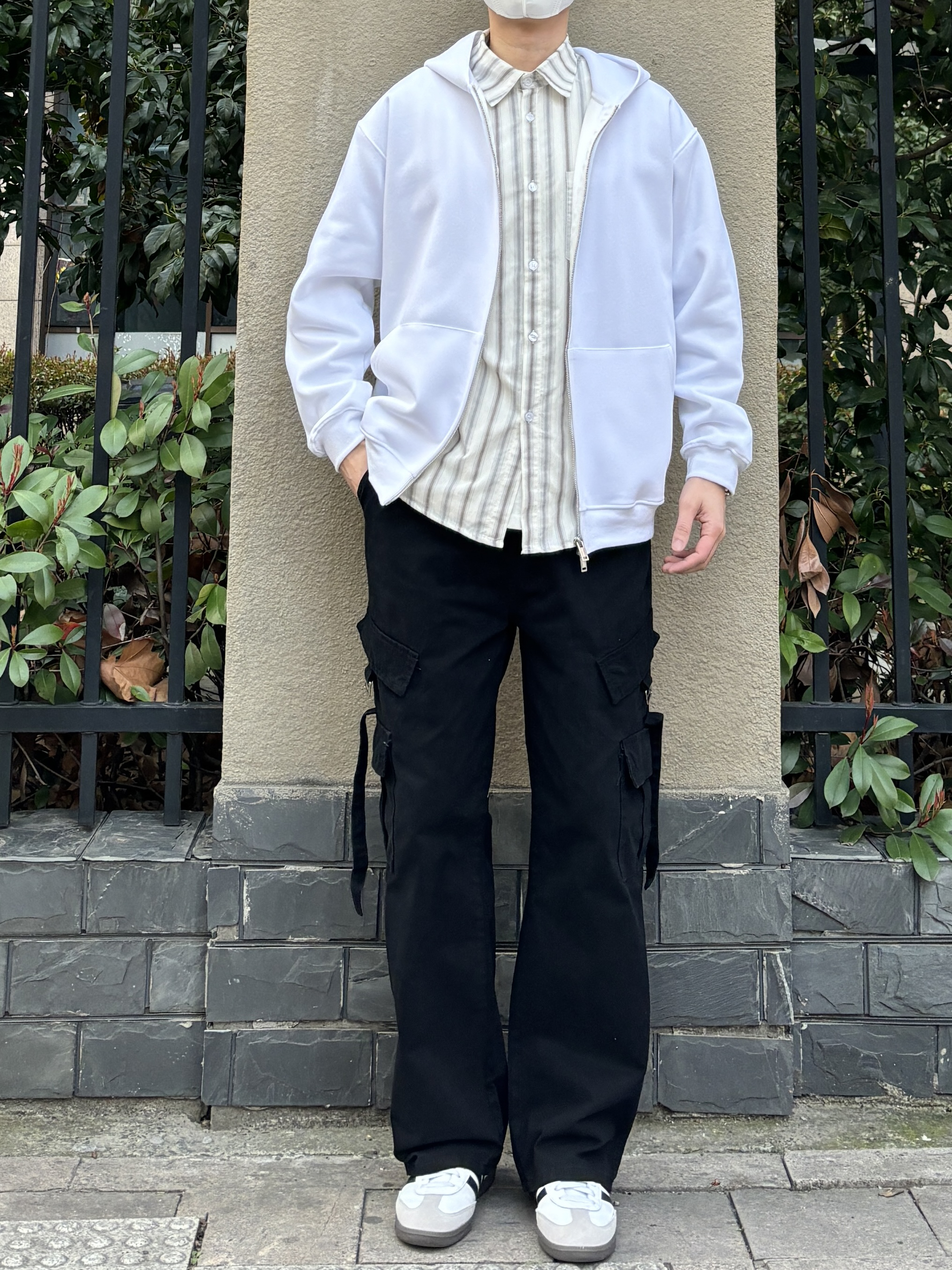 今天这套先用清爽干净的竖条纹休闲衬衫做内搭 ⬇️ 裤子选择简约大方的黑色直筒水洗多口袋飘带工装裤 ⬇️ 鞋子上脚经典百搭的黑白samba德训鞋 ⬇️ 接着套上白色宽松阔版双拉链开衫连帽卫衣 ⬇️ 最后戴一顶棒球帽呼应下裤子的颜色 - 今日搭配 衣服裤子:NICE LILI 鞋子:adidas samba