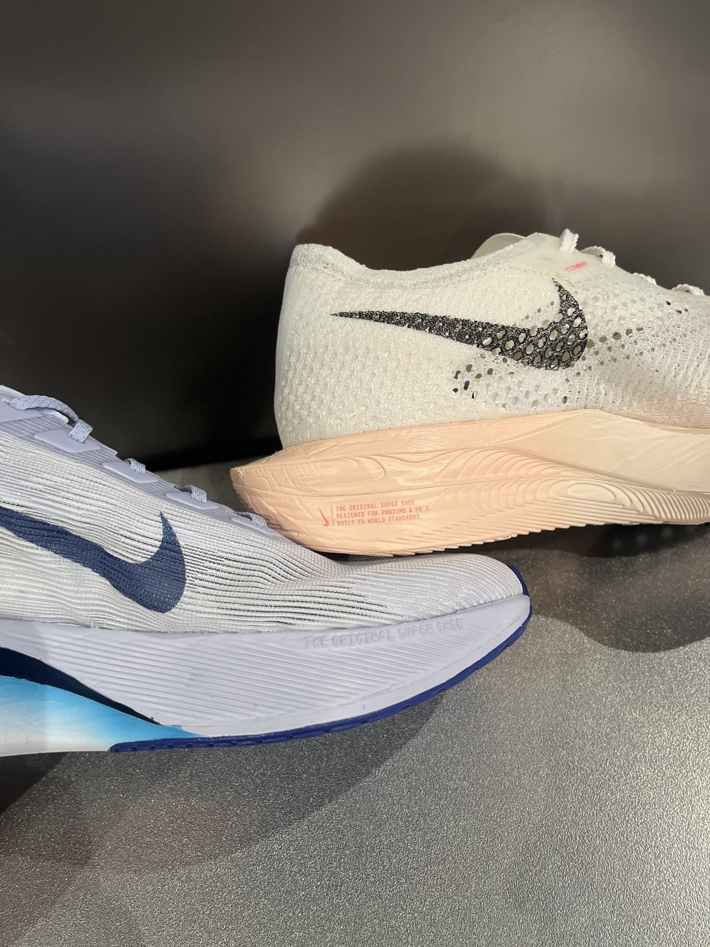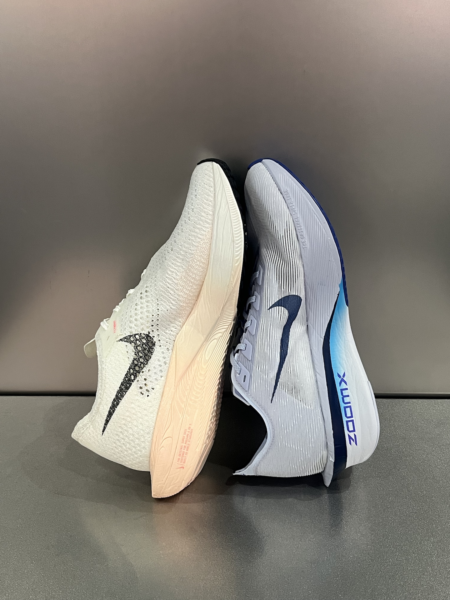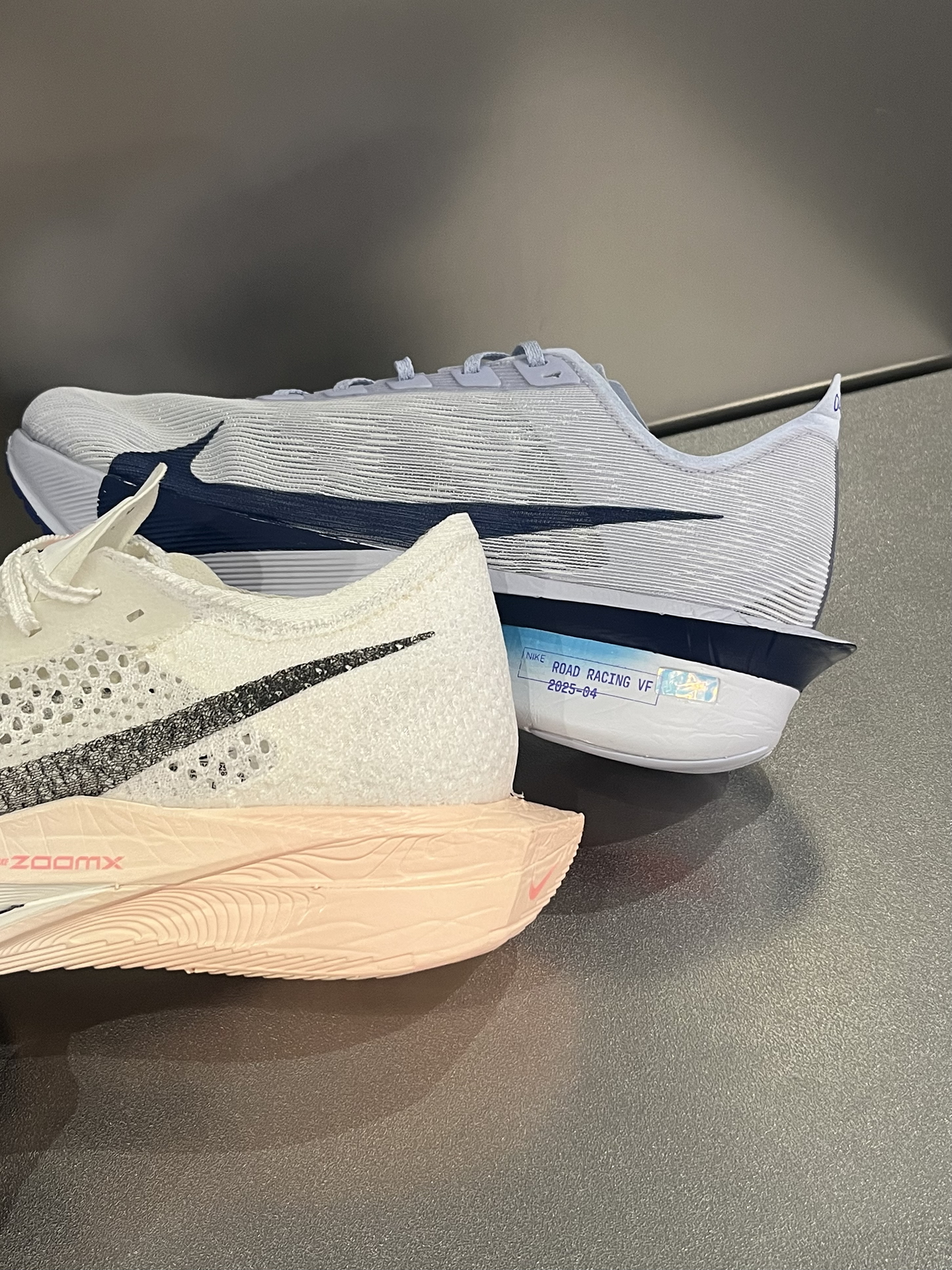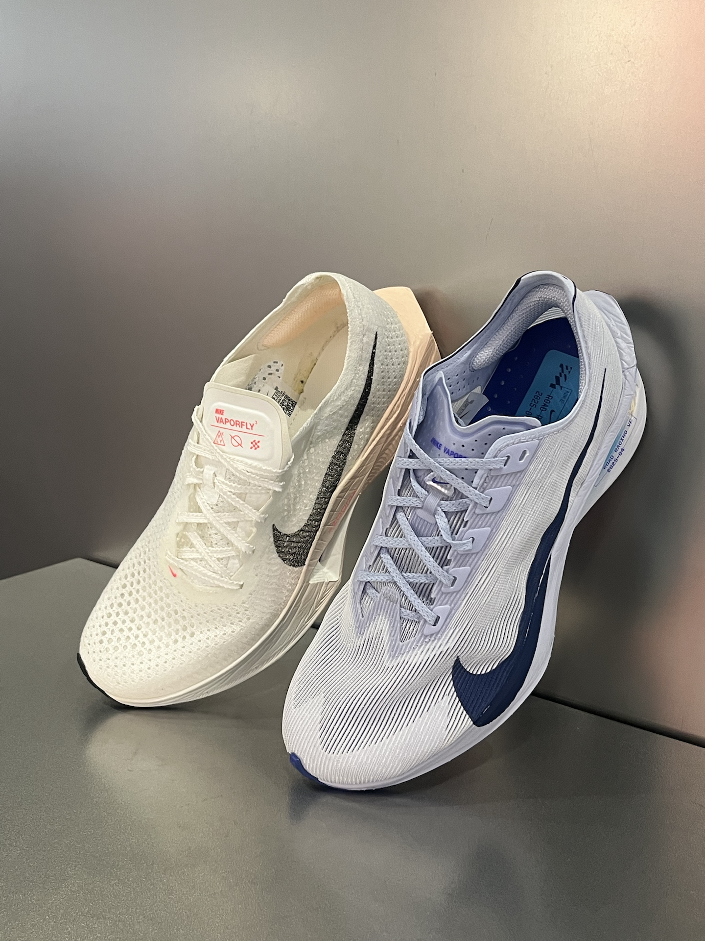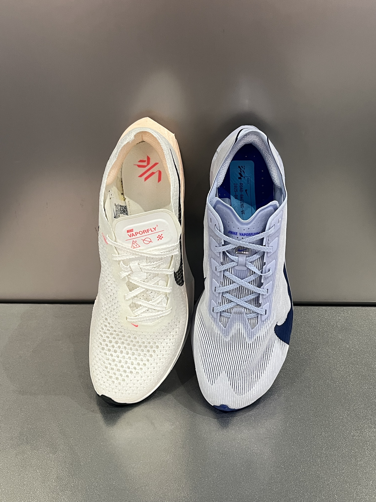 🆚当VaporFly4和3代放在一起对比,4代相较于后者配置升级,但3代目前价格更有优势,相信需要马拉松竞速跑鞋的你会有答案了‼️ 🔥3代鞋面透气孔更大,4代则更精细包裹感更强一些;4代后跟内收一点,所以足弓稍微宽一点容易铬着;重量和脚感方面,4代比3代减轻10%,并且更韧弹。 🔍相同点就是,都是专业次顶级碳板跑鞋,对于配速都有一定要求,适合全马330选手;同样使用了ZoomX泡棉,所以跑步穿着公...
