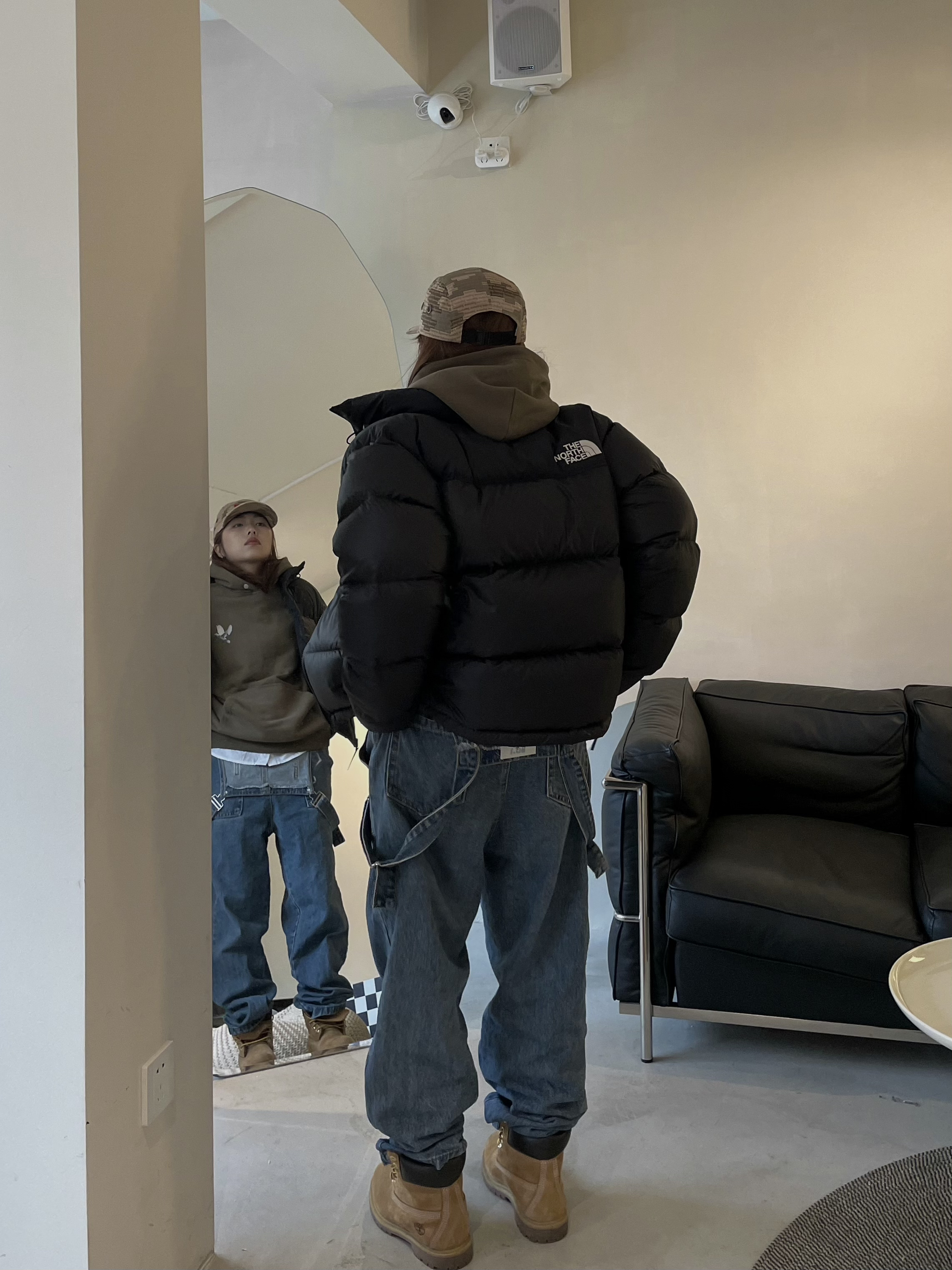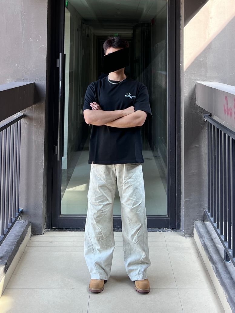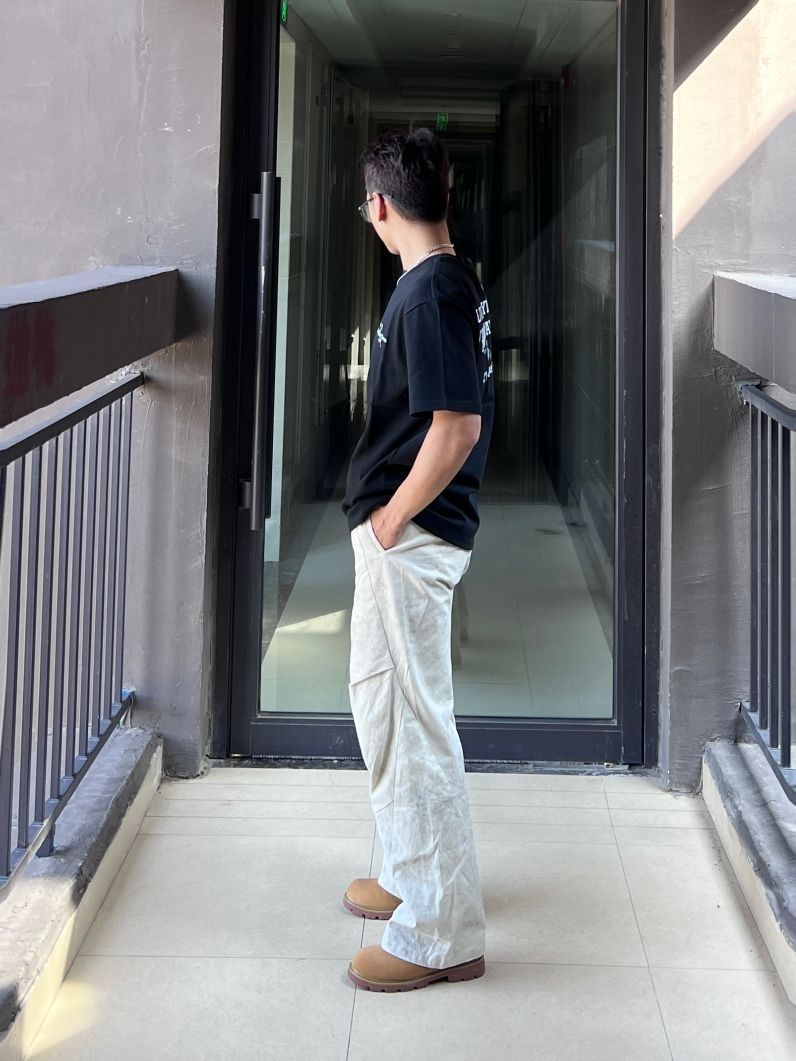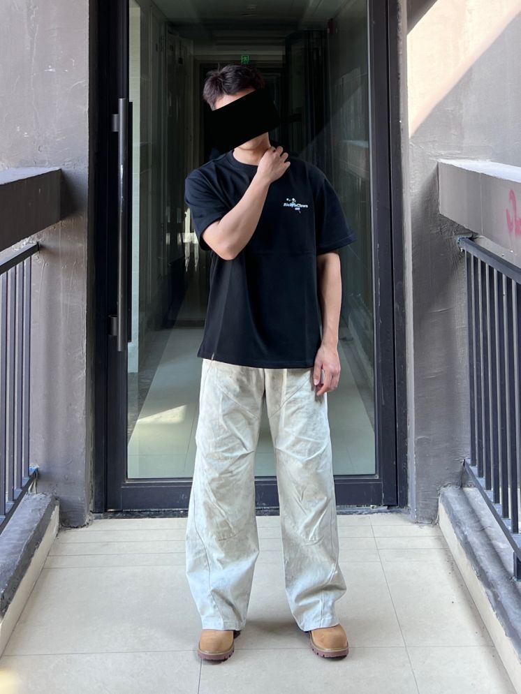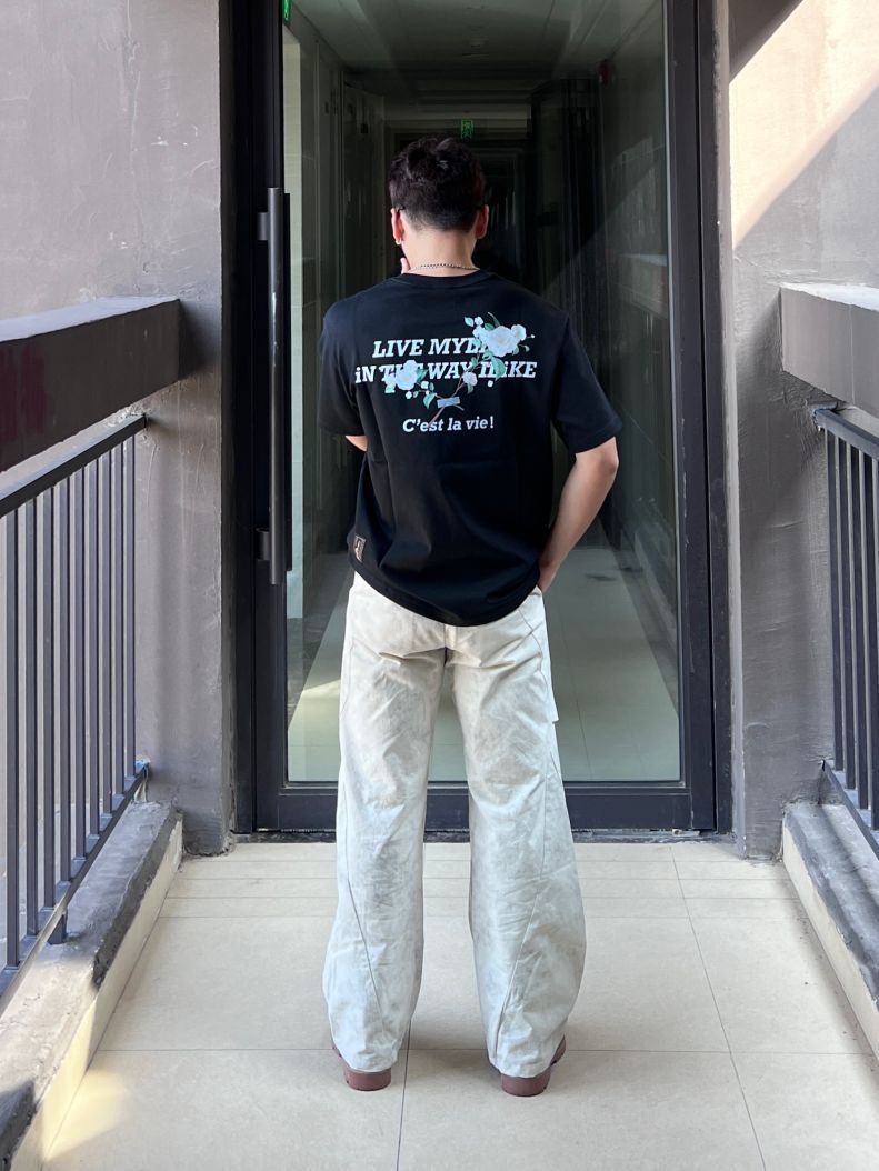 上身选择山茶印花短袖,简约舒适的同时具有一定的设计感 裤子选择了一条做旧工装裤 整体简约干净,夏天必备