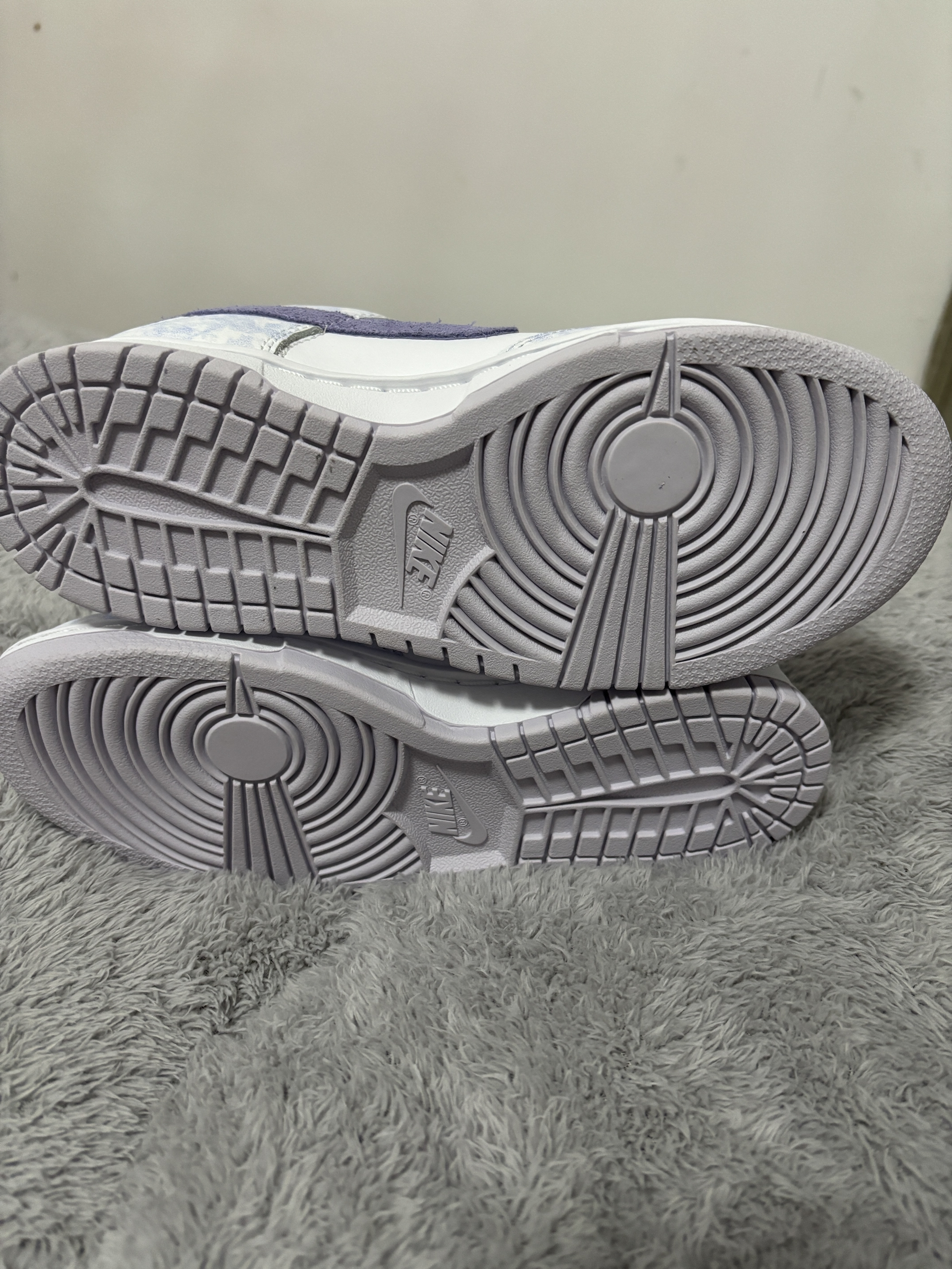 姐妹们,救命,这双鞋真的美到我心巴上了,穿出门被追着问链接的那种! ✨配色绝杀:白紫CP,一眼沦陷! 纯白鞋面像打光板一样显腿白,配上薰衣草紫的Swoosh和鞋底,温柔里带点拽姐气质。扎染纹路是心机重点!近看像泼墨晕染的紫色银河,连鞋舌标都做了渐变处理,穿出门绝对不撞款。 💜细节拉满:扎染+水晶底,心机到脚趾! 荔枝纹皮面自带高级柔雾感(重点是不用担心折痕!),鞋底居然是半透明淡紫色水晶底!走...