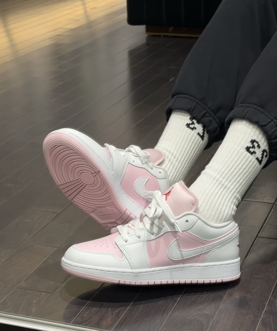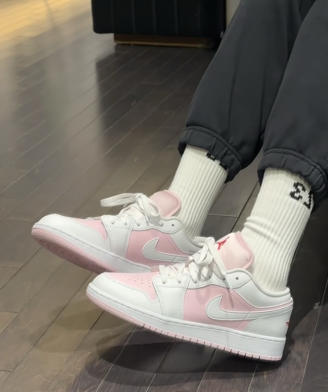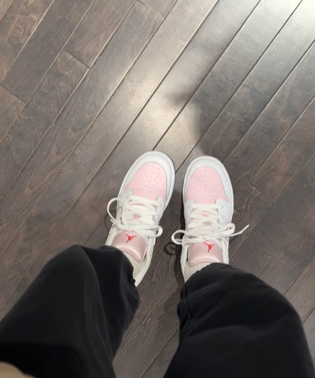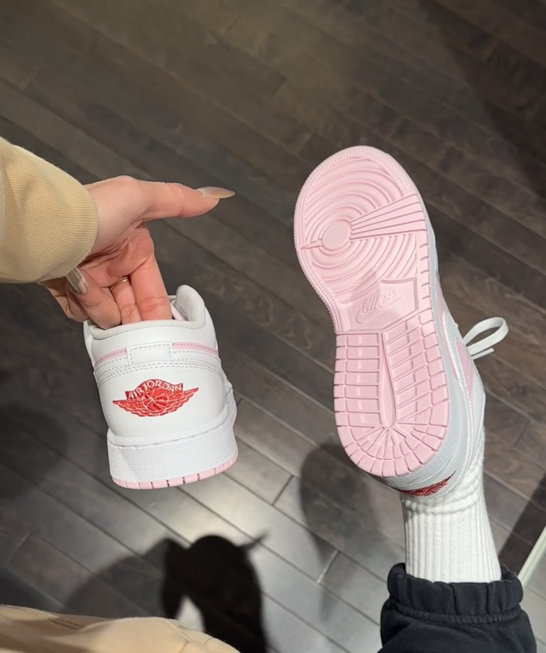 家人们,最近入手这双AJ低帮鞋,粉白配色太绝了!粉色鞋面俏皮可爱,加上经典的红色飞人标志,吸睛又独特。上脚舒适度也超棒,不管搭休闲裤还是小裙子都很合适。有没有同款的宝,一起来聊聊穿搭心得呀! #AJ鞋 #球鞋分享