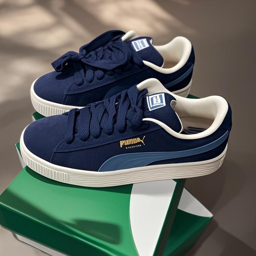 在时尚的长河中,总有一些单品能够跨越时间的界限,始终散发着独特的魅力。彪马这款板鞋,正是这样的存在,它以复古之姿,诠释着现代时尚的新态度。 这双彪马板鞋,外观设计独具匠心。深蓝色的鞋面采用优质的麂皮材质,触感柔软且质感十足,仿佛在诉说着复古年代的故事。鞋侧那标志性的流线型设计,如同灵动的笔触,不仅增添了鞋子的层次感,还彰显了彪马品牌的经典元素。 鞋舌上的品牌标识,简洁而醒目,与鞋身侧面烫金...
