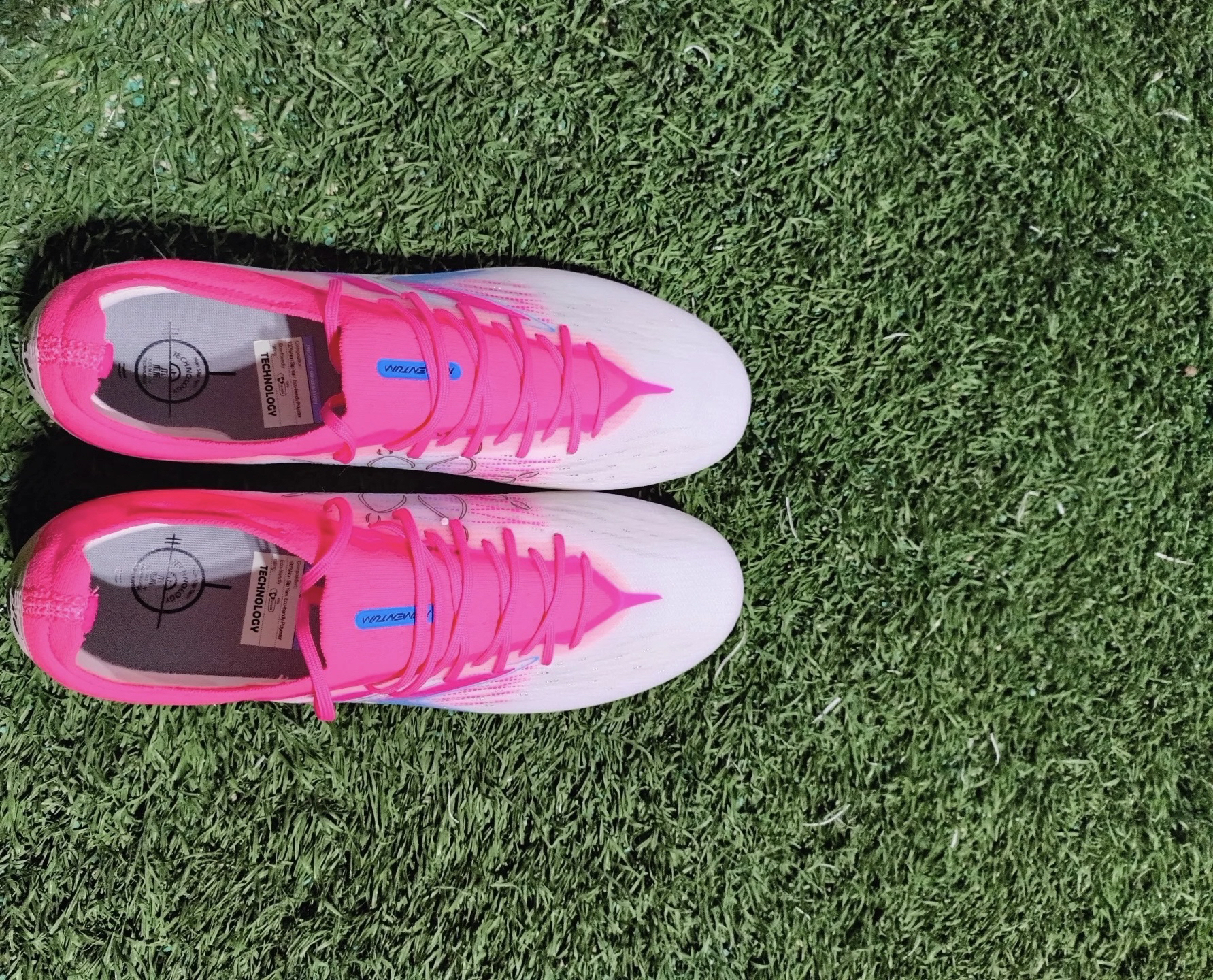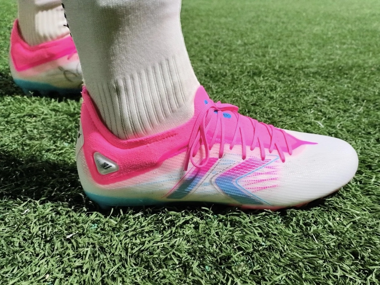 新入手的卡尔美掠影2.0到了,粉蓝配色感觉设计师终于开窍了,鞋子非常的轻薄,这双是锋线系列,取快递的时候拿在手里我都怀疑是不是鞋子,这么轻,这次没有用疾电系列的表面防滑颗粒,但是触感非常好,实战做了测试,新鞋子居然不磨脚,好评,停球,盘带,突破明显是以前老鞋袋鼠皮不一样的感受,射门需要重新调整当时,这双更注重突破的带球精准,性价比超高,兄弟们可以放心冲