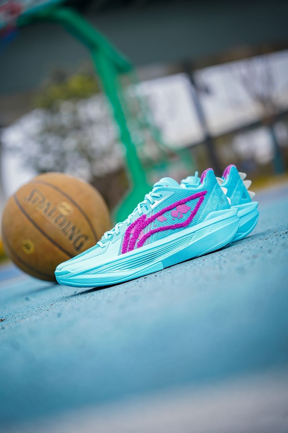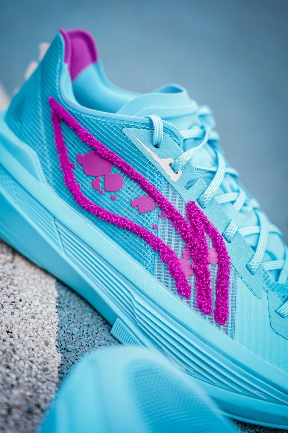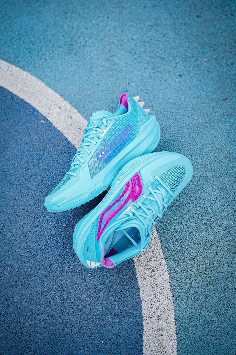这双超轻25怪兽大学颜值真的很帅啊~配色一眼就能看出以毛怪苏利文的蓝紫色毛发为灵感,李宁logo用绒毛材质呈现,质感相当特别,最有意思的还是后跟的牙齿装饰实在太形象了,整体上我觉得不仅是完美还原人物形象,上脚的颜值也是非常帅的~不过超轻25的实战体验是比较两极分化的,我个人感觉是不太适合我,包裹性方面不是很好。