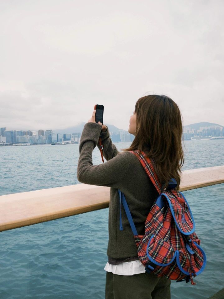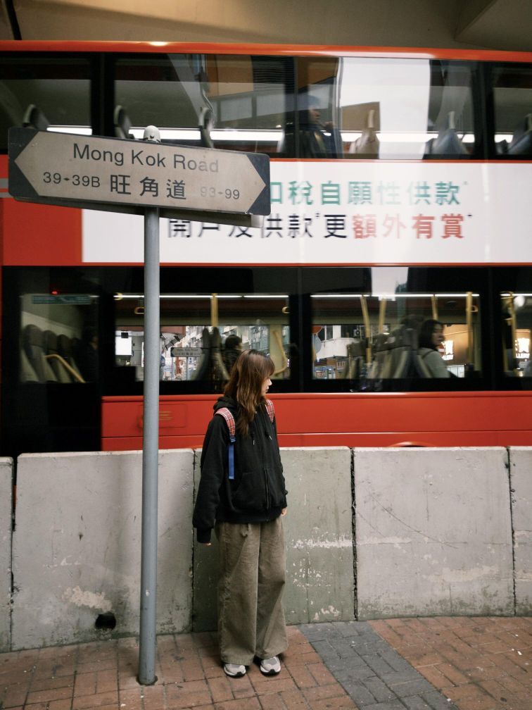 香港的街道 巴士🚌商店 霓虹灯颜色很鲜艳 所以搭配上就偏向深色调 黑白灰 天气大概16 17度 内搭是毛绒绒的假两件➕屁帘 都得带点红 但实际去了那边并没有看到很多红色穿搭 似乎穿的都挺朴素的(颜色上) 也算成功融入当地了