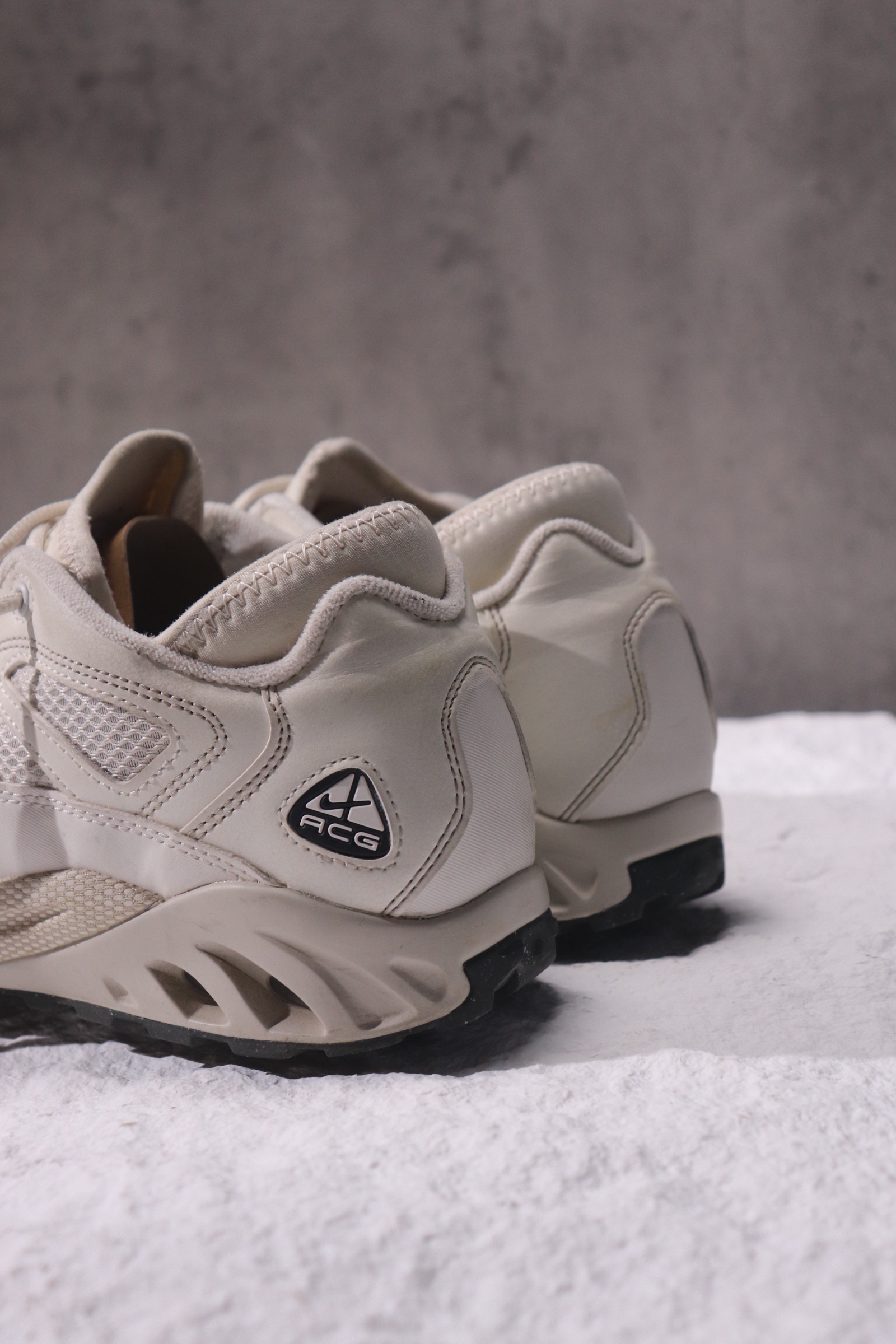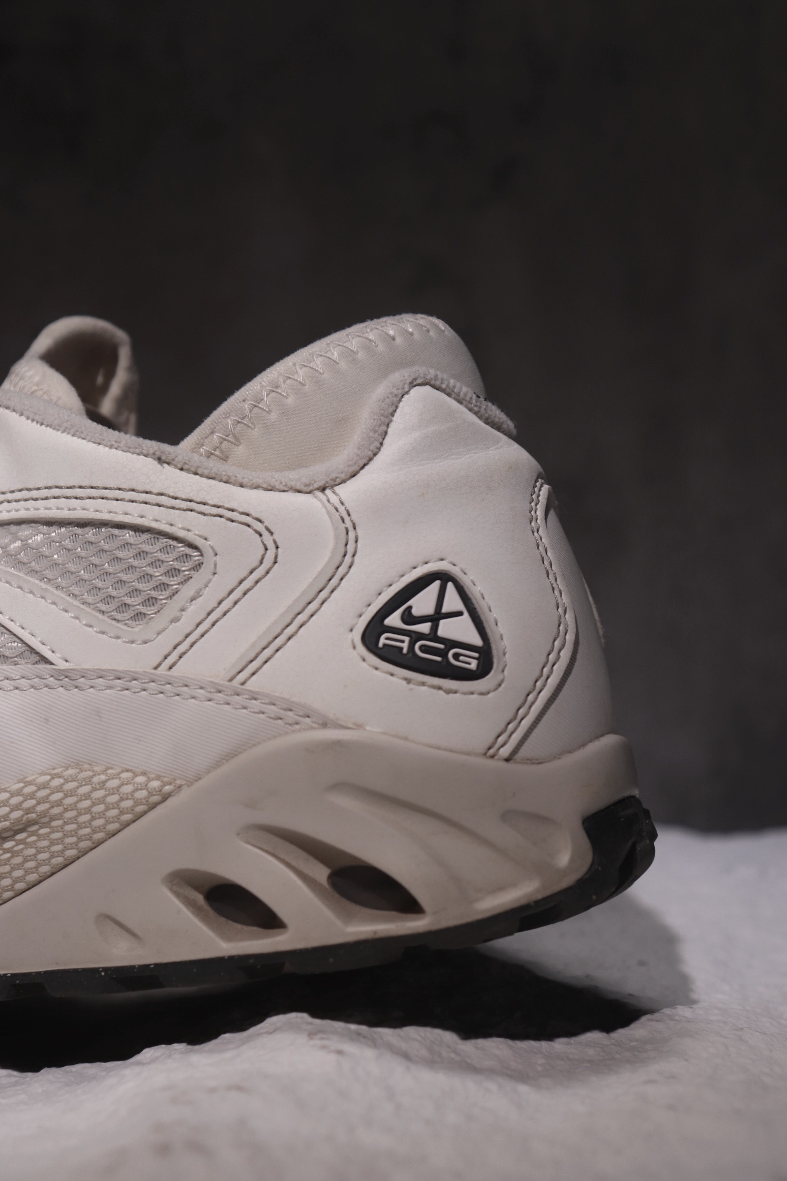 这次带来的是一双1999年就已经有了的老鞋,重新复刻后复古的味道依旧很足。 - 这双鞋的鞋面设计很出彩,用了三种材质的拼接,层次感十足,而且其中透气网纱和装饰性的孔洞设计的很有意思,在同一条曲线上律动,优雅且不单调。 - 后跟这里的袜套设计其实就穿着来说,其实功能性一般,没啥包裹感,但就视觉上来看很符合整体的“三角形”设计语言,就像acg的logo一样,是两个直角三角形拼成的“山”形图案。 - 后...