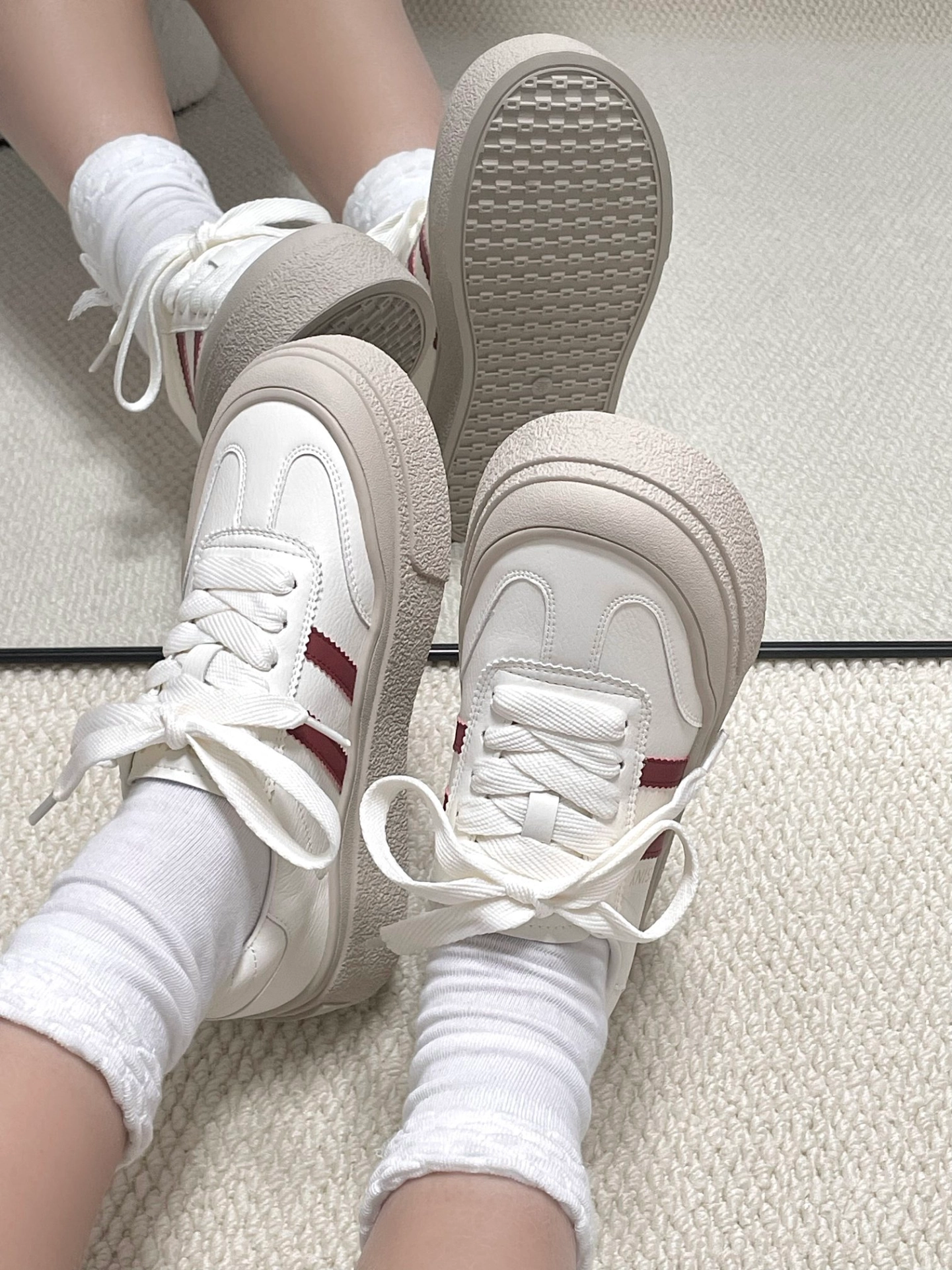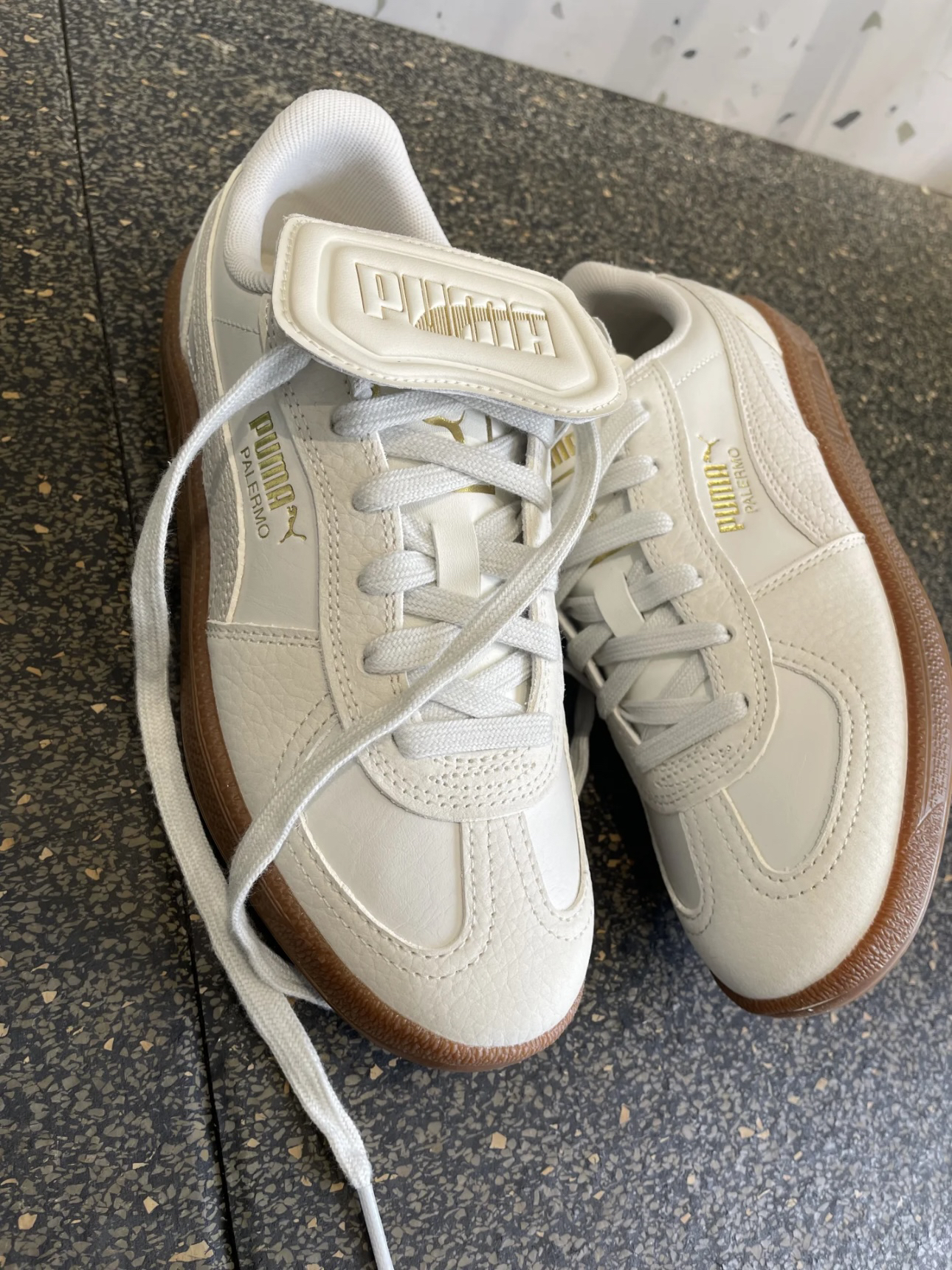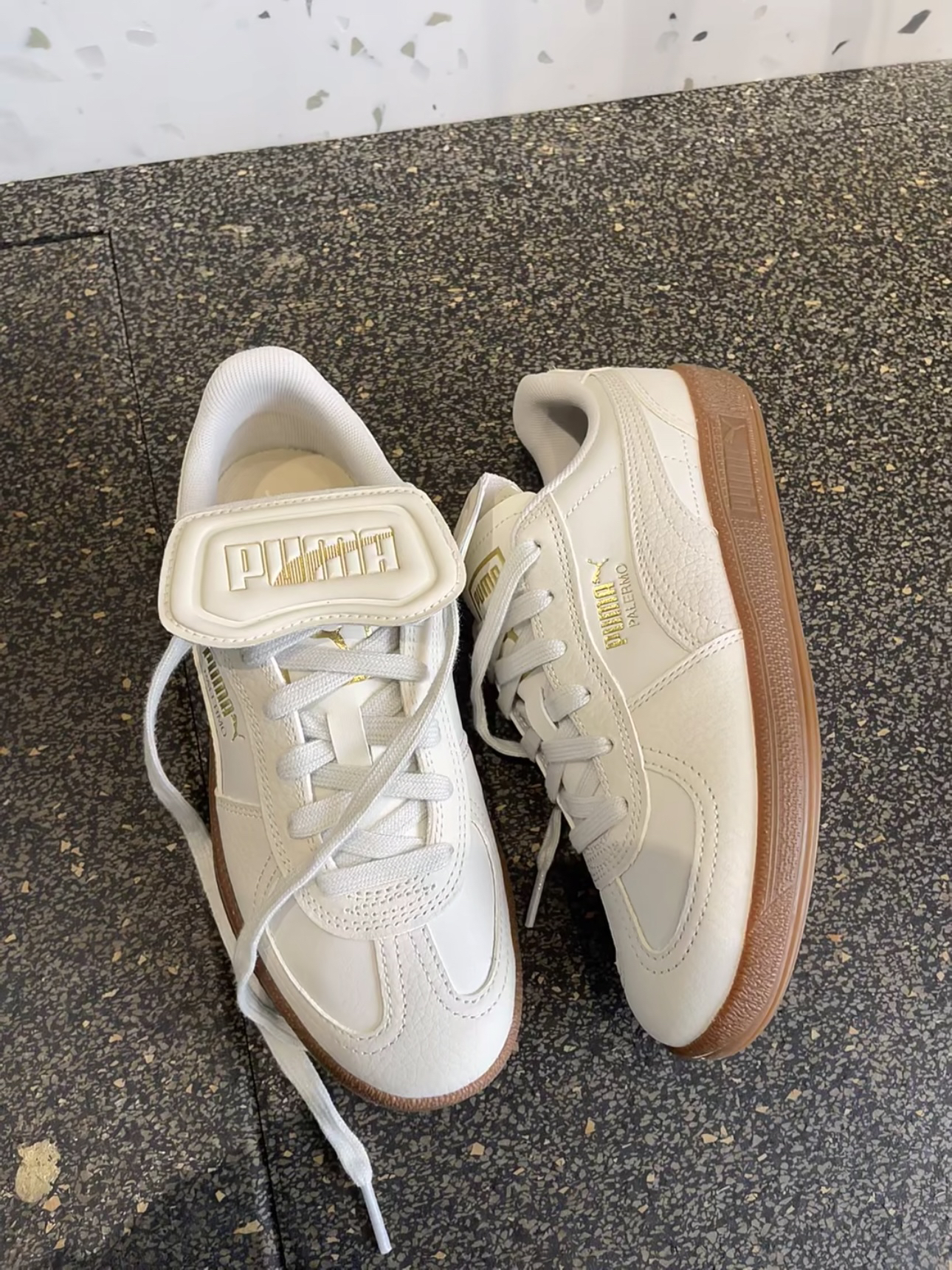 Palermo米白色德训鞋 魔术贴的鞋舌,可拆卸 金色LOGO 的小标,个性十足 鞋身皮面,易于打理 这个颜色上脚很好看,也很好搭配裤装 #复古德训鞋 #彪马 #超级舒服的德训鞋