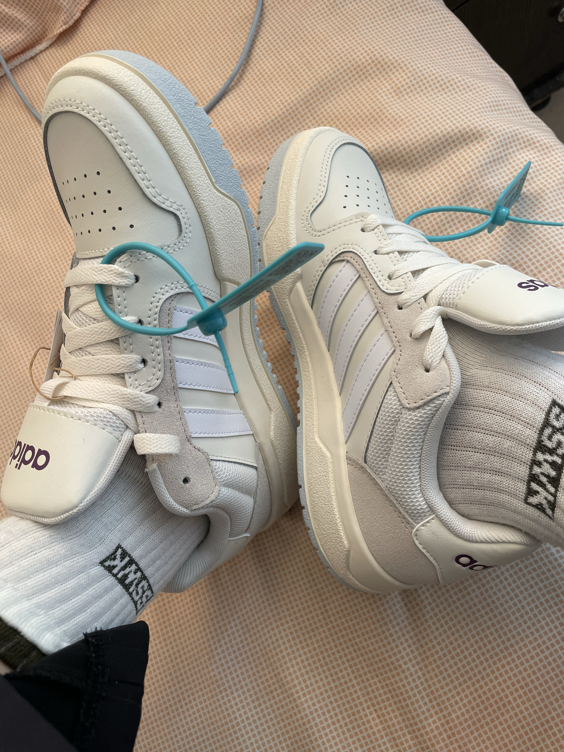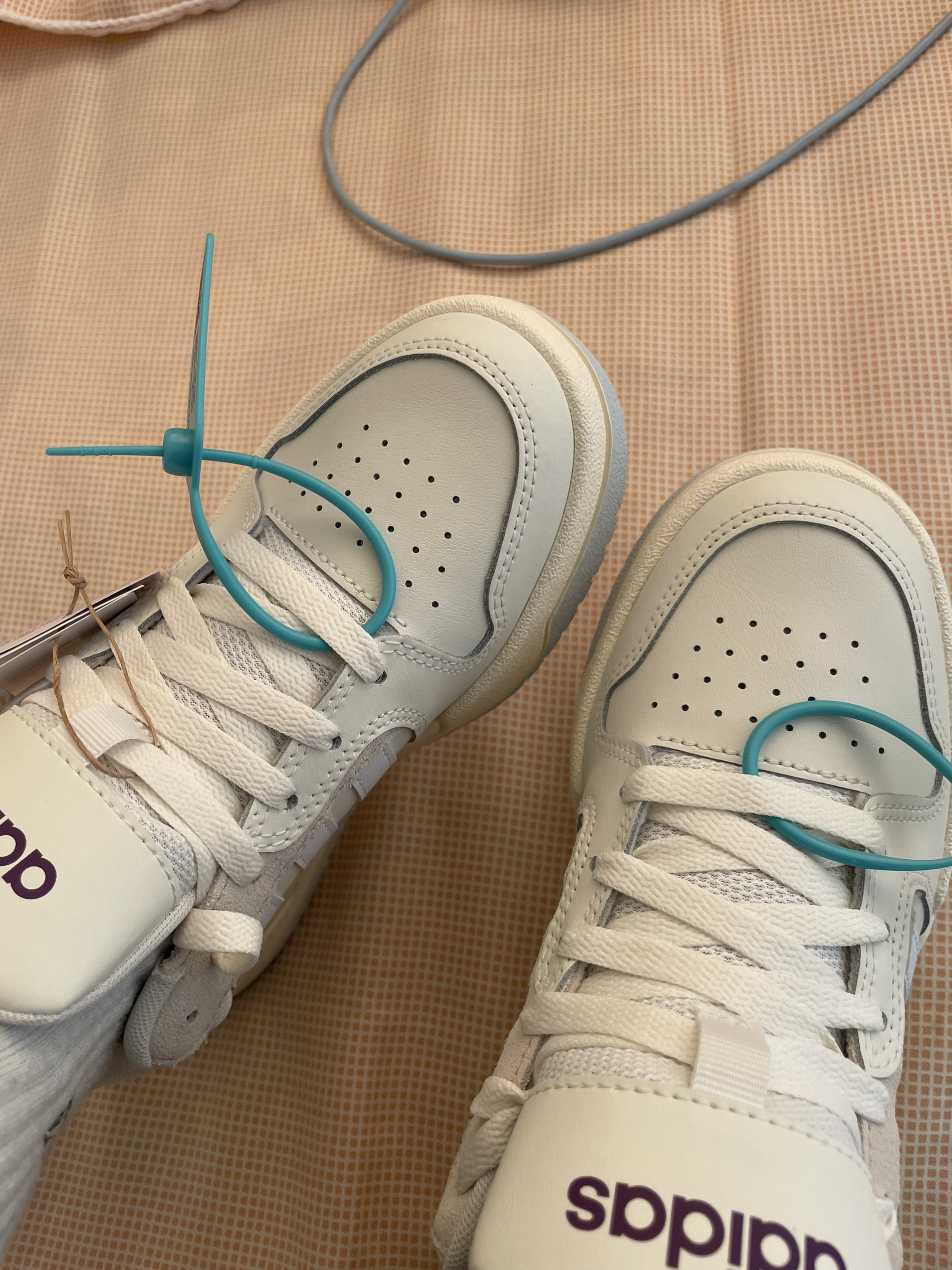 这双鞋子是阿迪达斯品牌的运动鞋。阿迪达斯是德国著名的运动用品品牌,以高品质和时尚设计著称。这双鞋整体以白色为主色调,简约百搭,适合搭配多种风格的服饰。鞋舌上醒目的紫色“adidas”标志,增添了一抹亮色,使其在简约中不失个性。鞋面部分采用透气孔设计,有助于提升穿着时的透气性,減少脚部闷热感。鞋侧标志性的三条纹元素,不仅是品牌的象征,也在一定程度上增强了鞋子的支撑性。从用途来看,它既适合日常休闲穿着...