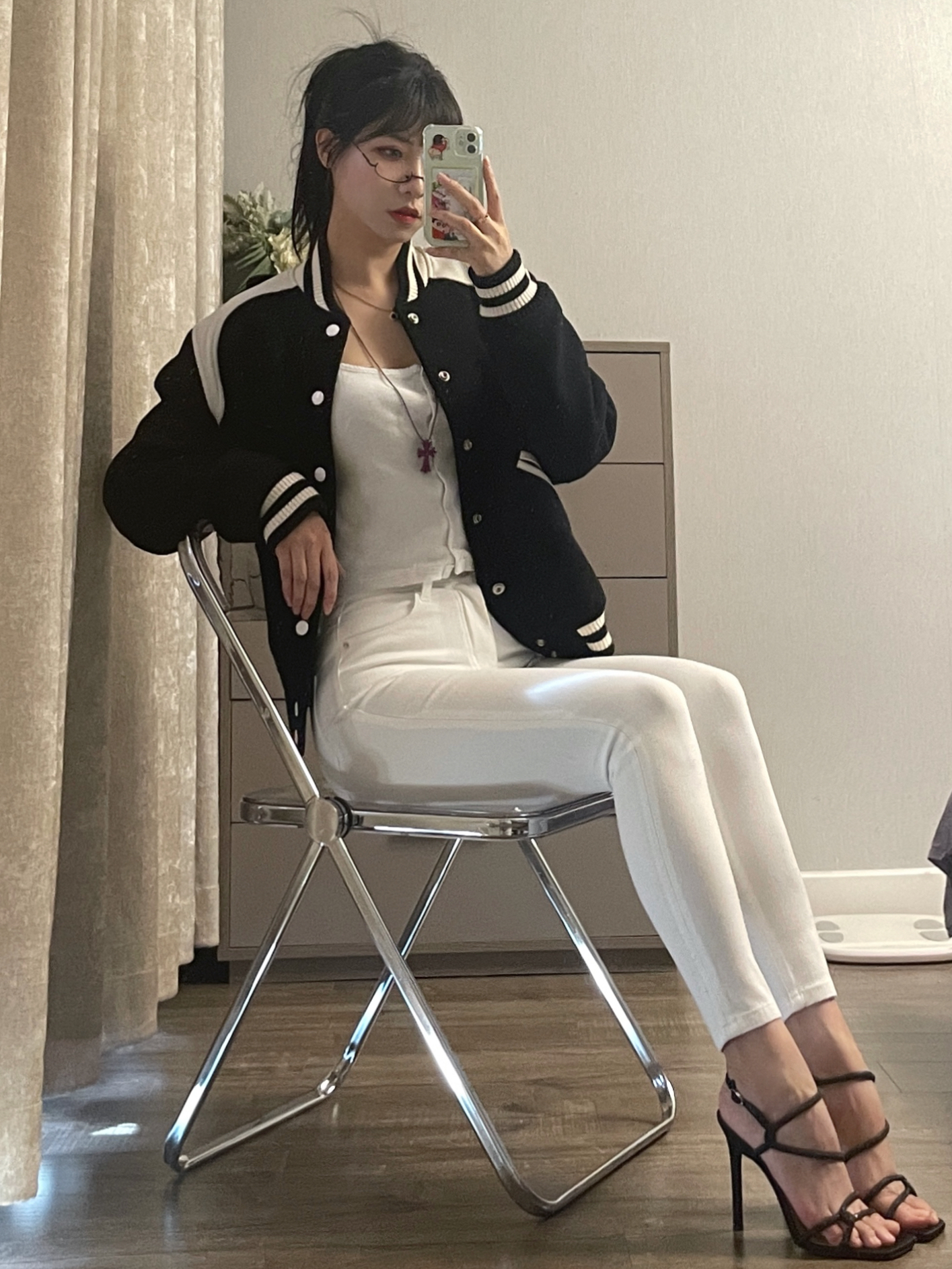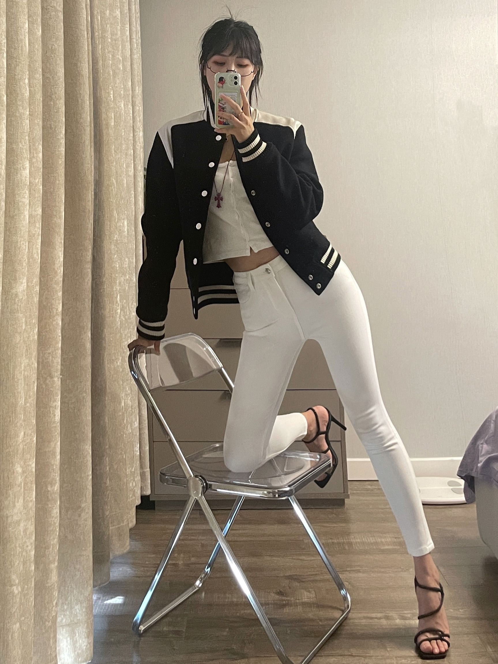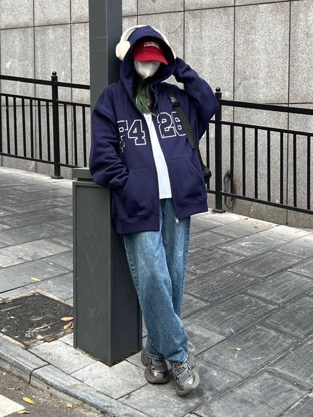 黑白色棒球服搭配小脚牛仔裤 一整个酷飒的氛围拿捏住啦 除了搭配运动鞋帆布鞋之外 搭配高跟鞋也很好看呀 在室外拍照这样穿 一整个氛围感拿捏住啦~