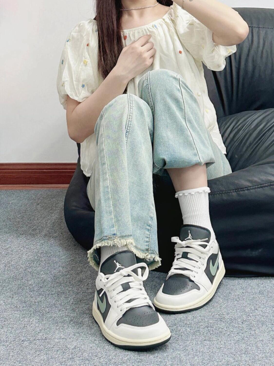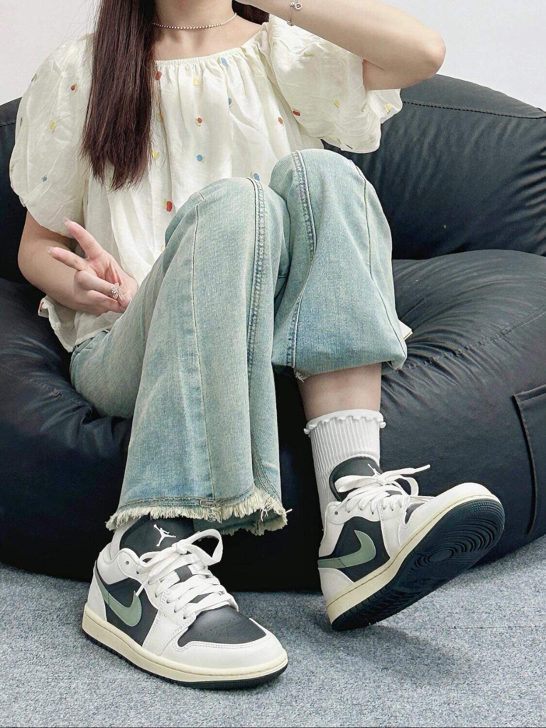 这一身太适合出游玩耍啦! 泡泡袖上衣太减龄了 一整个温柔姐姐型~ 还有刚买的鞋子也到啦 就是Aj1的板鞋黑绿配色真的很复古诶 搭配起来也很轻松方便~ 夏日出游穿它不要太舒适