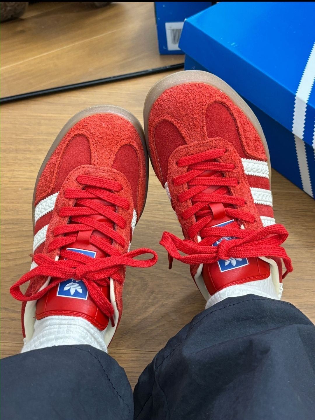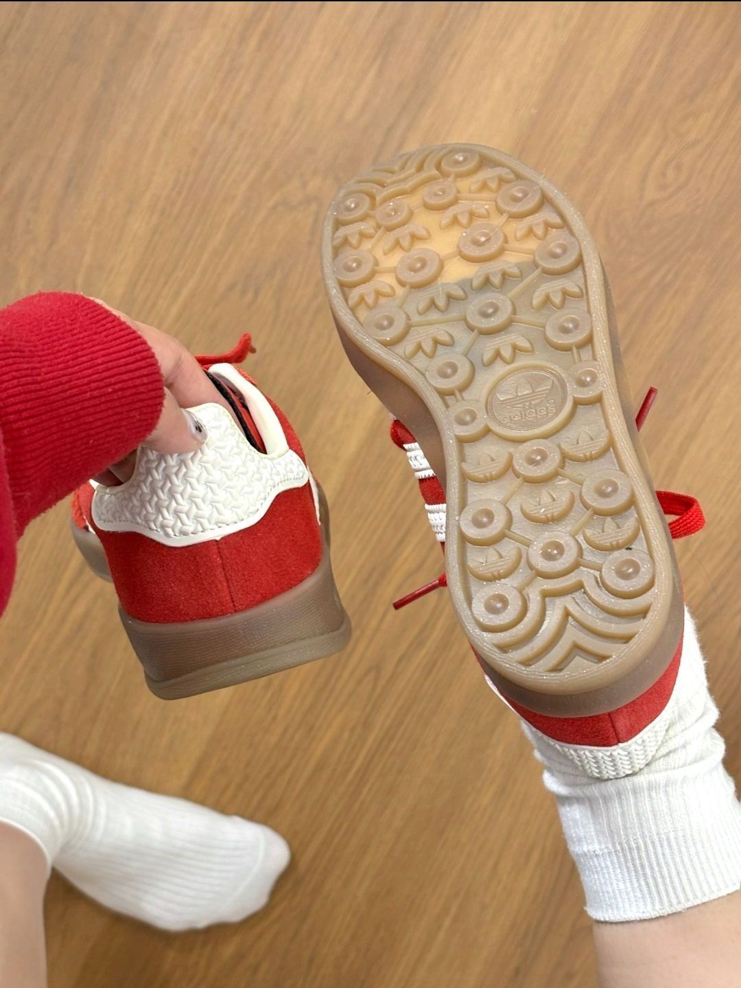 夏天蹲嘟爱惨了红色德训鞋🌸 春天🍀搭配白色半身裙不要太好看啊 实物图好看迷糊了!!🌷 又轻便又好穿脚感非常🌈