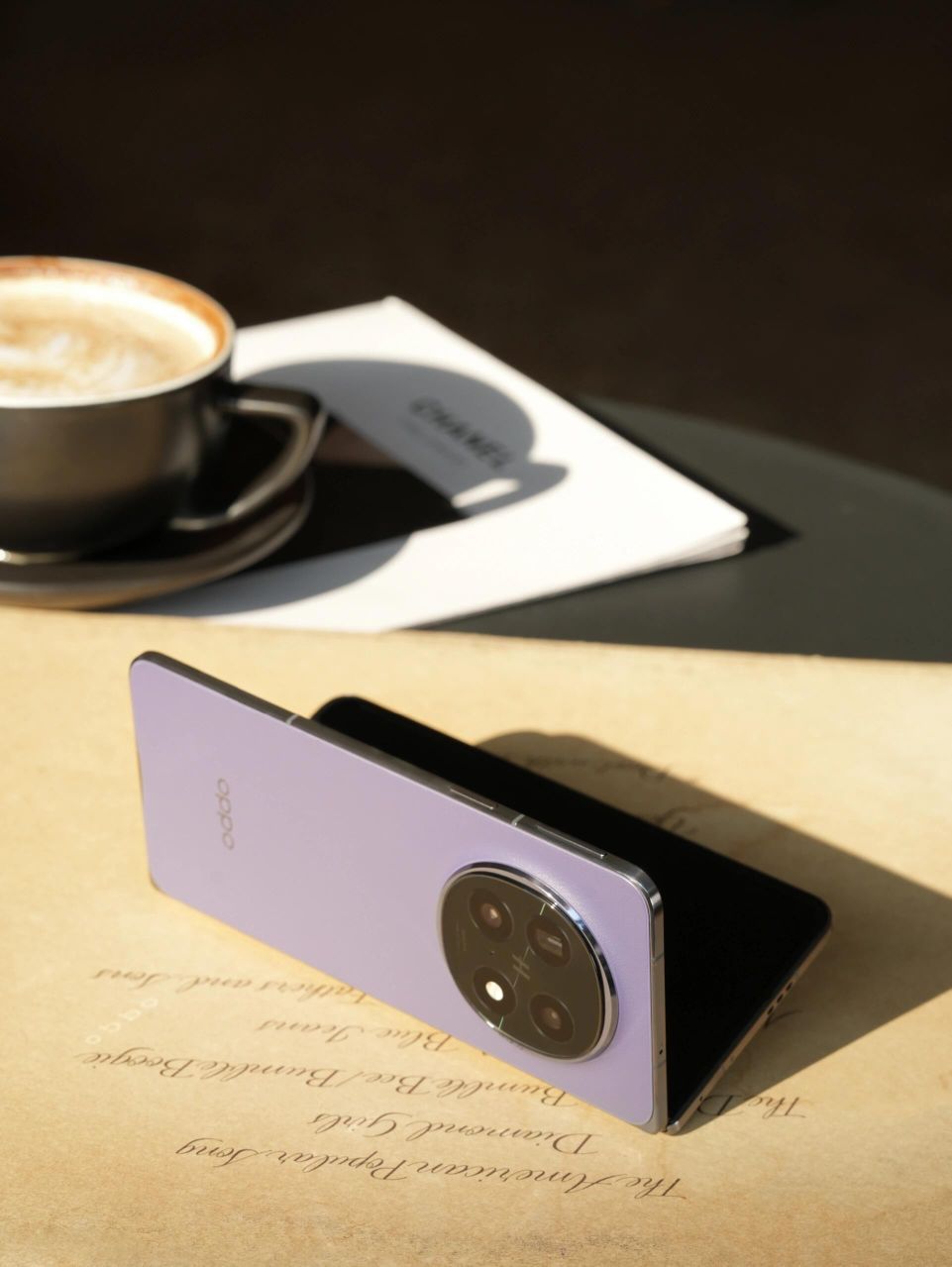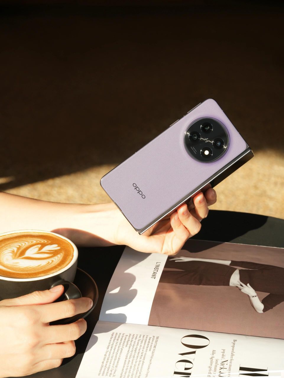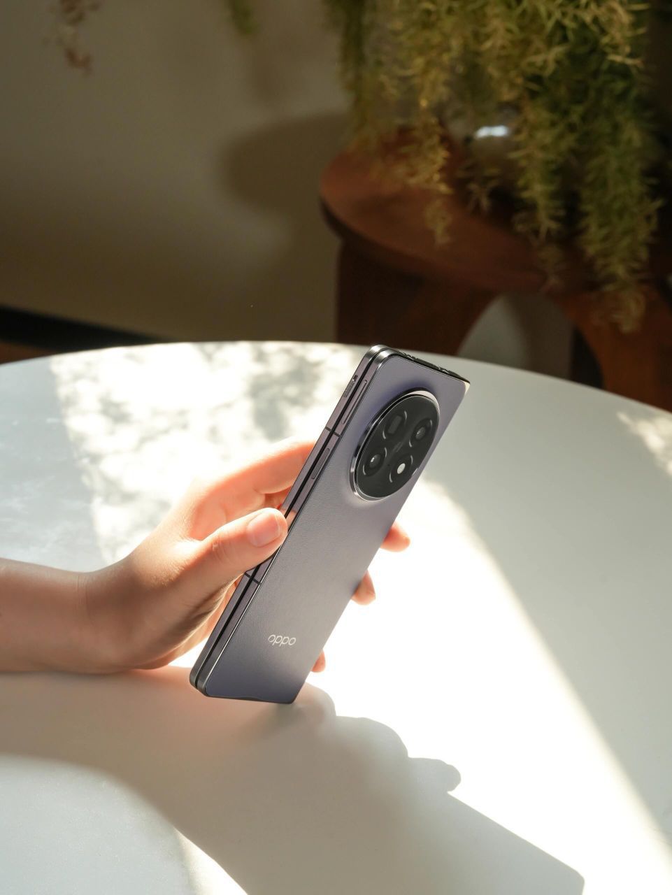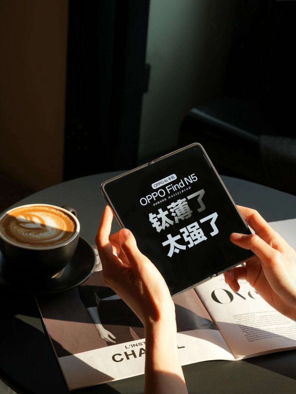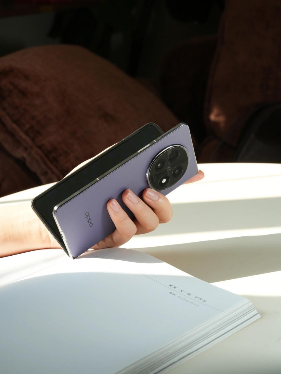 OPPO Find N5上手图来啦 ,突破折叠屏的厚重界限,以精湛工艺打造轻盈机身,随身携带无负担。机身超轻超薄,可以一手掌控,是适合女性用户的大折叠。 暮紫皮纹背板,质感满满,好看耐看!每一次开合,都仿佛在翻阅一本精致皮面书籍,优雅从容,爱不释手。