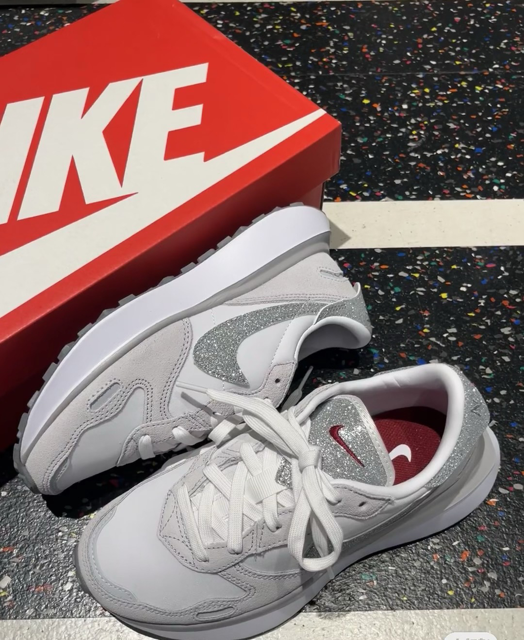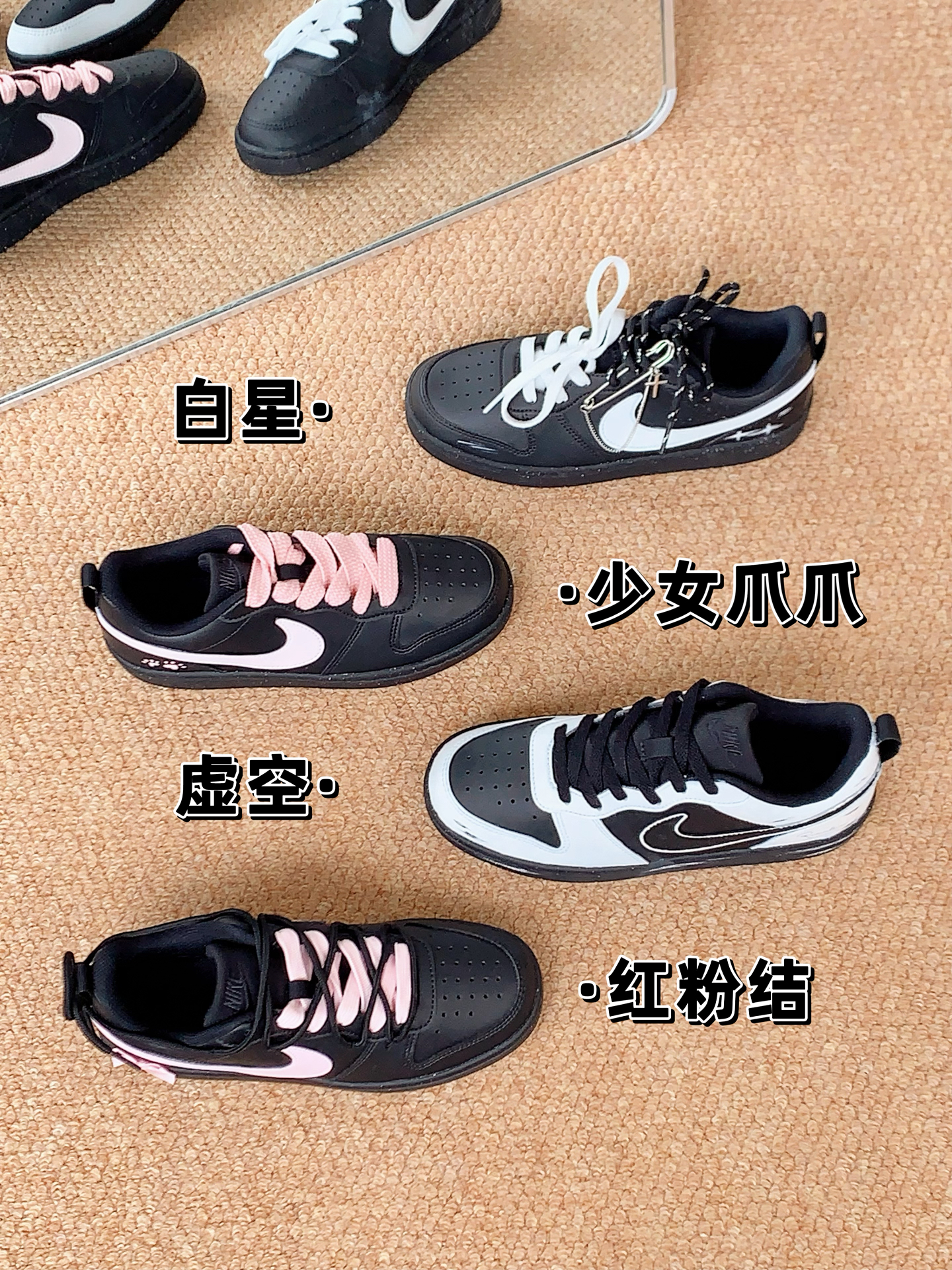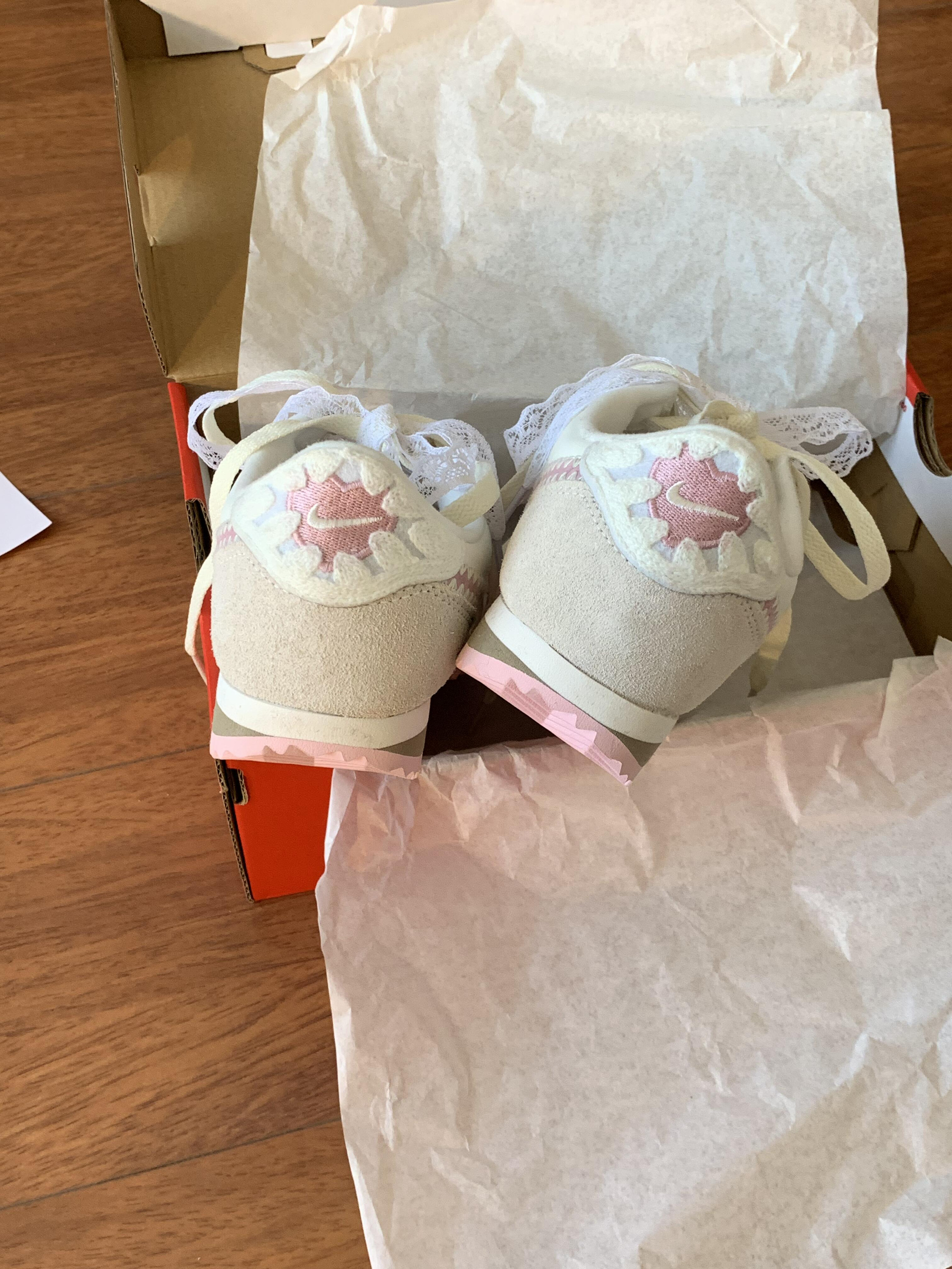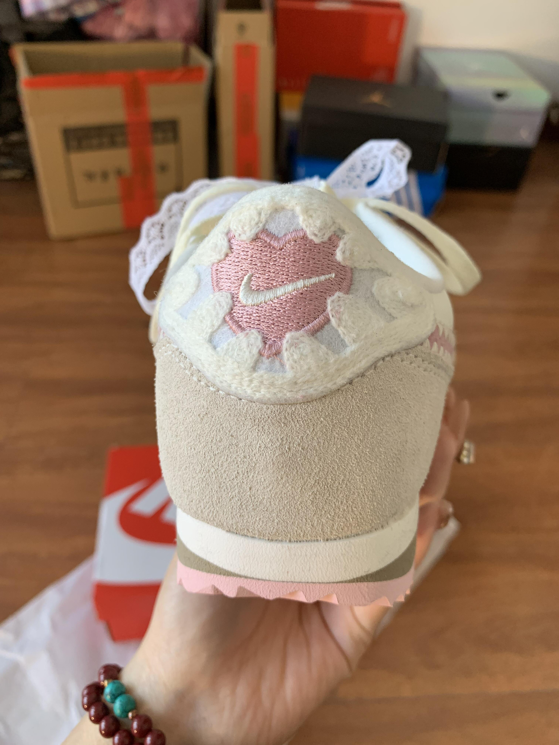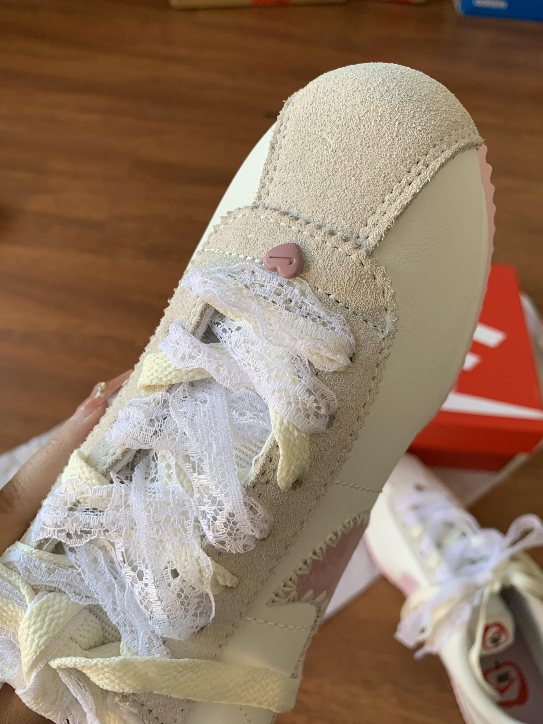 最后还是选择留下了nike的情人节限定阿甘鞋 很喜欢鞋后跟 配上我买的蕾丝鞋带绝了哈哈哈