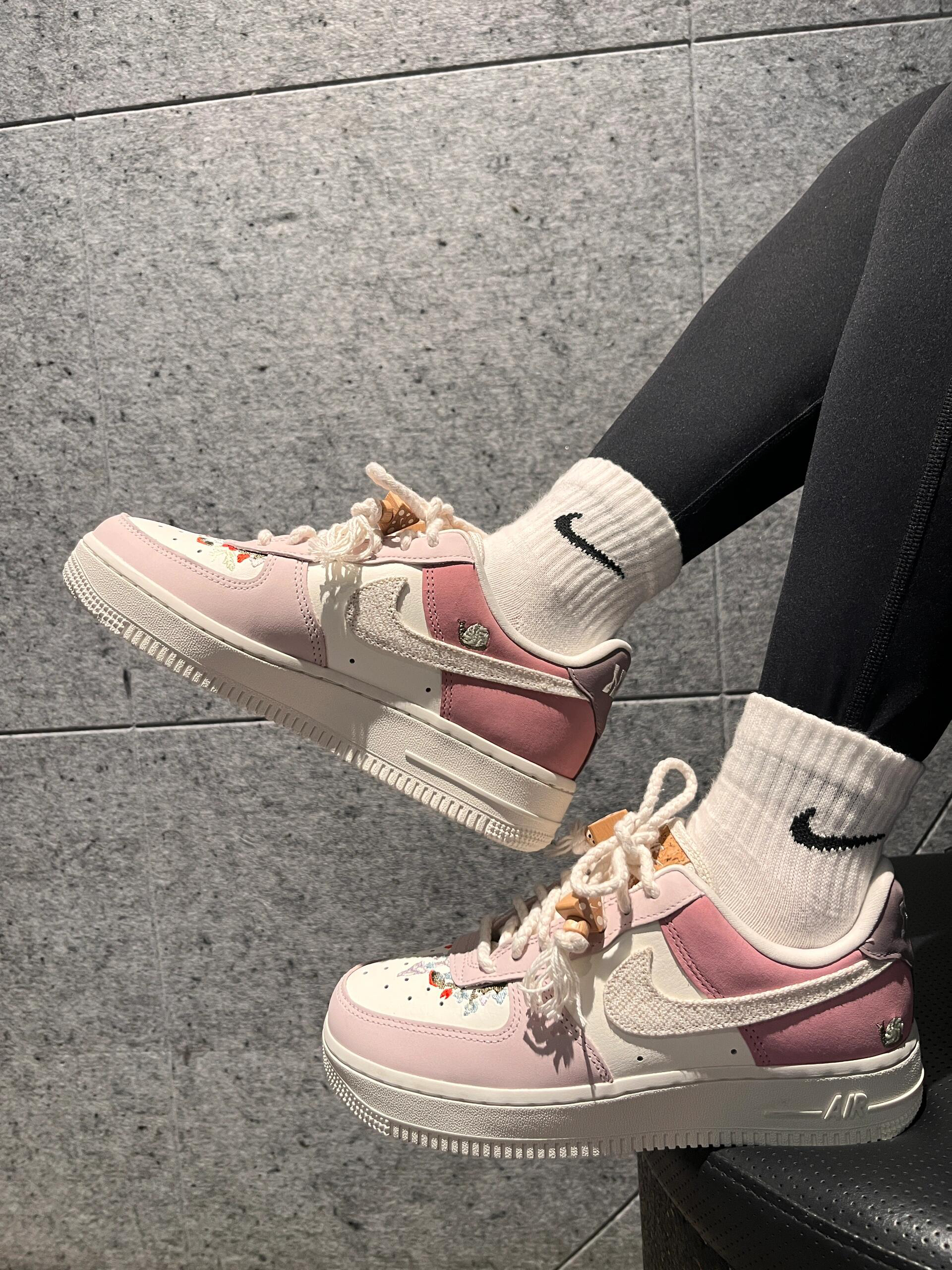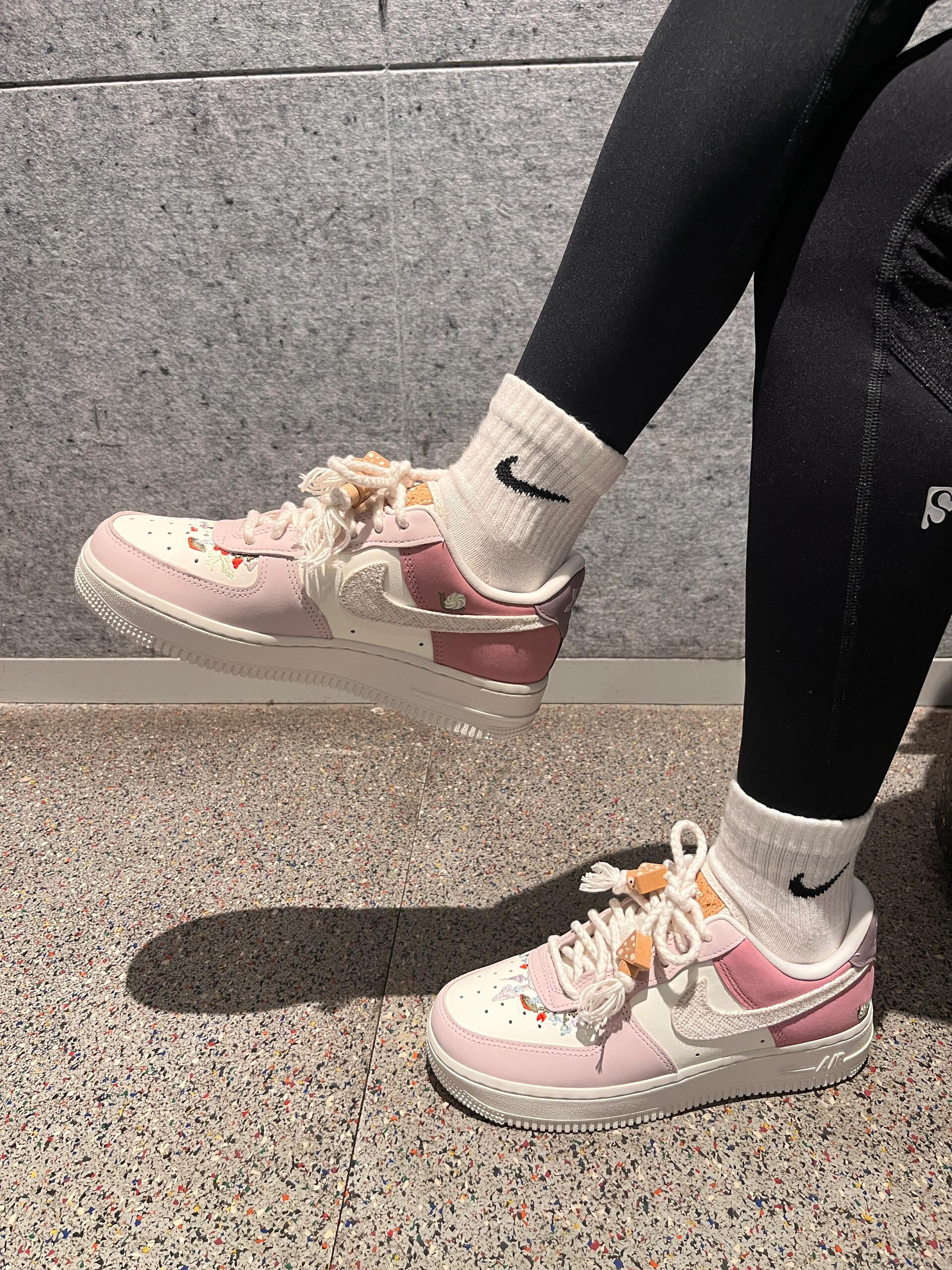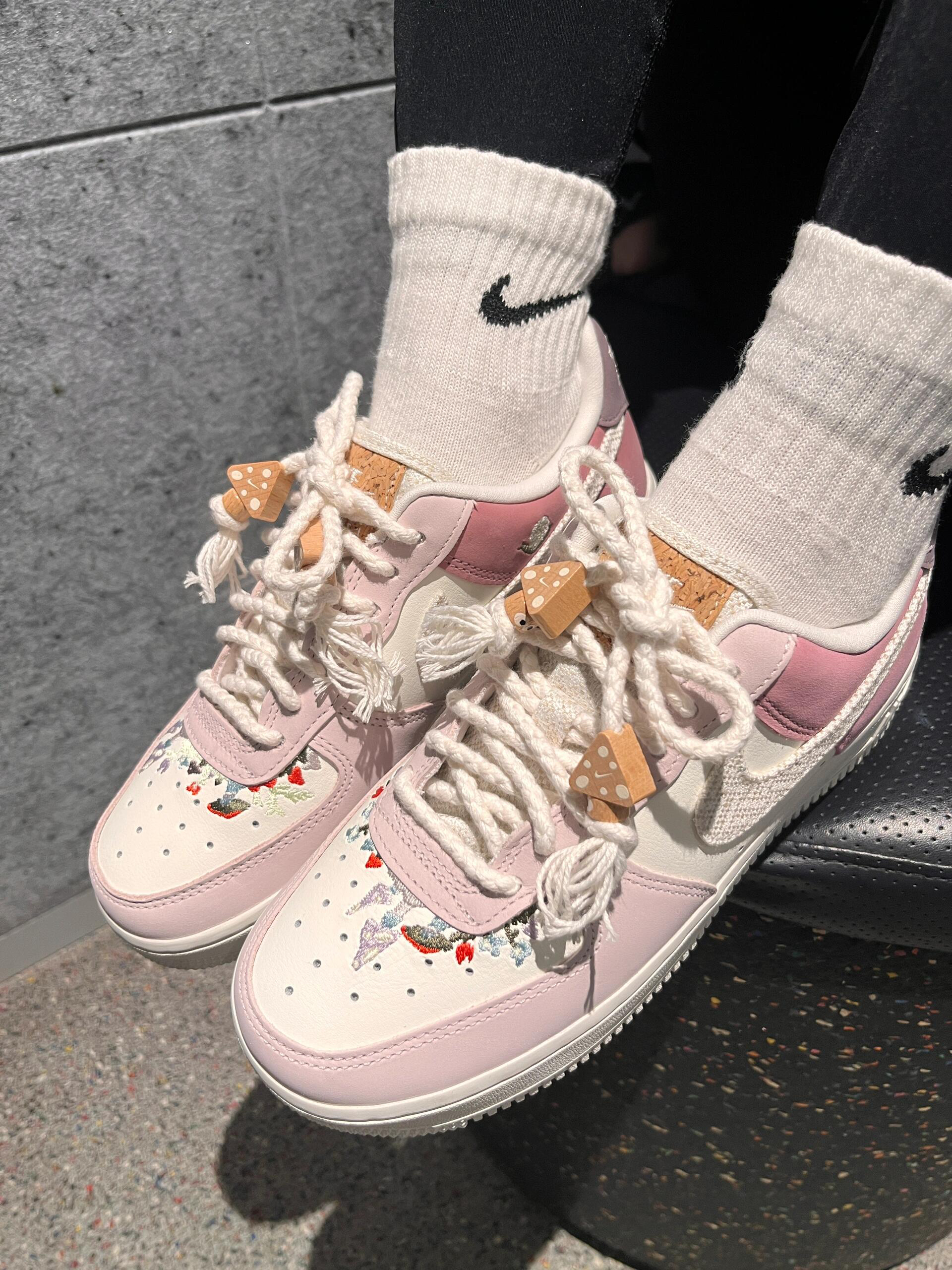空军一号竟藏魔法小蘑菇!🥰 鞋带处的手工刺绣小蘑菇是最大亮点✨ 每颗蘑菇的菌伞纹路都不同,搭配🌸樱花粉渐变配色,像是把童话森林穿在🦶上。 搭配白纱裙➕牛仔裤子👖~甜酷感直接拉满