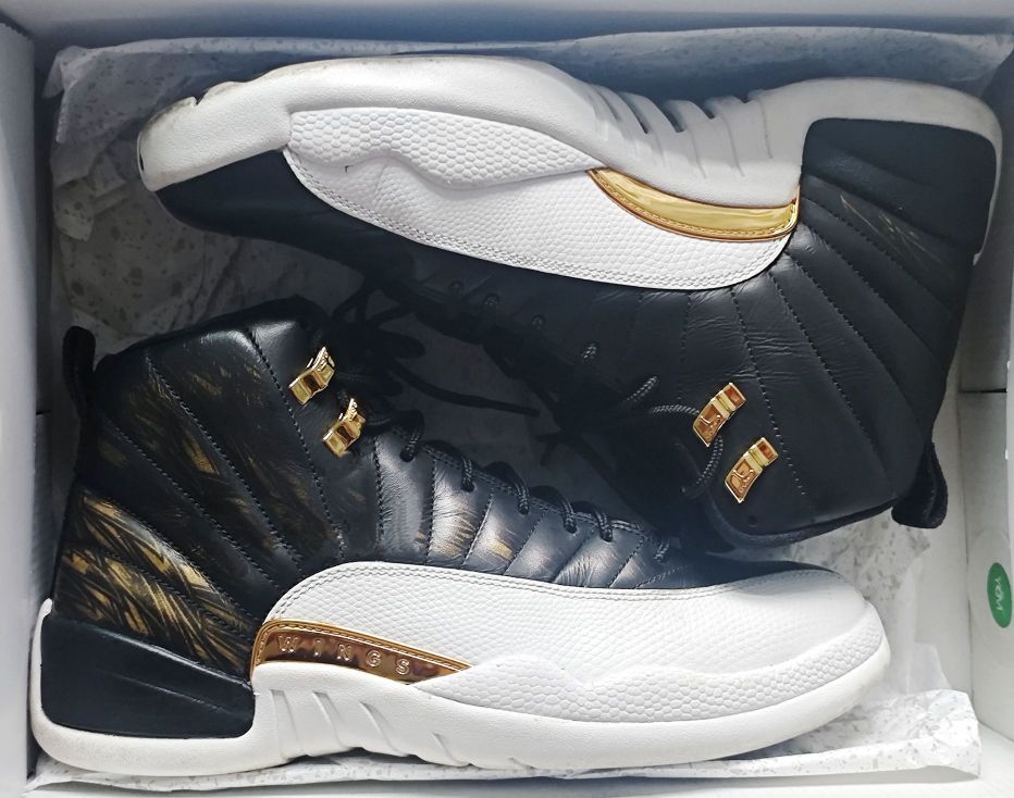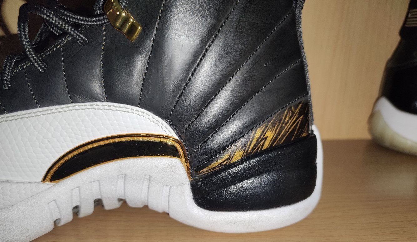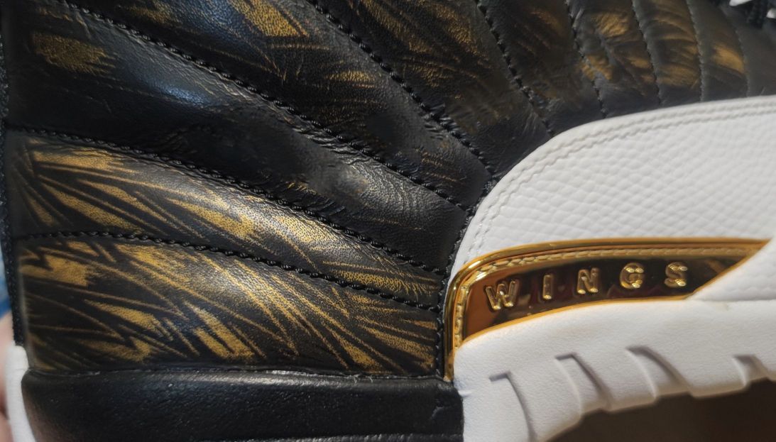 这双鞋最大的特点就是鞋面黑色部分可以用酒精擦除,擦除后会显露出金色翅膀纹路的图案,这种图案在鞋垫上也有体现,配色方面鞋面分色比较接近季后赛配色,但内外侧tpu片和最上面的两对鞋带扣换成了电镀金色的版本,这双鞋有着限量12000双的货量,但其实购买难度并不是很大,目前大部分尺码都在3000左右,整体鞋型我个人比较喜欢,后续发手里其他乔12配色的时候会一起对比下 由于买回来没怎么穿过所以也没刮开多少...